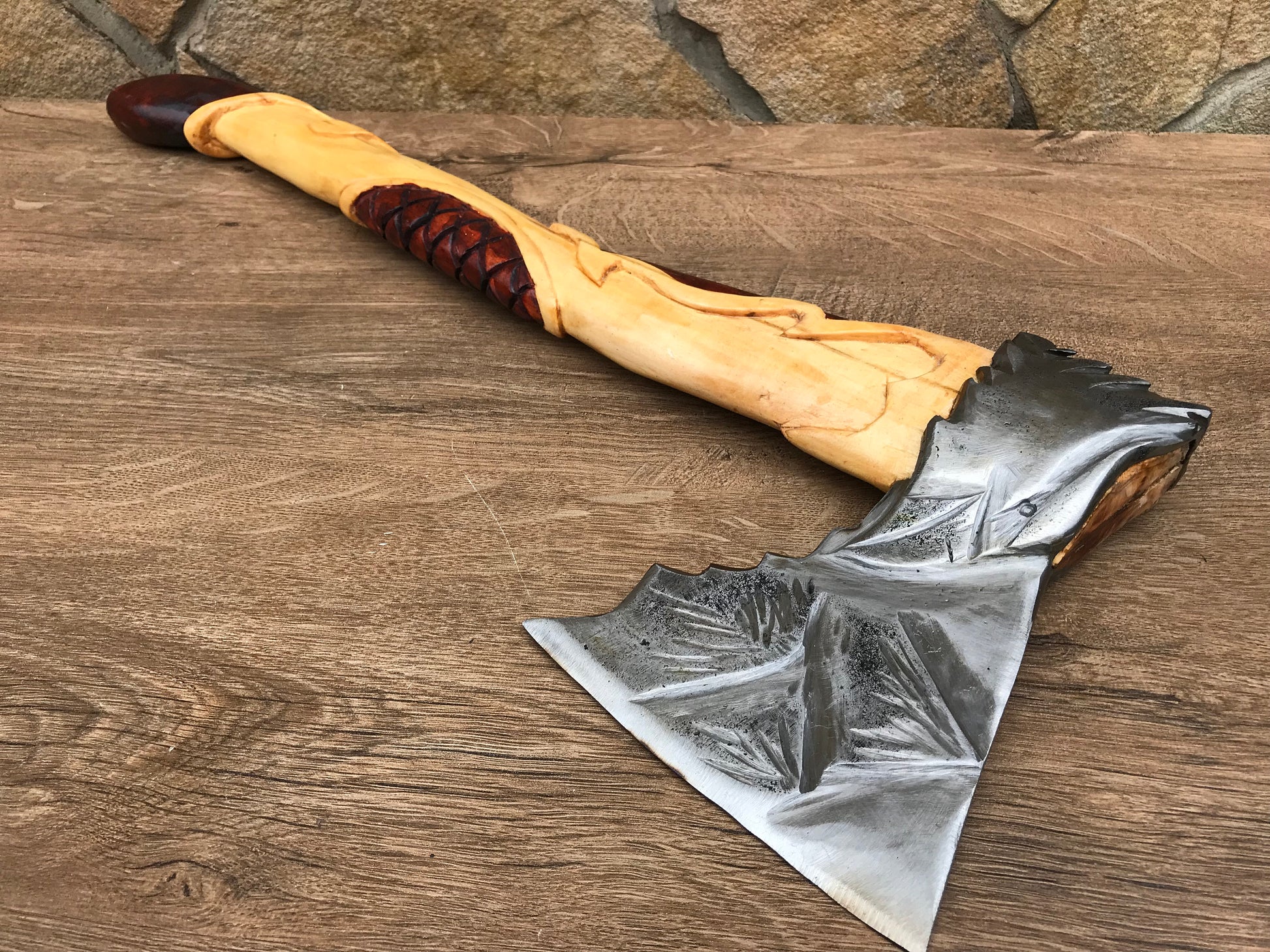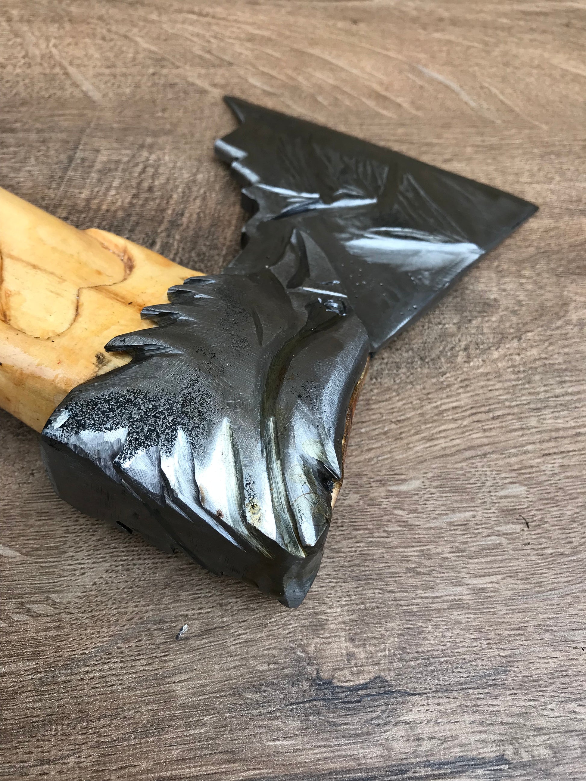 There is an eagle head and mountains on the axe head which make it beautiful!