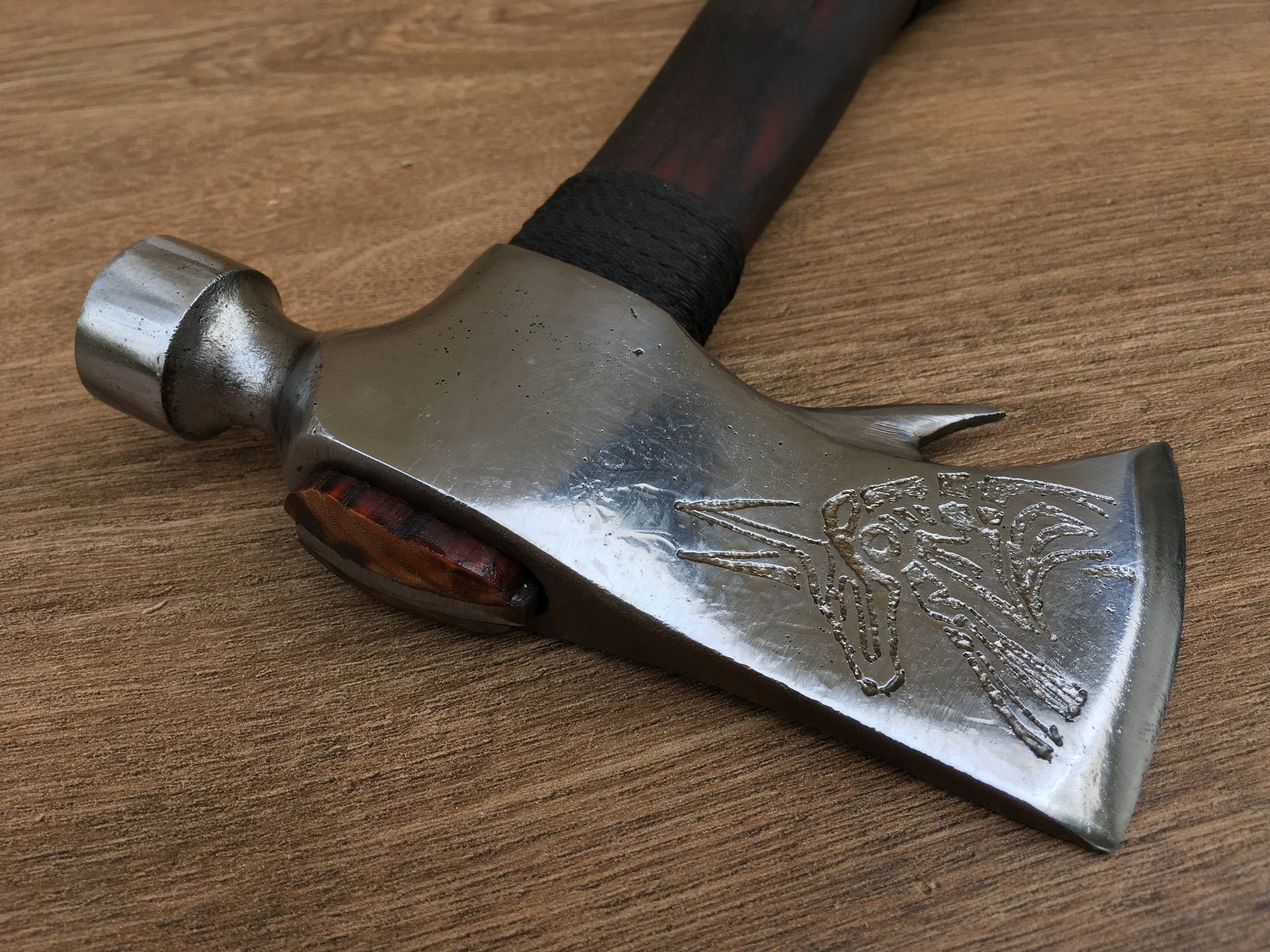 A compact outdoors axe, engraved with Egyptian guard , hand-forged and made from carbon steel using traditional blacksmith methods. The steel is stuck several times, increasing its density and thereby the durability of the axe. Perfect for packing in a rucksack, the axe can also be worn on a belt. It will be a perfect companion in your ventures through the wilds, through the woods of the pacific northwest, or at the cabin to make kindling to warm your hearthside. It has a wooden stump.