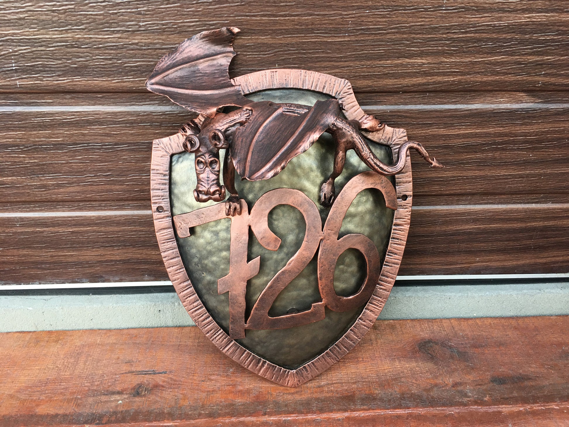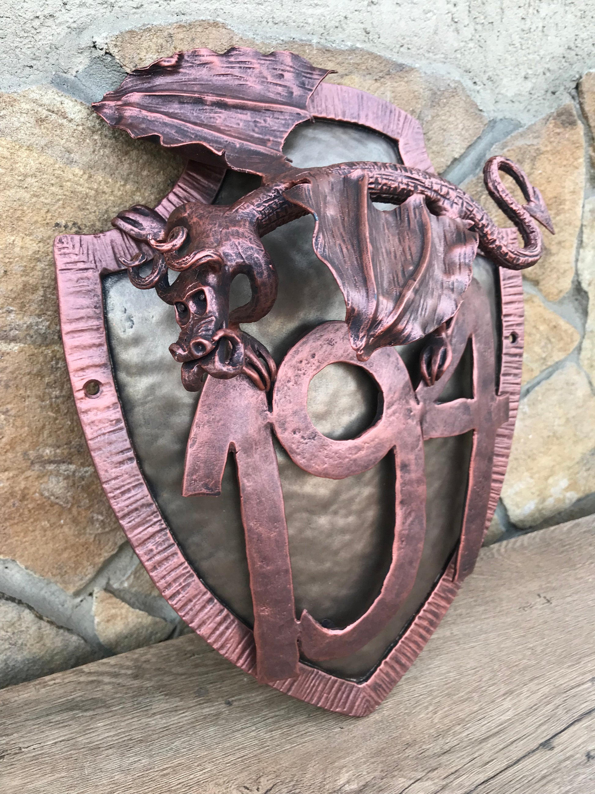 Here is a hand forged house number sign which gives much more beauty to your house and outlines its the exterior features. It is done in a view of a shield with a small dragon on it. Numbers are nicely forged! It is handmade, art forged.