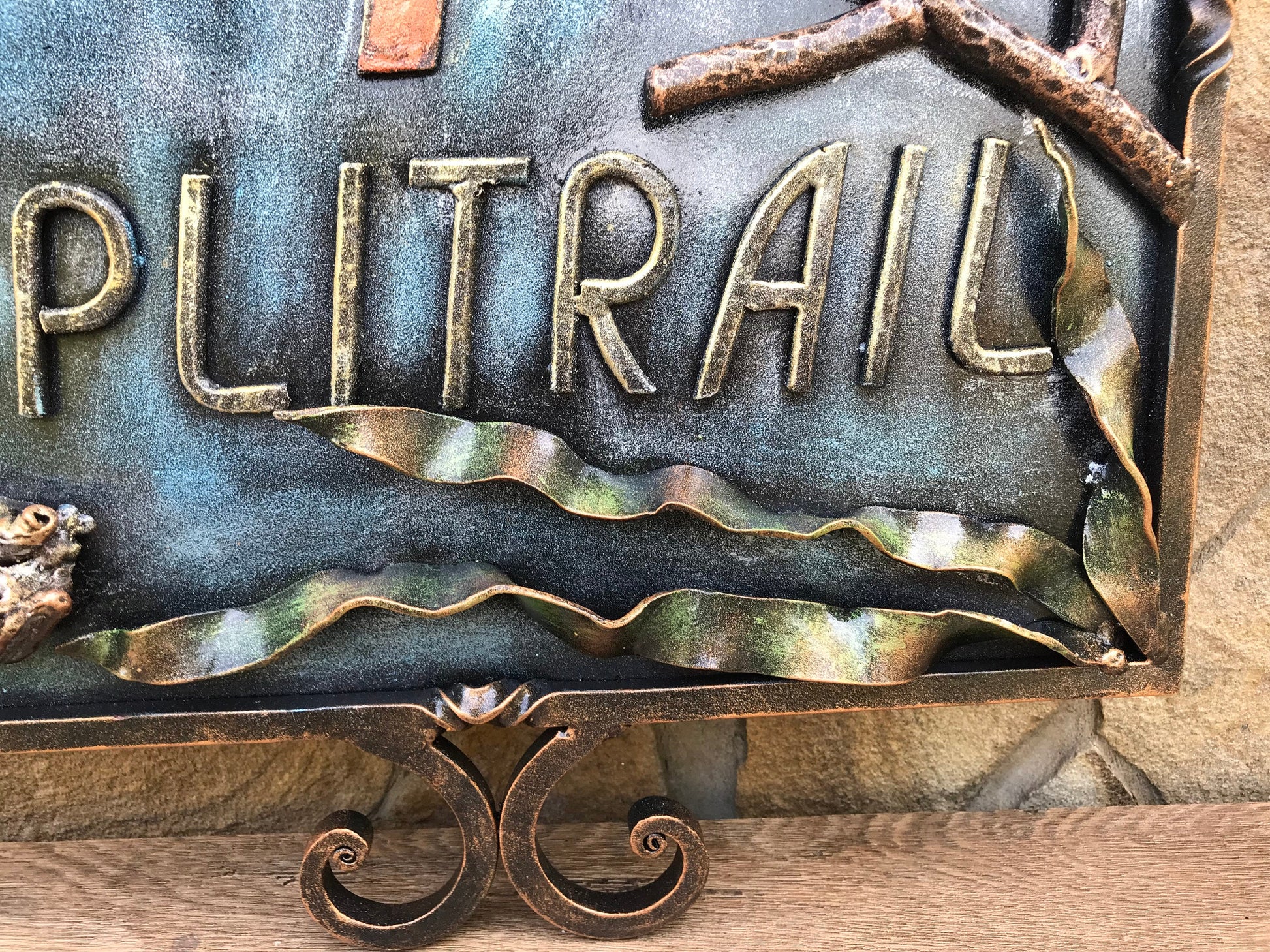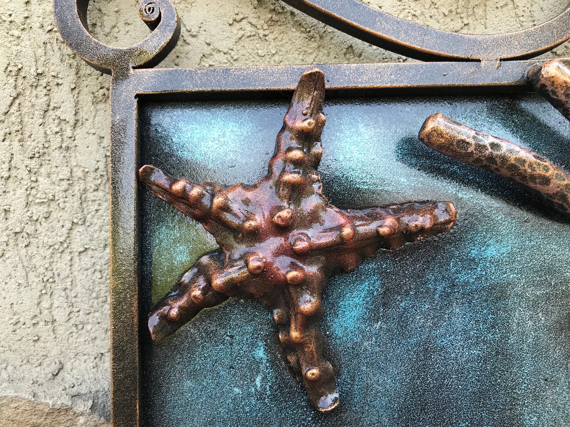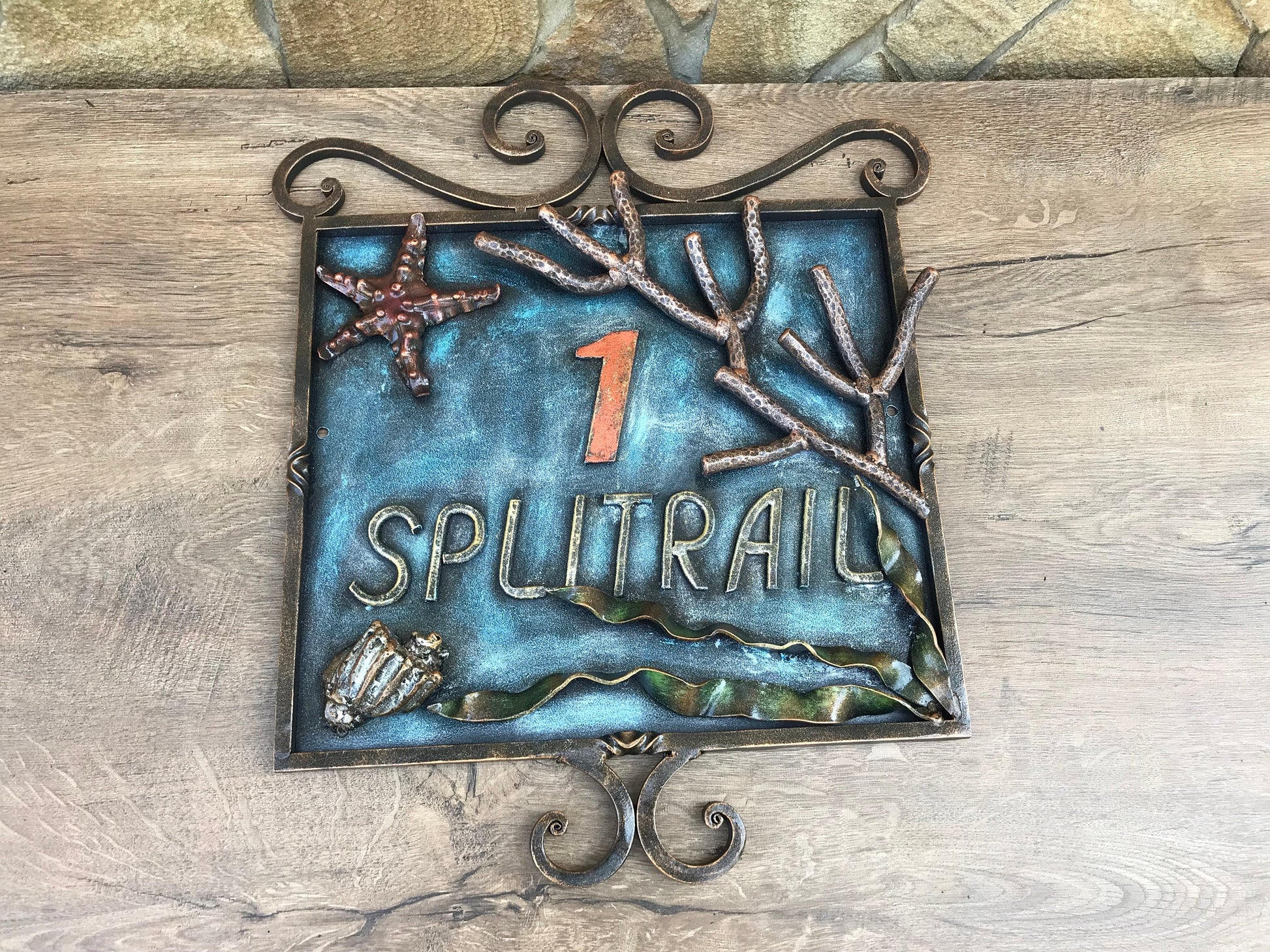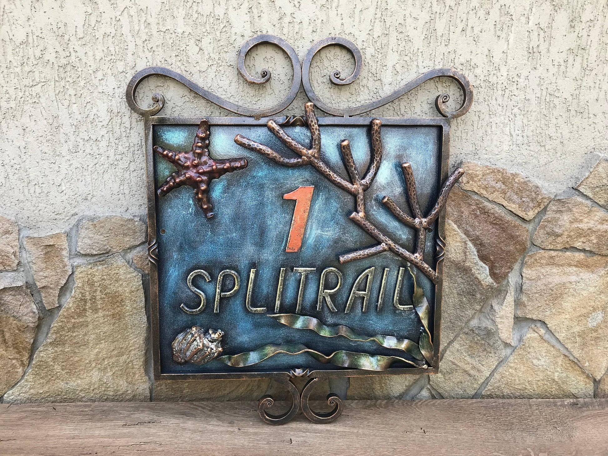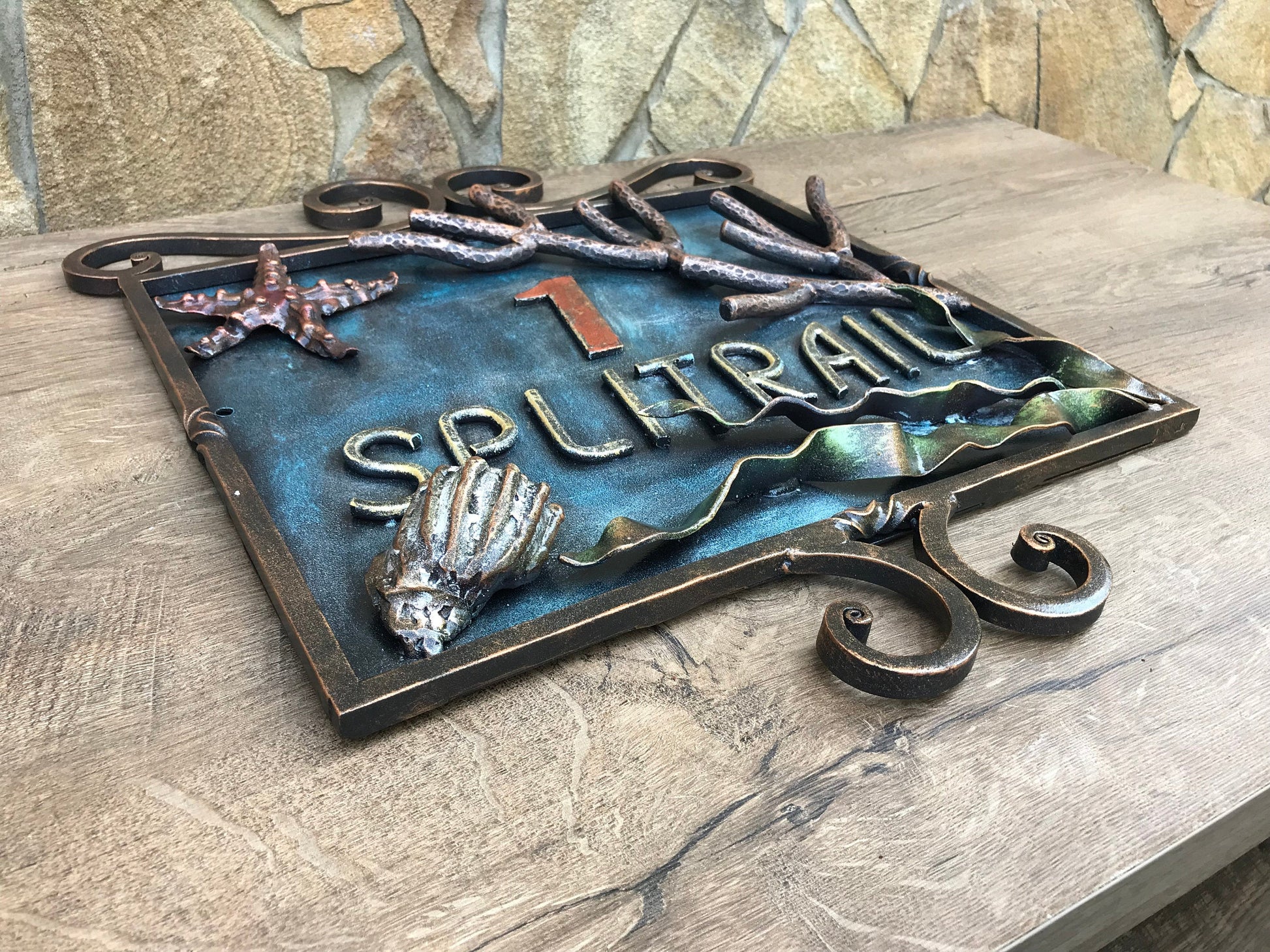 Here is a hand forged house number sign which gives much more beauty to your house and outlines its the exterior features. It is done in a view of a sea/ocean theme including the following elements: a starfish, seaweeds, a shell, a coral, with adding nice scrolls. Numbers are nicely forged! It is made in the technique of the artistic forging.