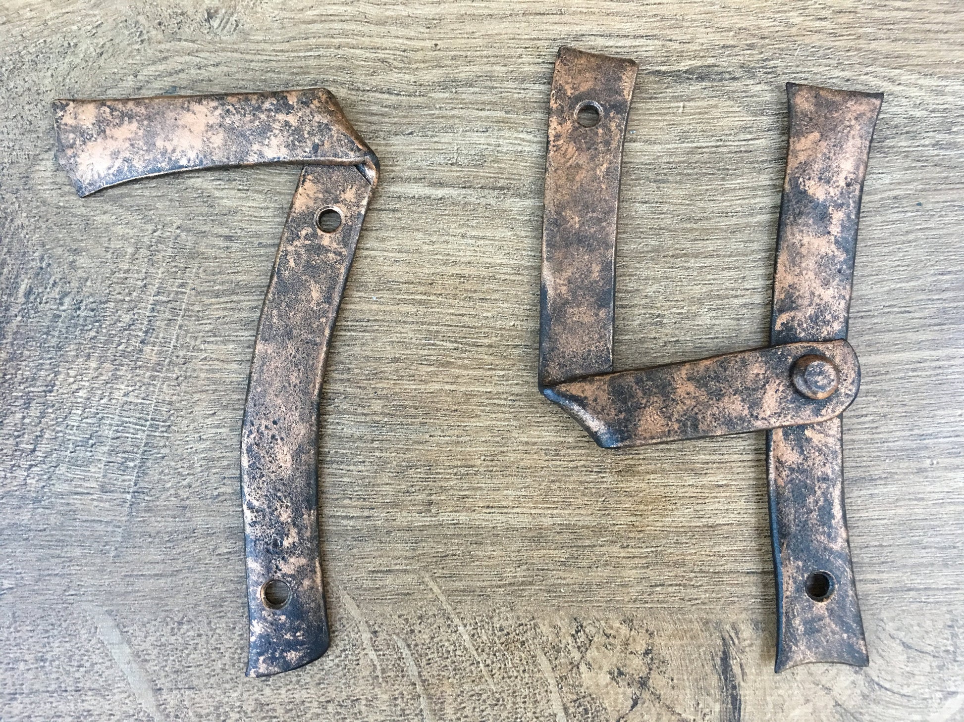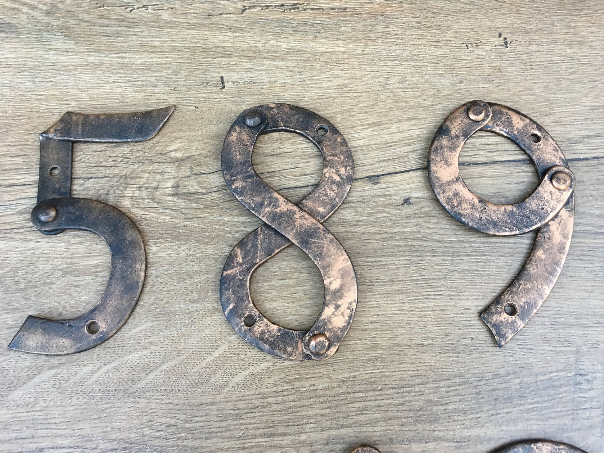 Here are hand forged house numbers in a rustic style which gives much more beauty to your house and outlines its the exterior features. It is done very artistically. Numbers are nicely forged! It is handmade, art forged. Each number has two wholes to screw it to a wall.