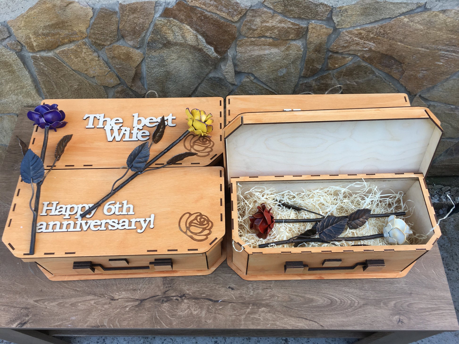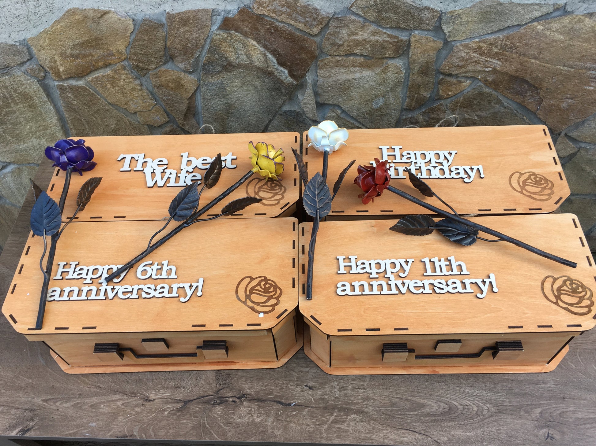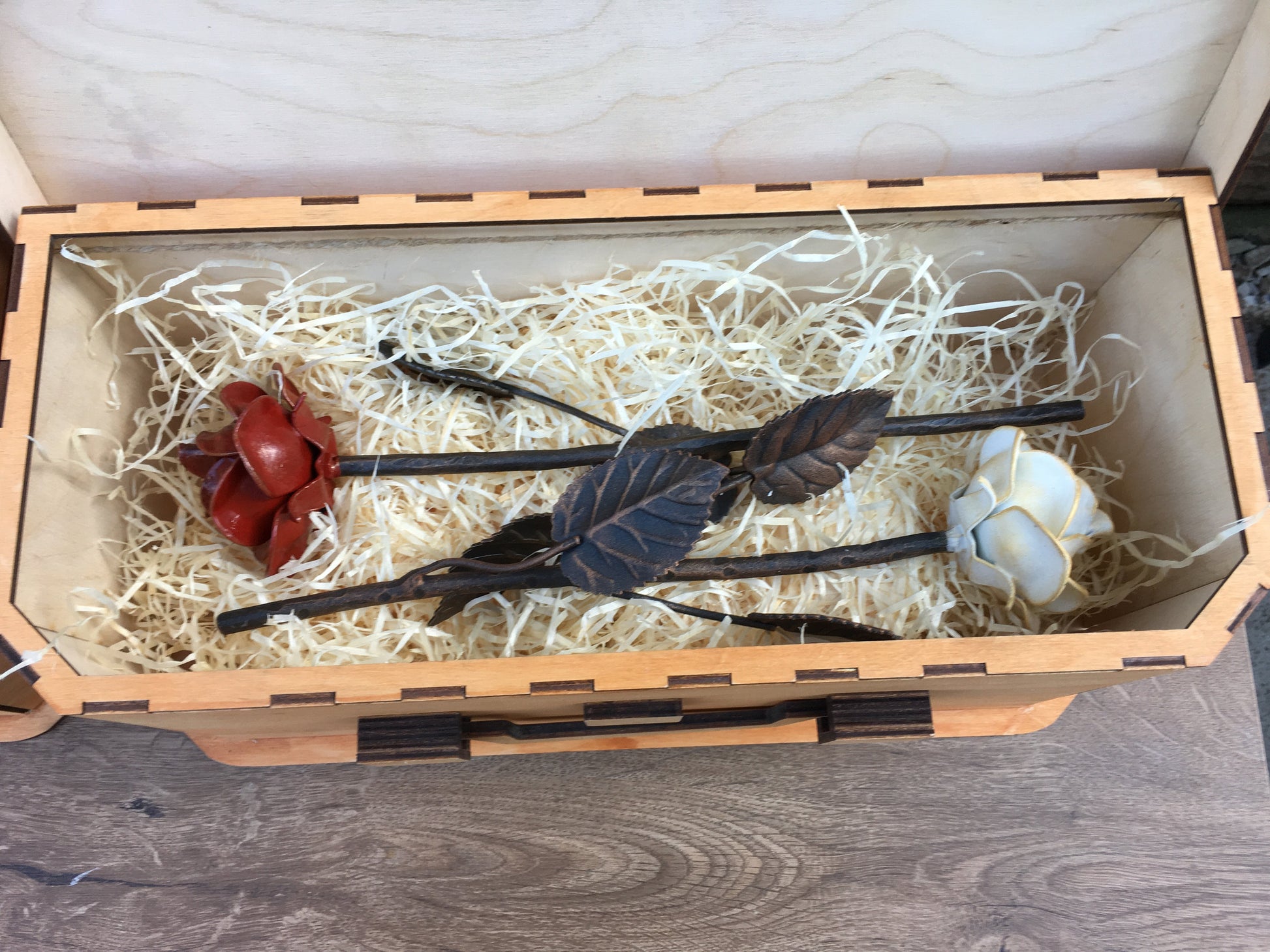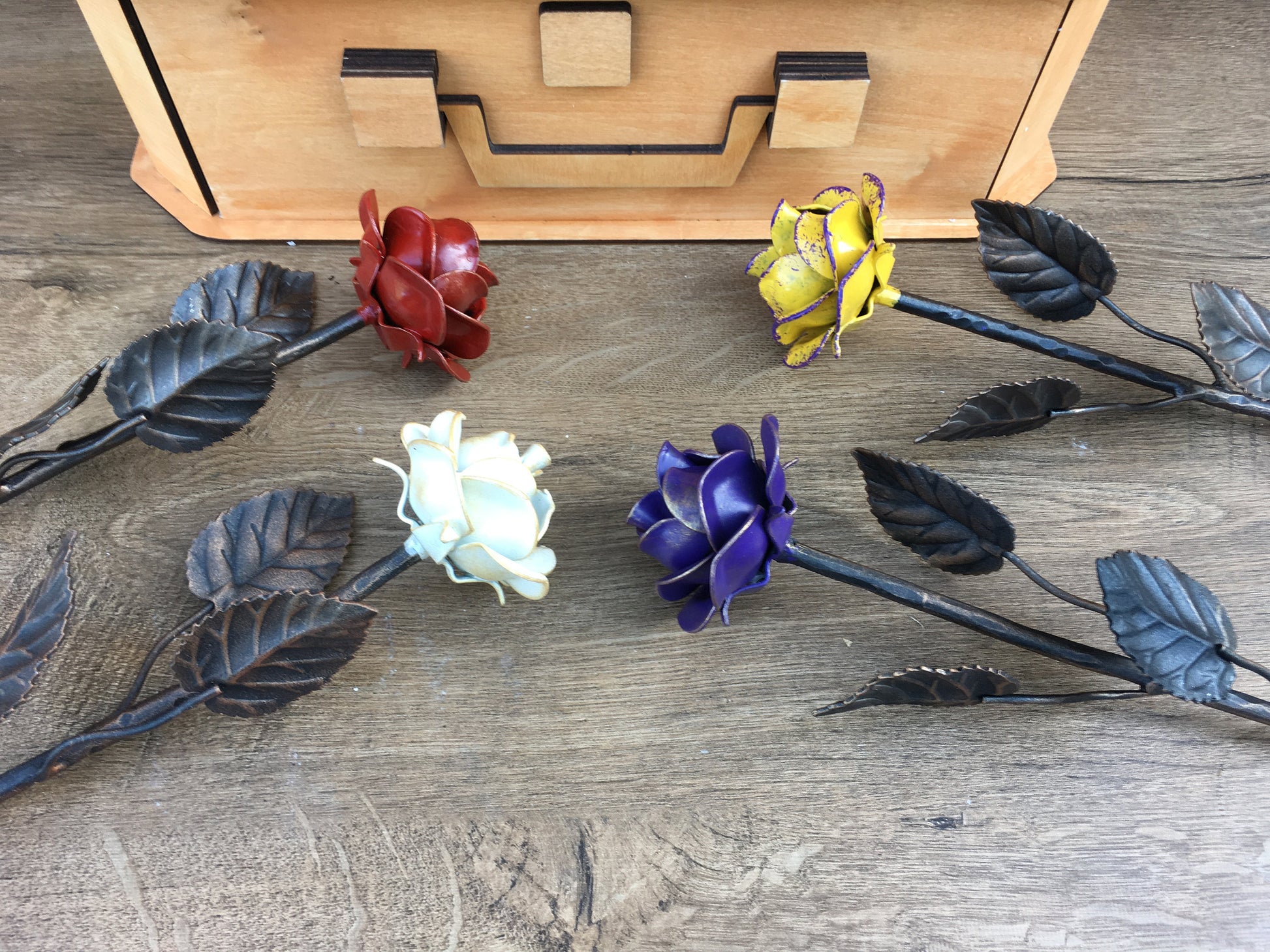 Here is a hand forged rose (you choose the color) in a wooden gift box with the inscription: