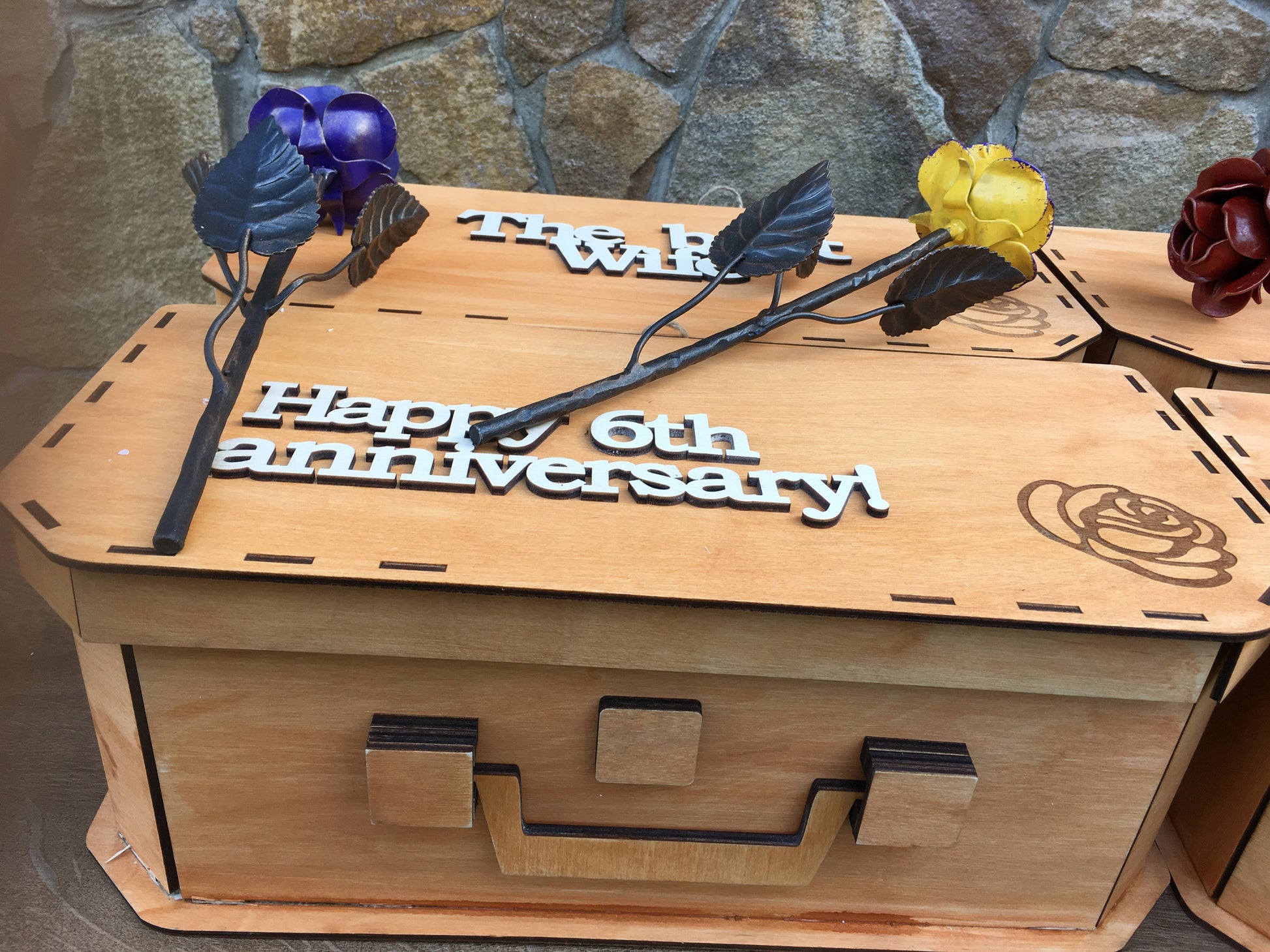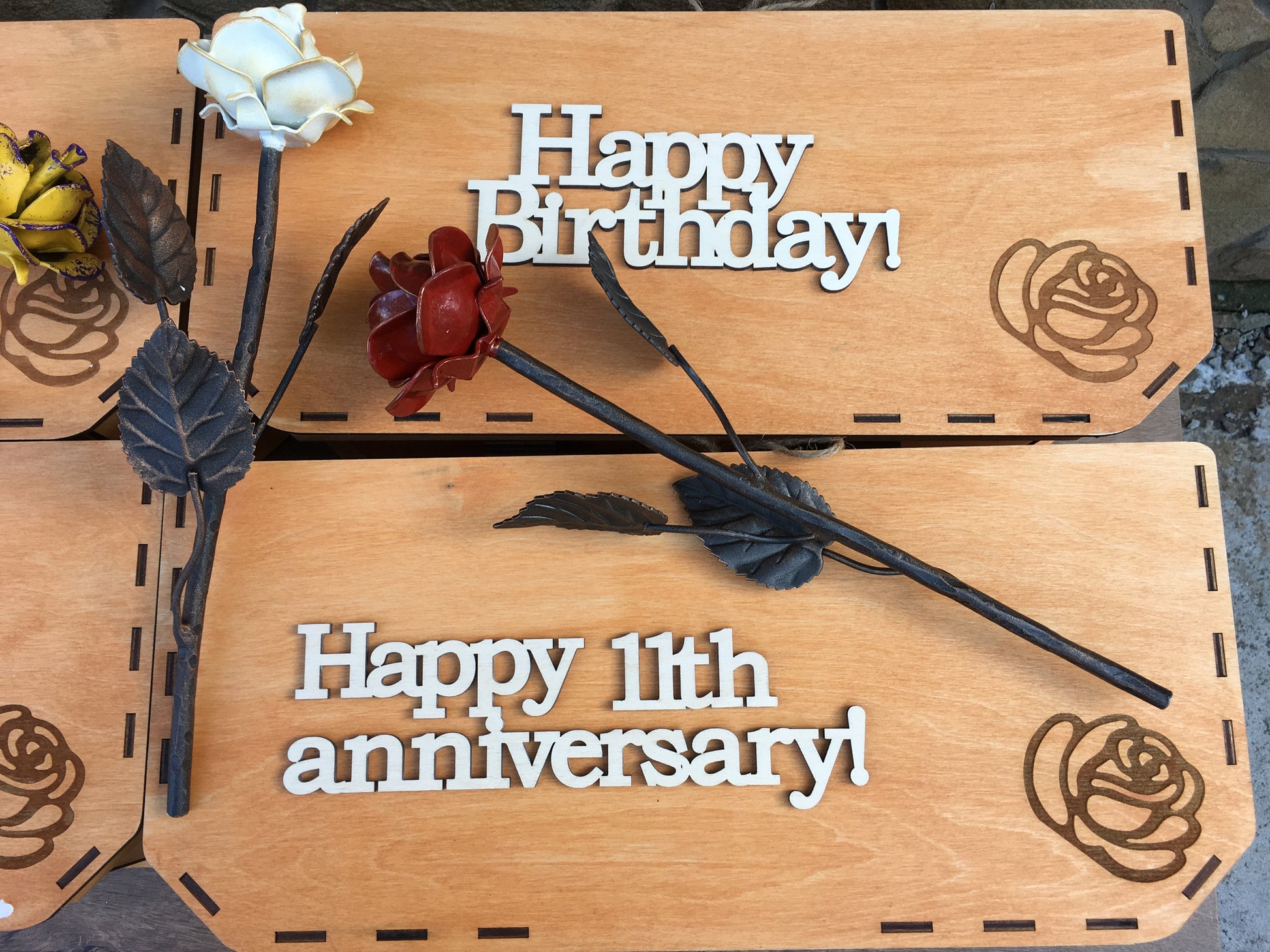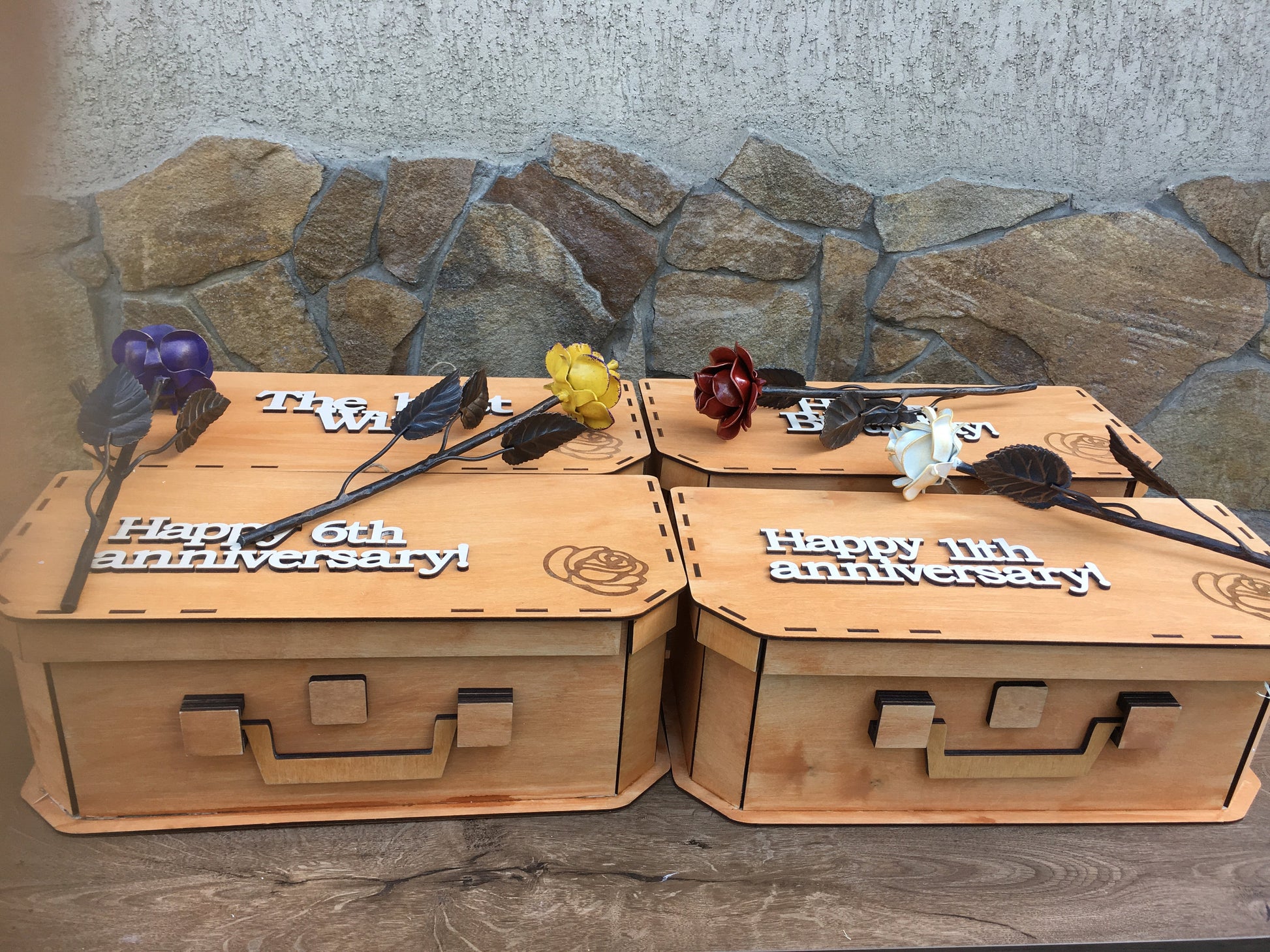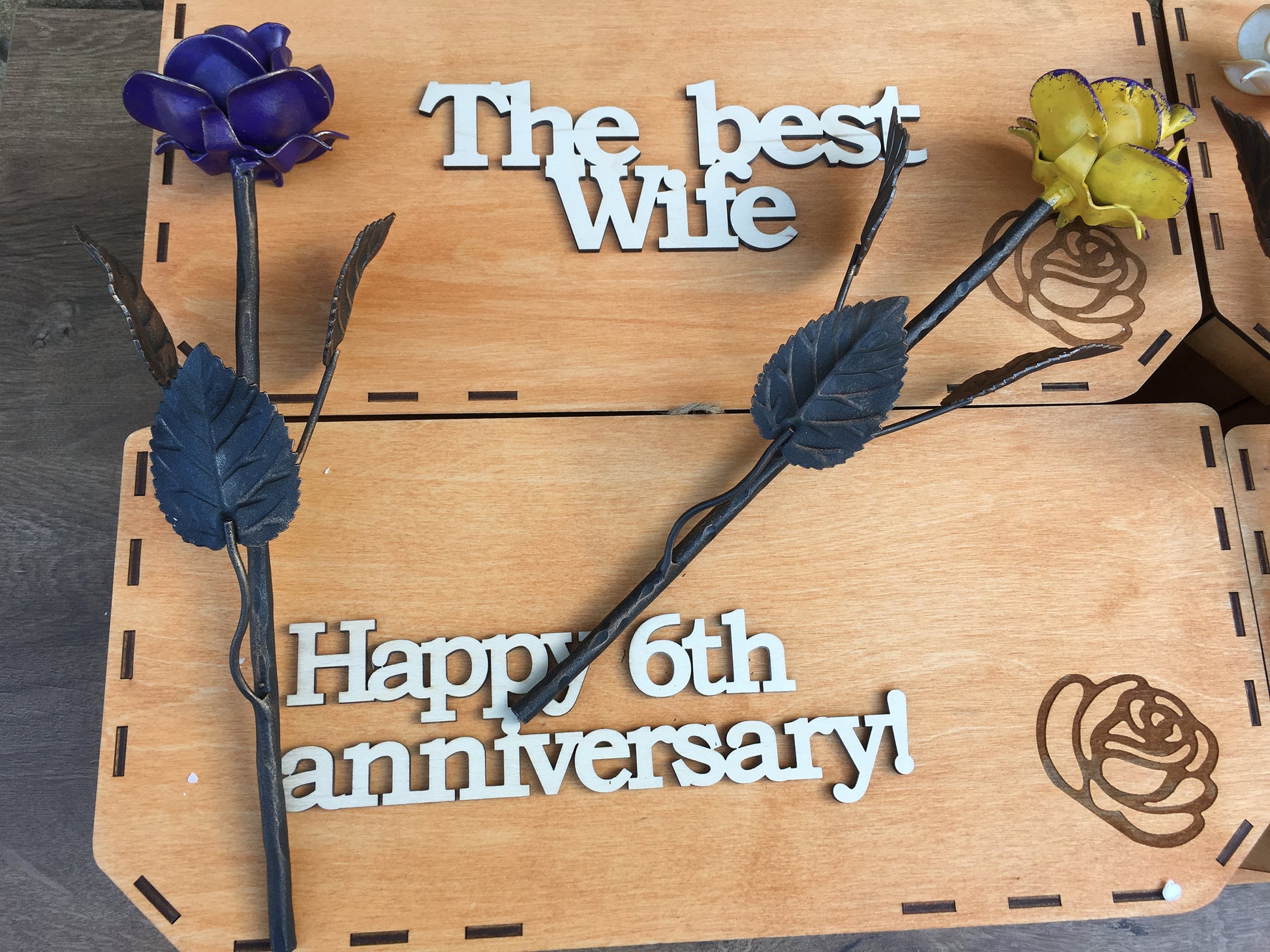 Here is a hand forged rose (you choose the color) in a wooden gift box with the inscription: