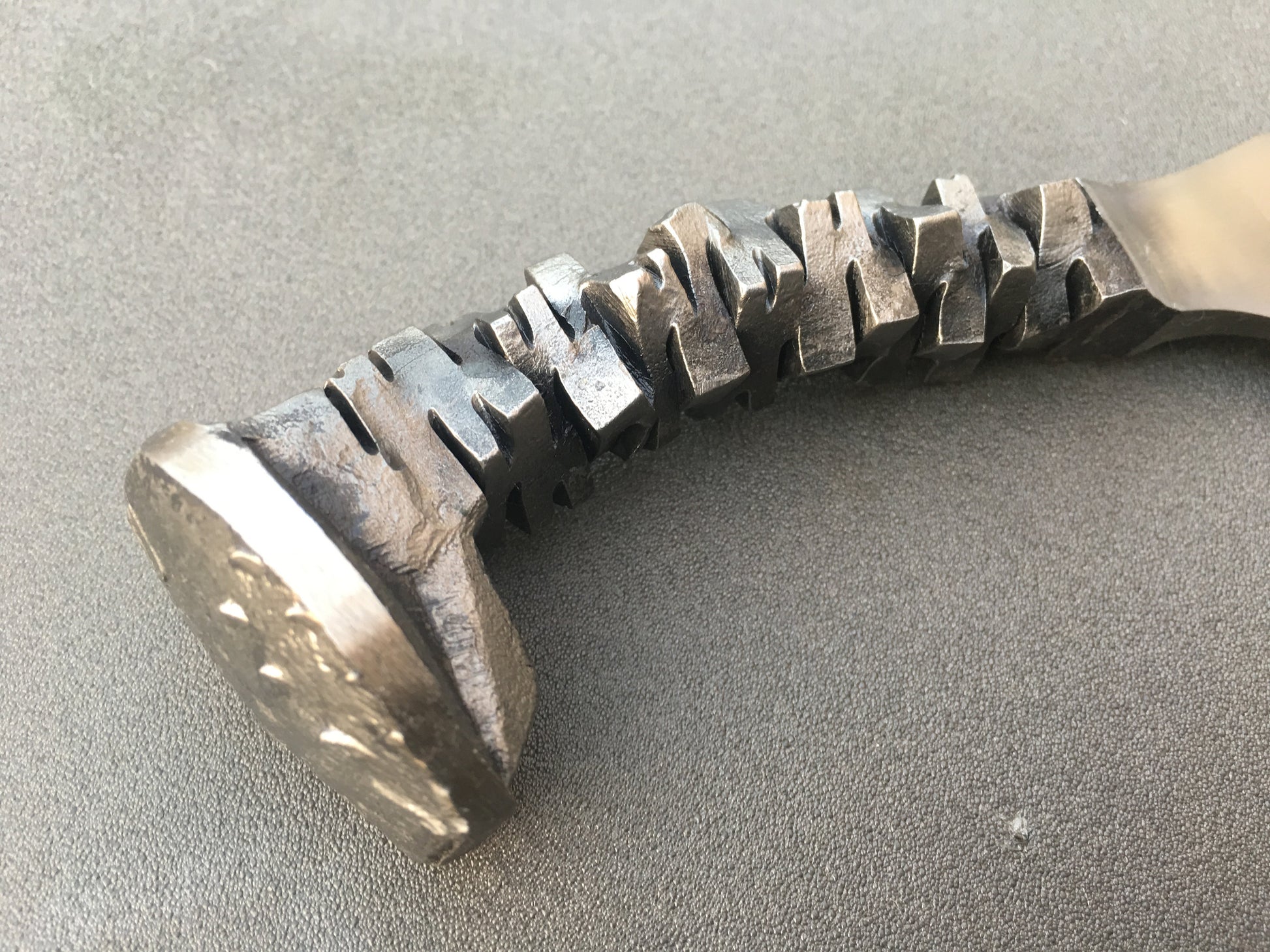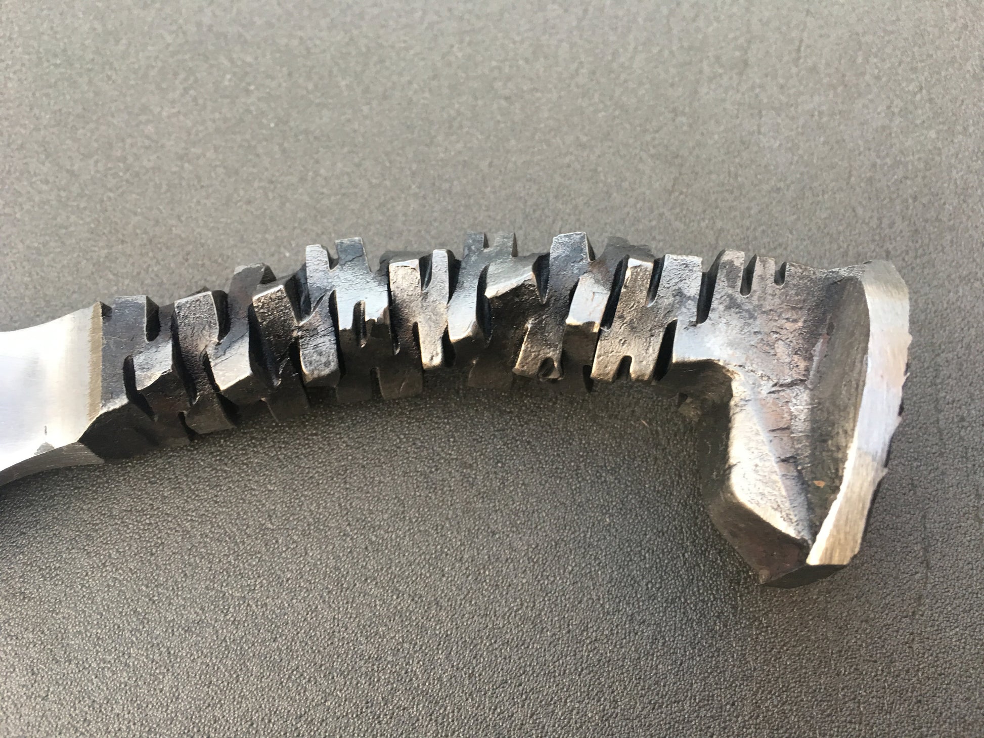 Railway nail is 100% forged by hand and hammer. The knife blade is of hardened steel and it is very hard, the knife is sharpened. Knife is partly polished to highlight steel deep metallic luster. Each knife is unique and unrepeatable.
