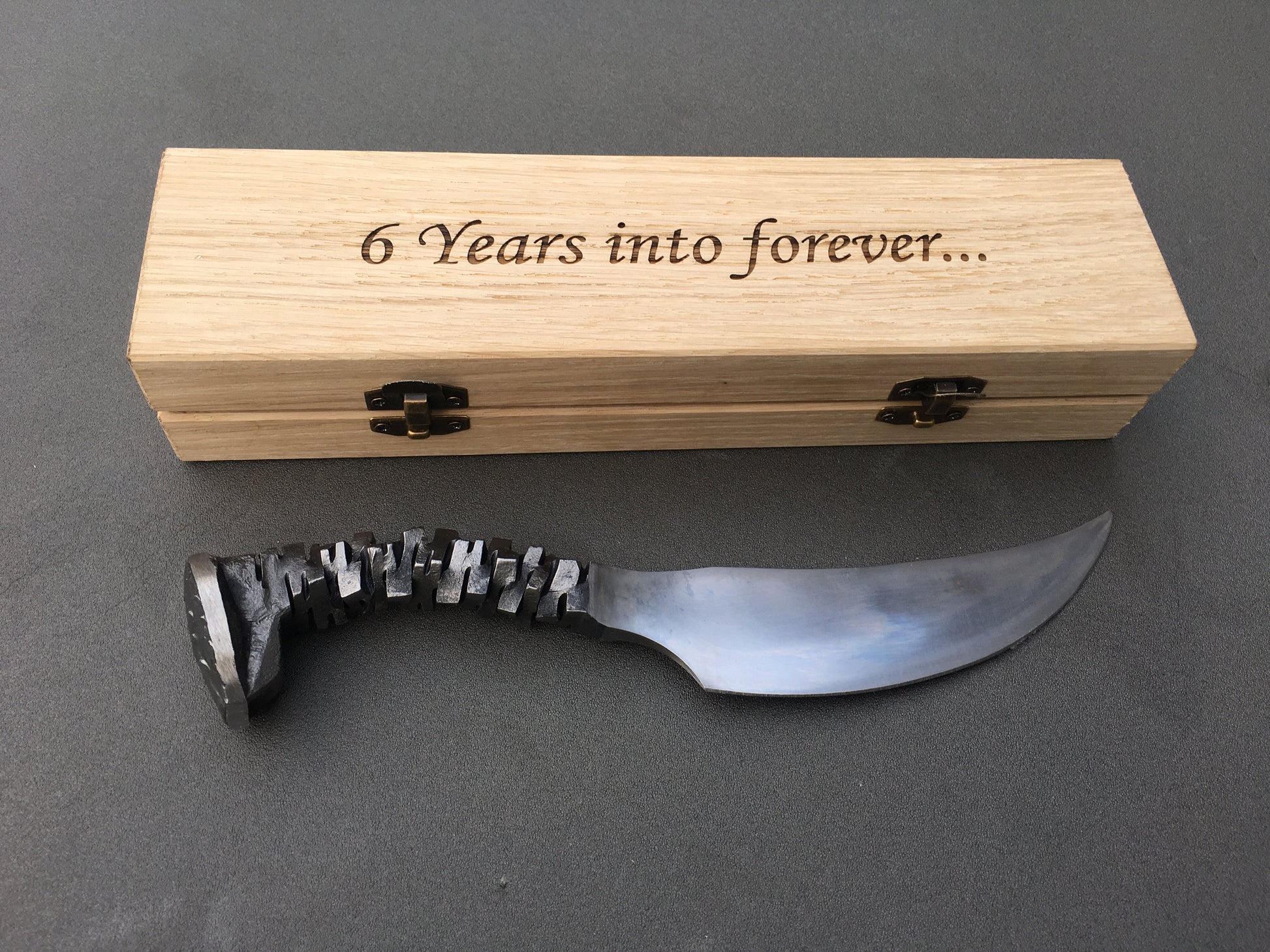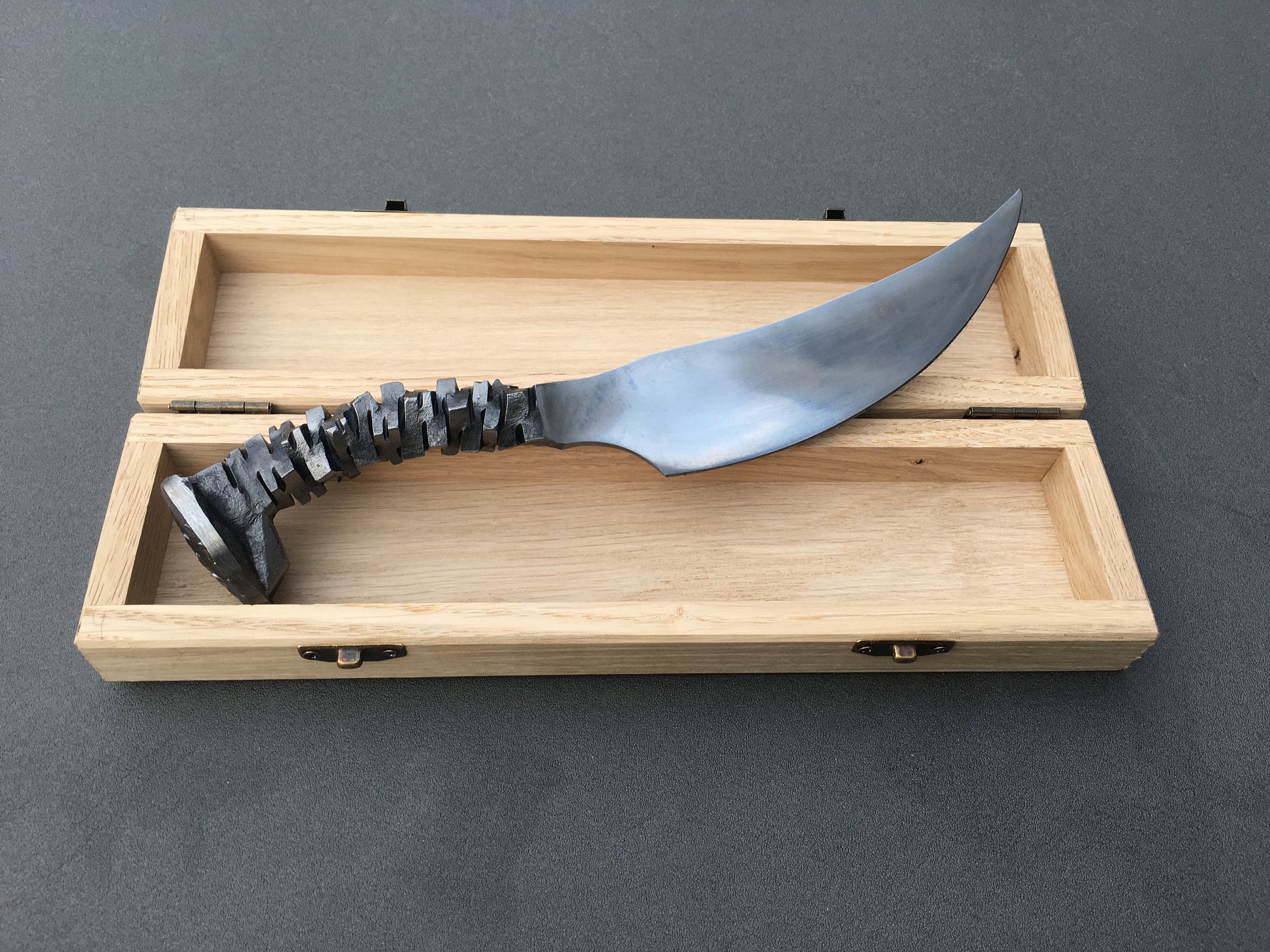 Here is a hand forged knife (a curved handle - in a view of twisted small rectangular surface texture and a curved blade) in a wooden box (casket). This is a great groomsmen gift, corporate gift, usher gift, groom gift, father of the bride gift, 6th anniversary gift (iron year), 11th anniversary gift (steel year), Father's Day, Christmas gift for a grandfather, mens' birthday gift or for any other gifting occasion.