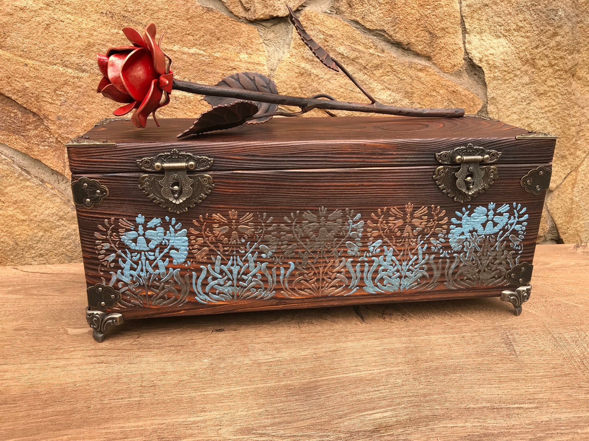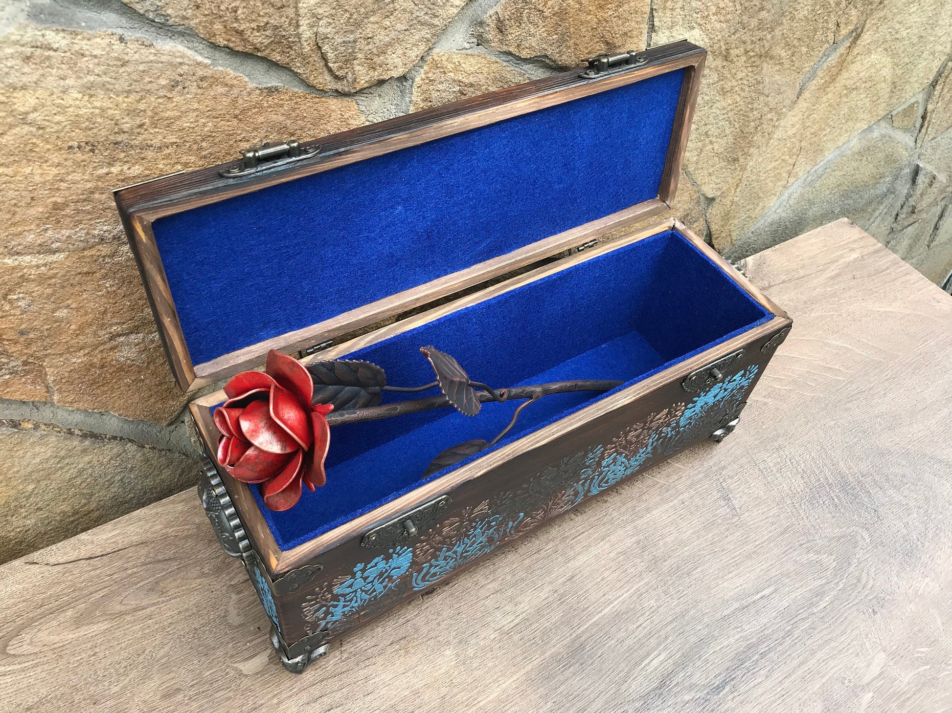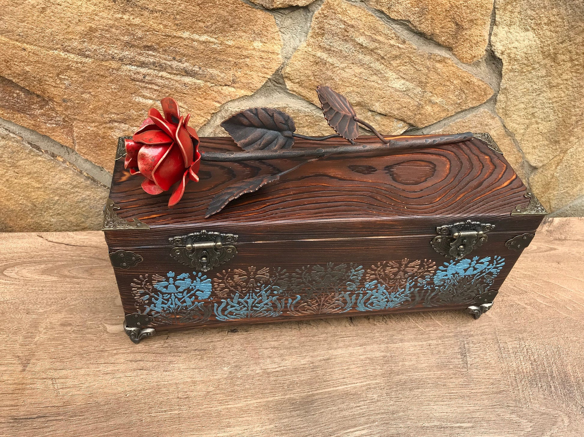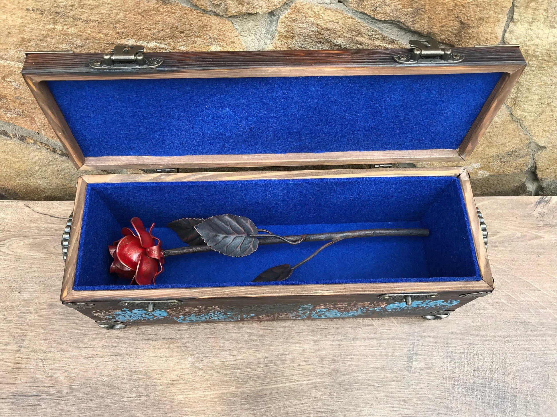 Are you looking for a gift on a wedding anniversary? Already 5th, 6th, 11th wedding anniversary? It is called "wood anniversary", "iron anniversary", "steel anniversary" and a wooden gift, iron gift, steel gift for this occasion will be justified. Here is a hand forged rose in a wooden box which could be a nice gift for your girl/woman. It looks very festive and decorative! It deserves to be a cool gift!