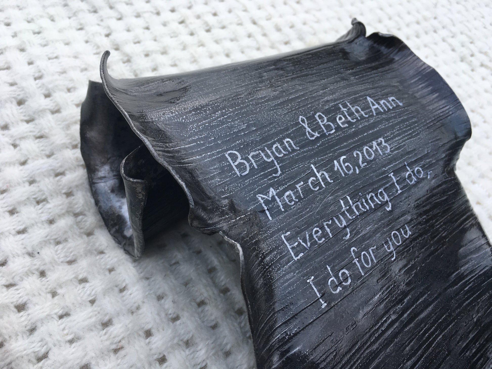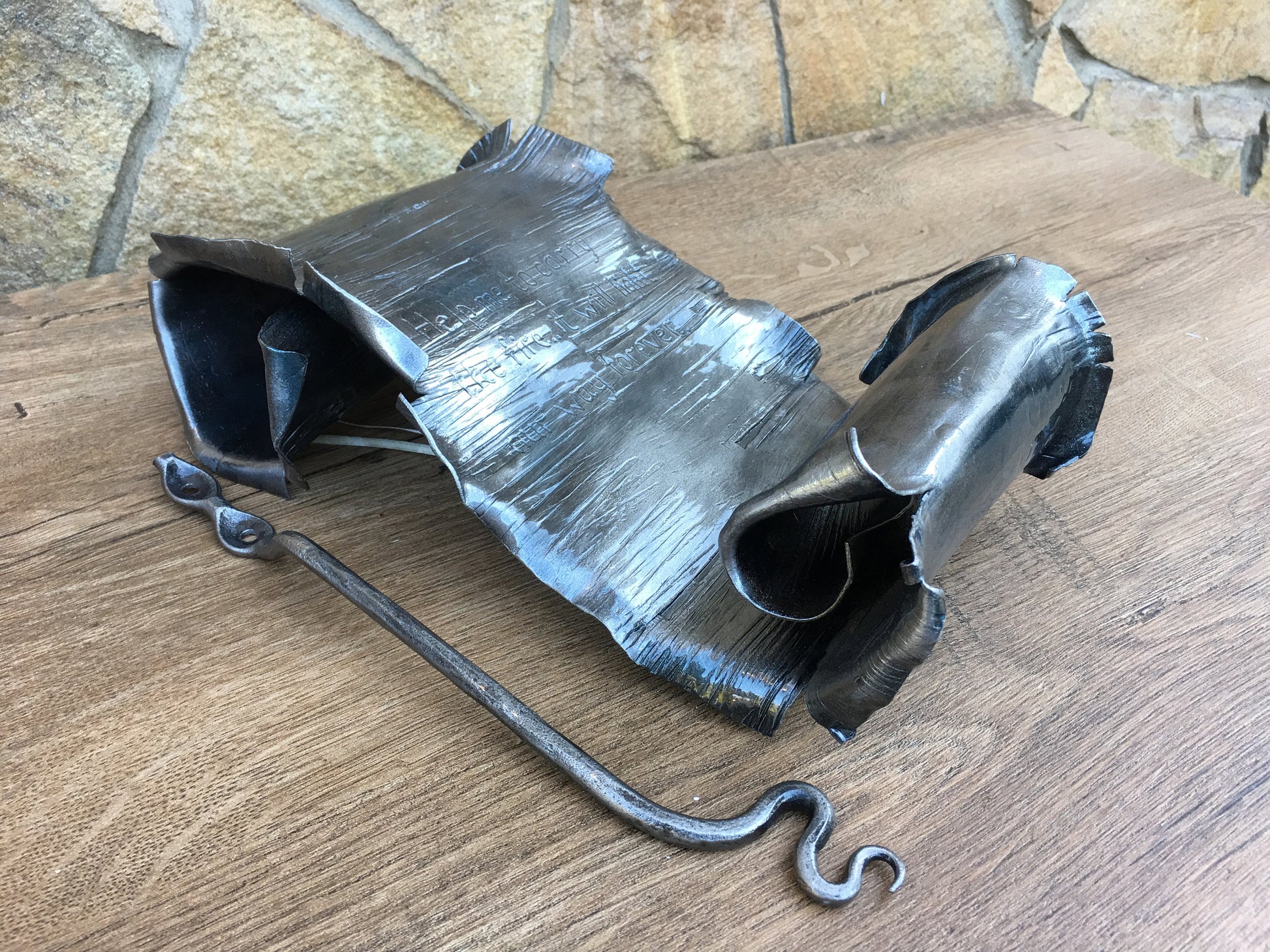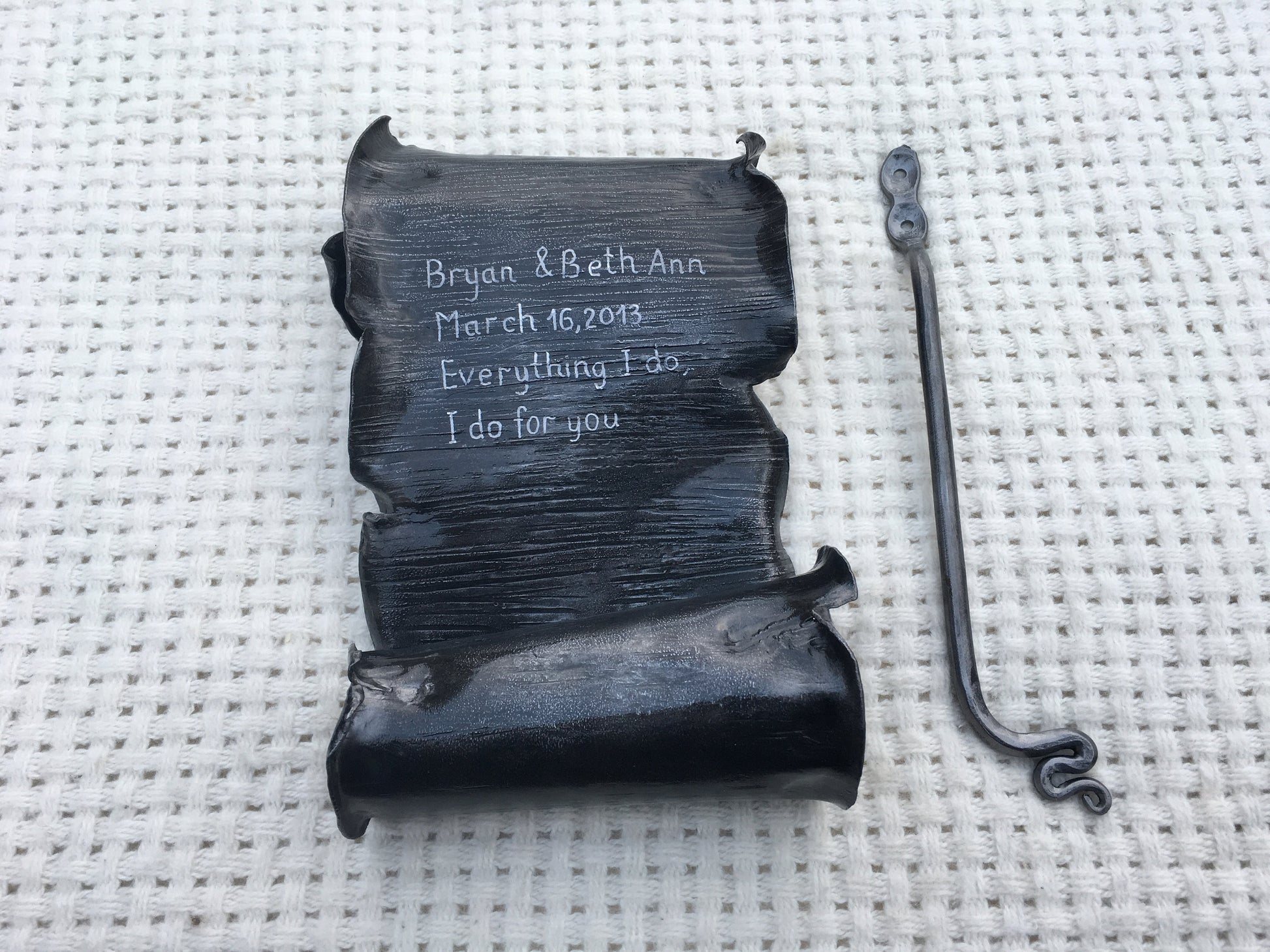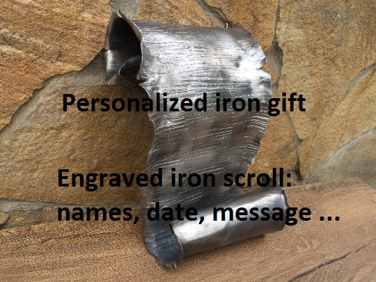 Here is a nice hand hammered iron scroll, with engraving (names, date, message ...). A nice gift for a wedding, 6th wedding anniversary (iron anniversary), for expressing love, for engagement, Valentine's Day and for many other gifting occasions! It is a wall hanging since it has a hanger which can be screwed to a wall and a scroll can be hung on it (or you can use it as a table centerpiece).