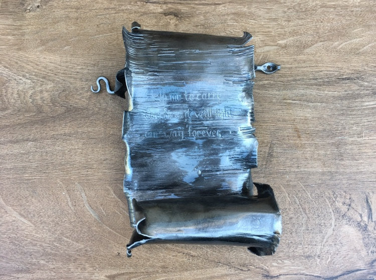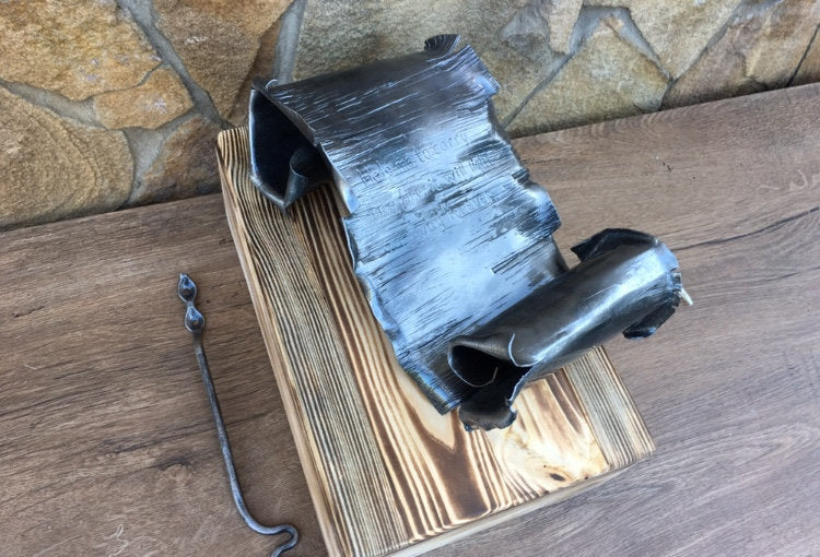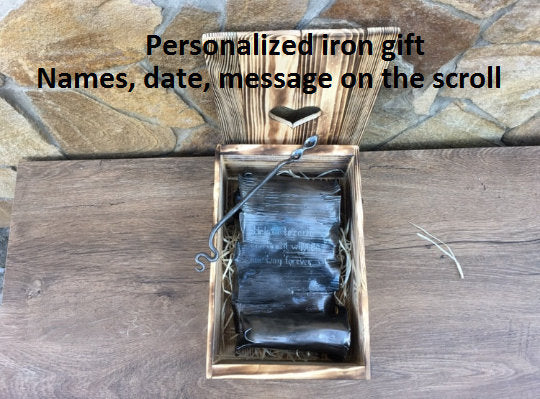 Here is a nice hand hammered iron scroll, with engraving (names, date, message ...) in a wooden gift box. A nice gift for a wedding, 6th wedding anniversary (iron anniversary), for expressing love, for engagement, Valentine's Day and for many other gifting occasions!