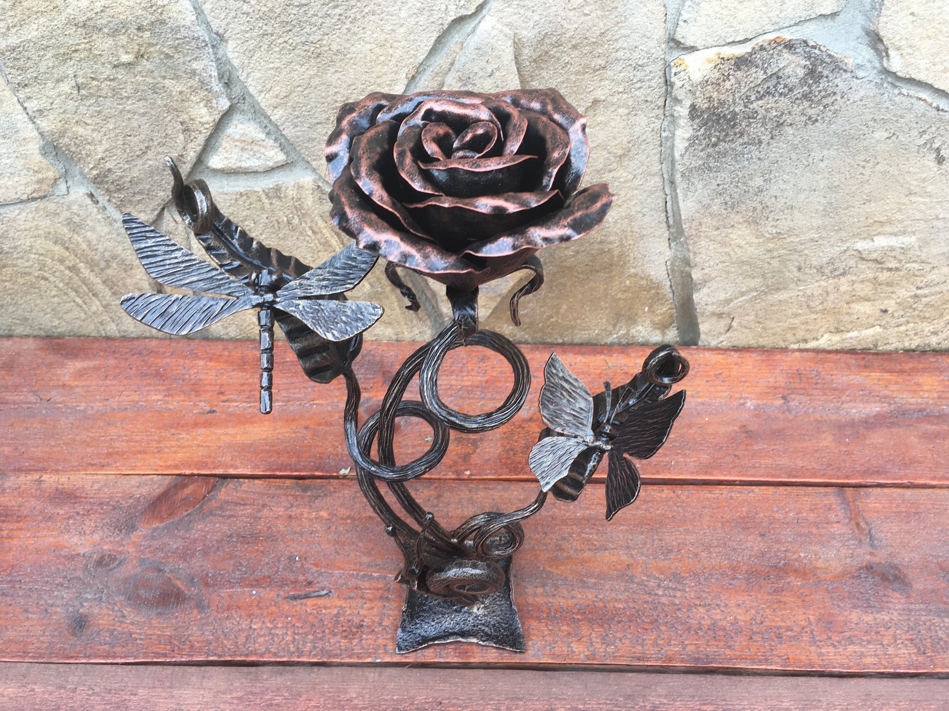 Are you looking for a nice wedding anniversary gift? Valentine's day gift? Wedding gift? Birthday gift? Or just a home decor? Here is a forged metal rose which could be a nice gift for your girl/woman. On the leaves of the rose there is a butterfly, a dragonfly and there is a big awesome snail on the stem. It looks very festive and decorative! It deserves to be a cool gift!