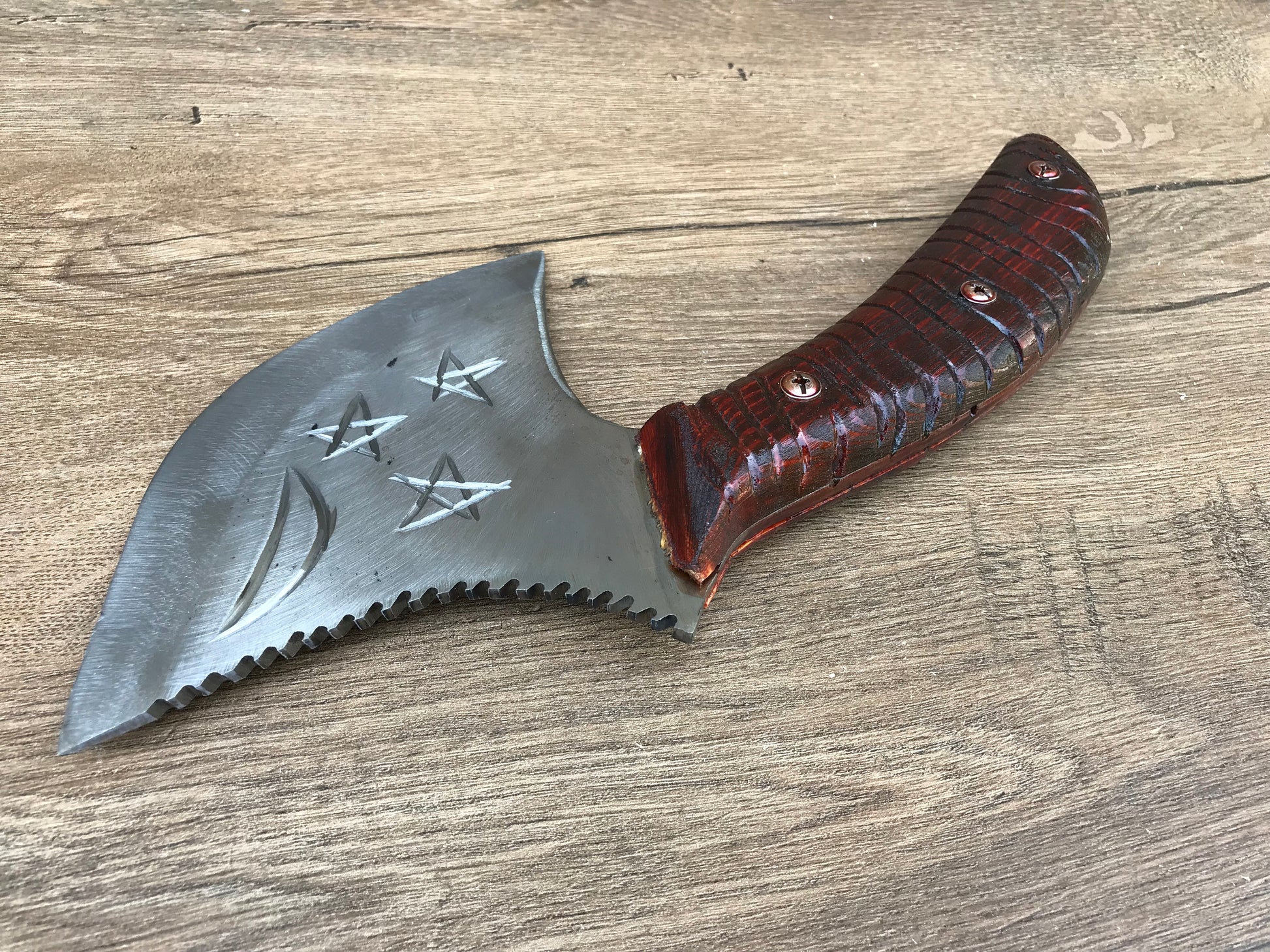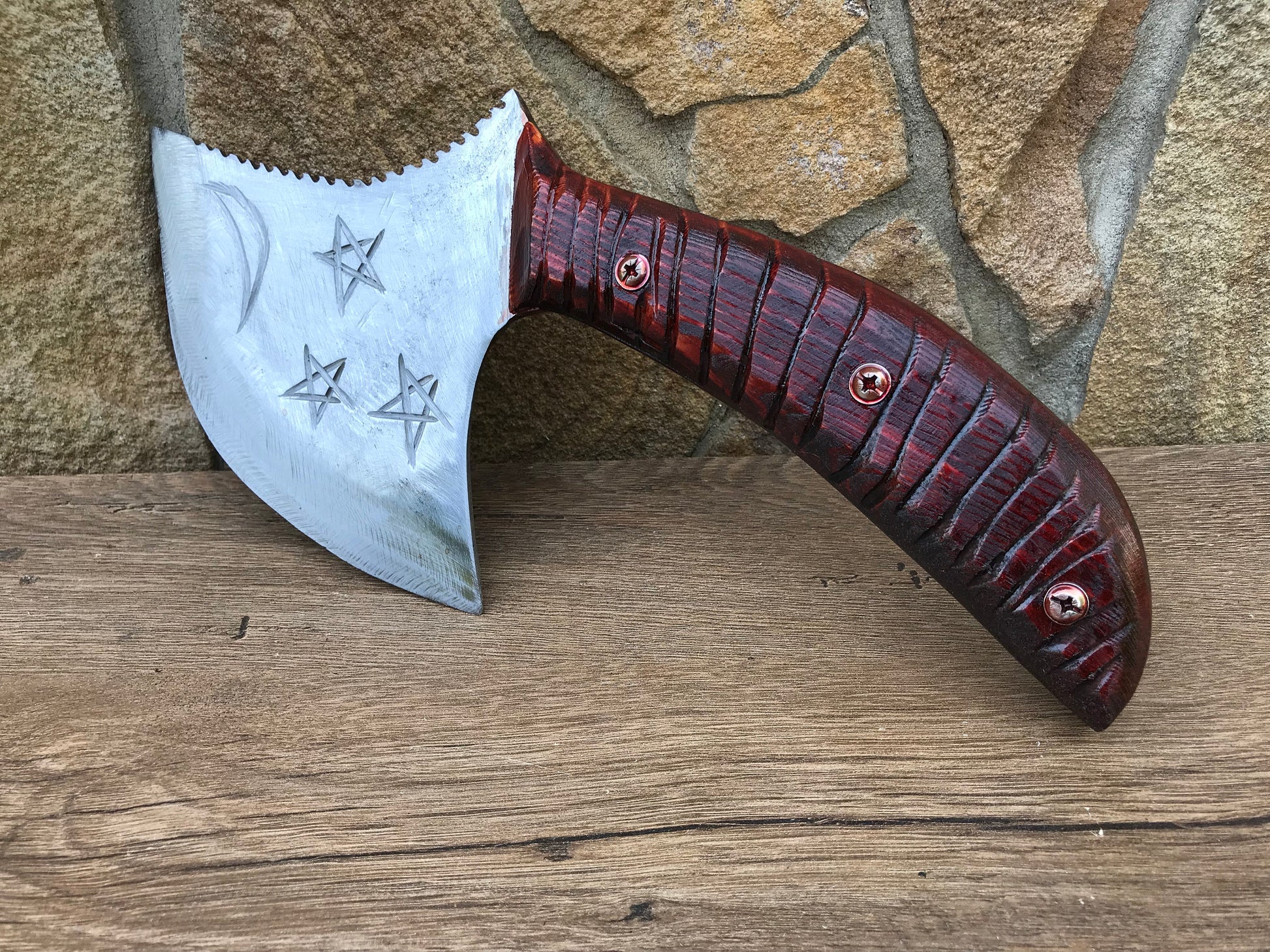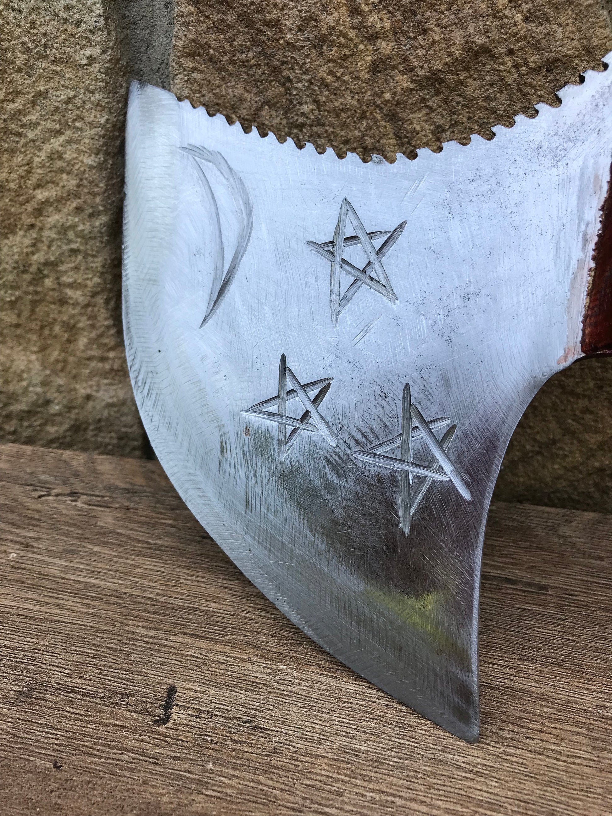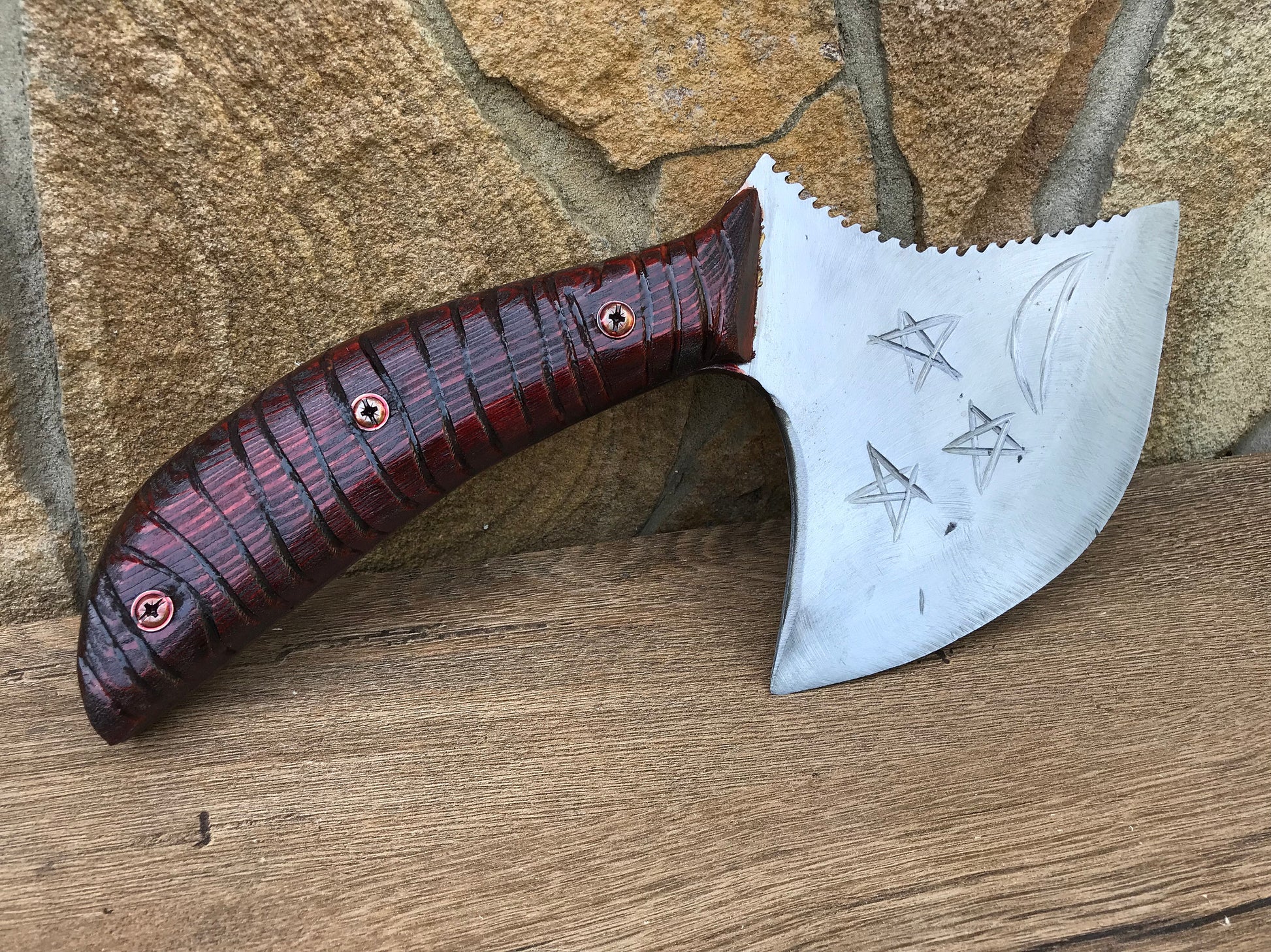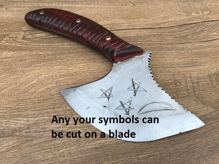 A kitchen axe decoratively done, with a moon and three stars on the axe head (on both sides). Here can be your several symbols to be cut on a blade.