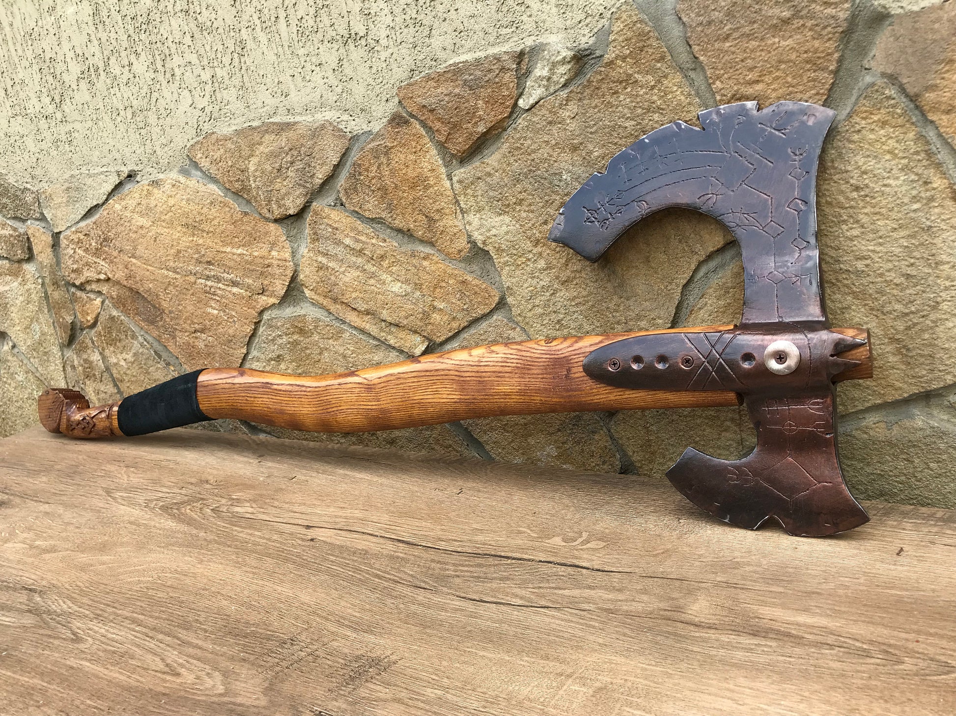 This listing is for one fully finished Leviathan Axe for the character Kratos from the game God of War (hand forged axe head and carved wooden handle as per the photos of the listing).