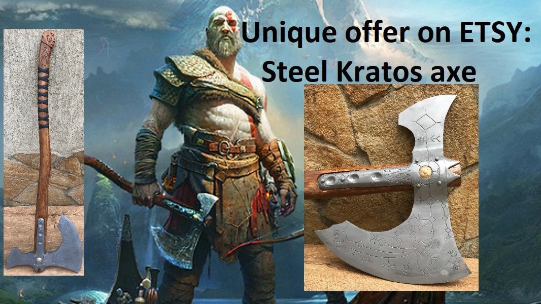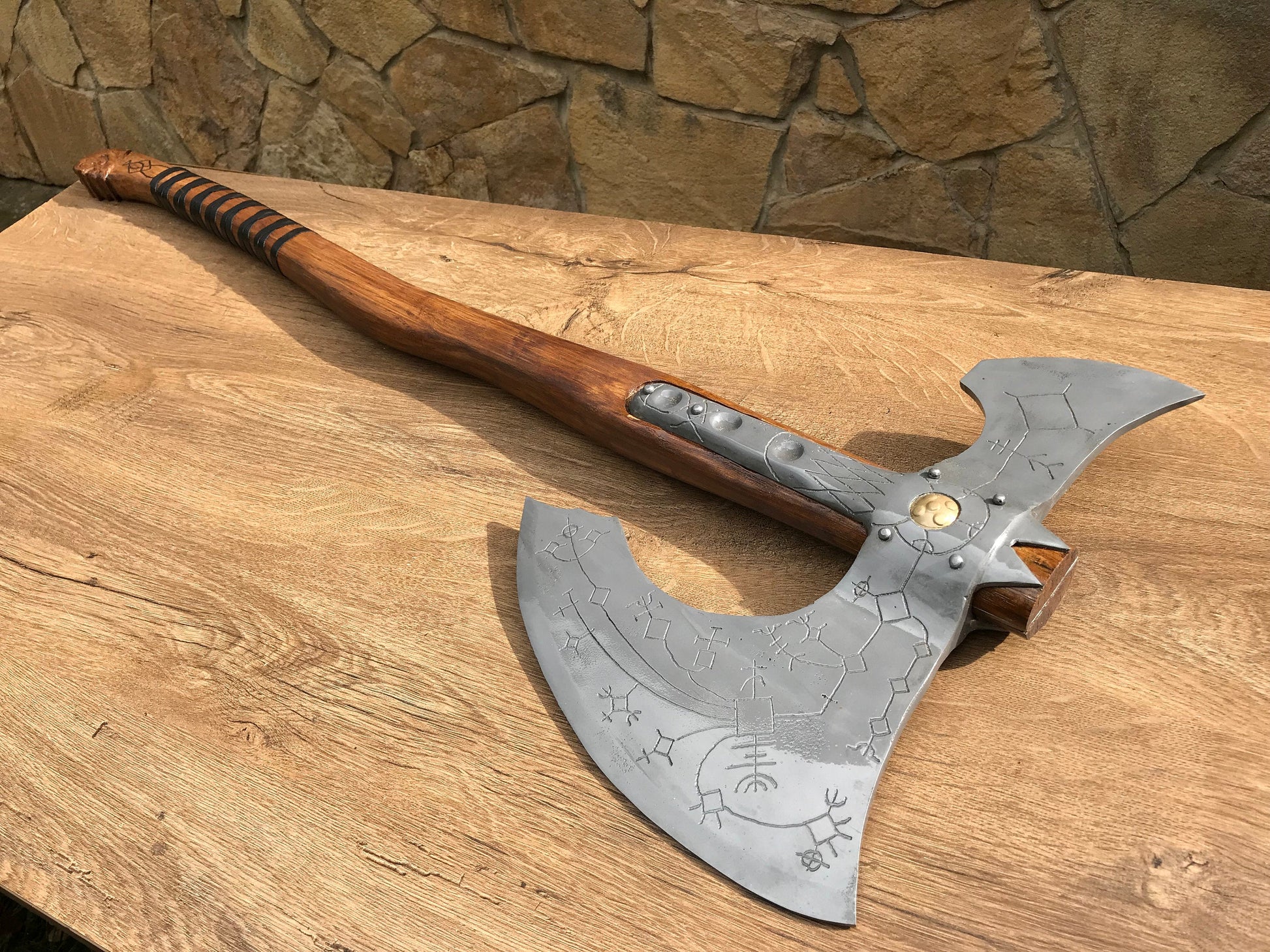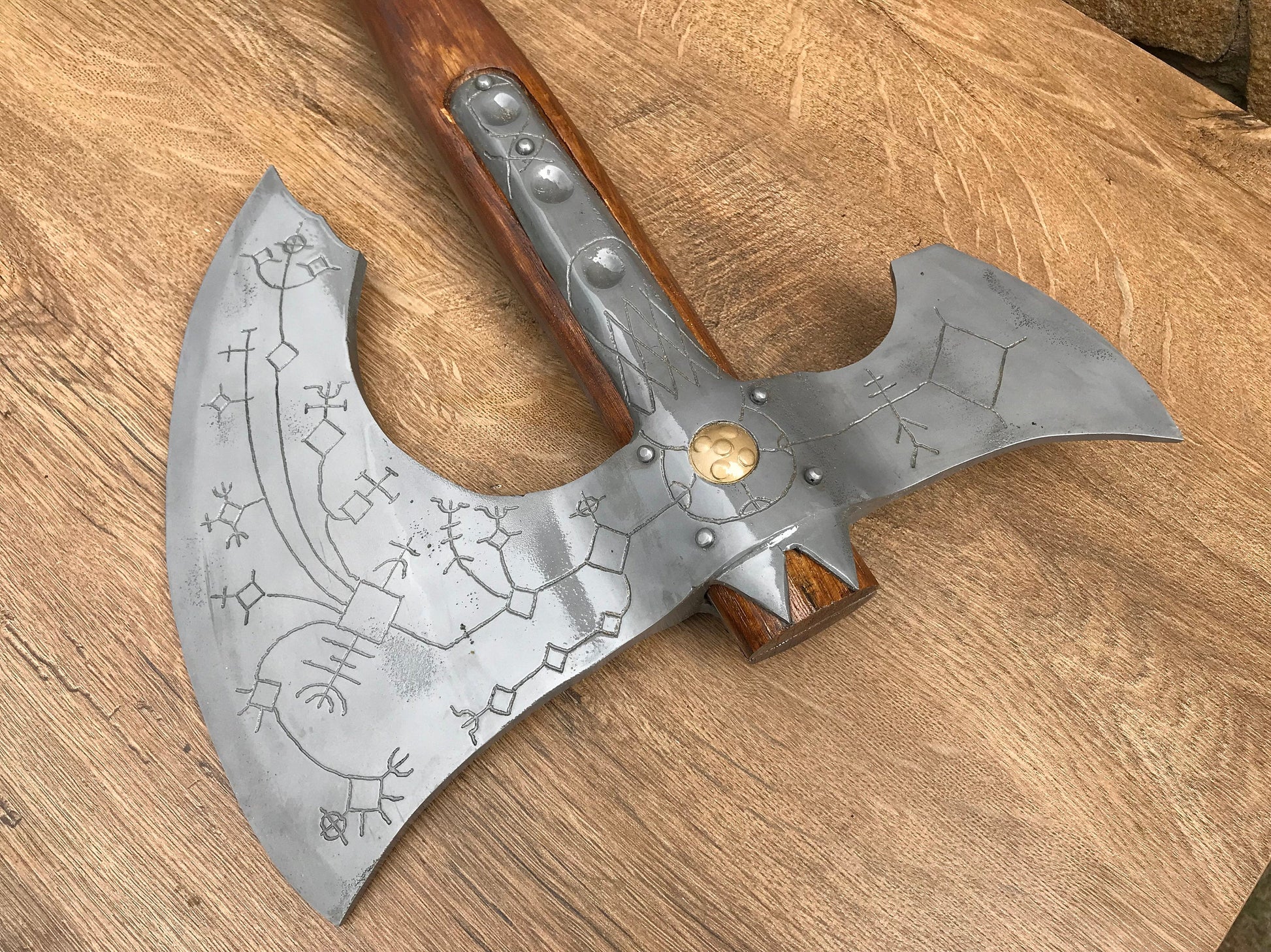 This listing is for one fully finished Leviathan Axe for the character Kratos from the game God of War (hand forged axe head and carved wooden handle as per the photos of the listing).