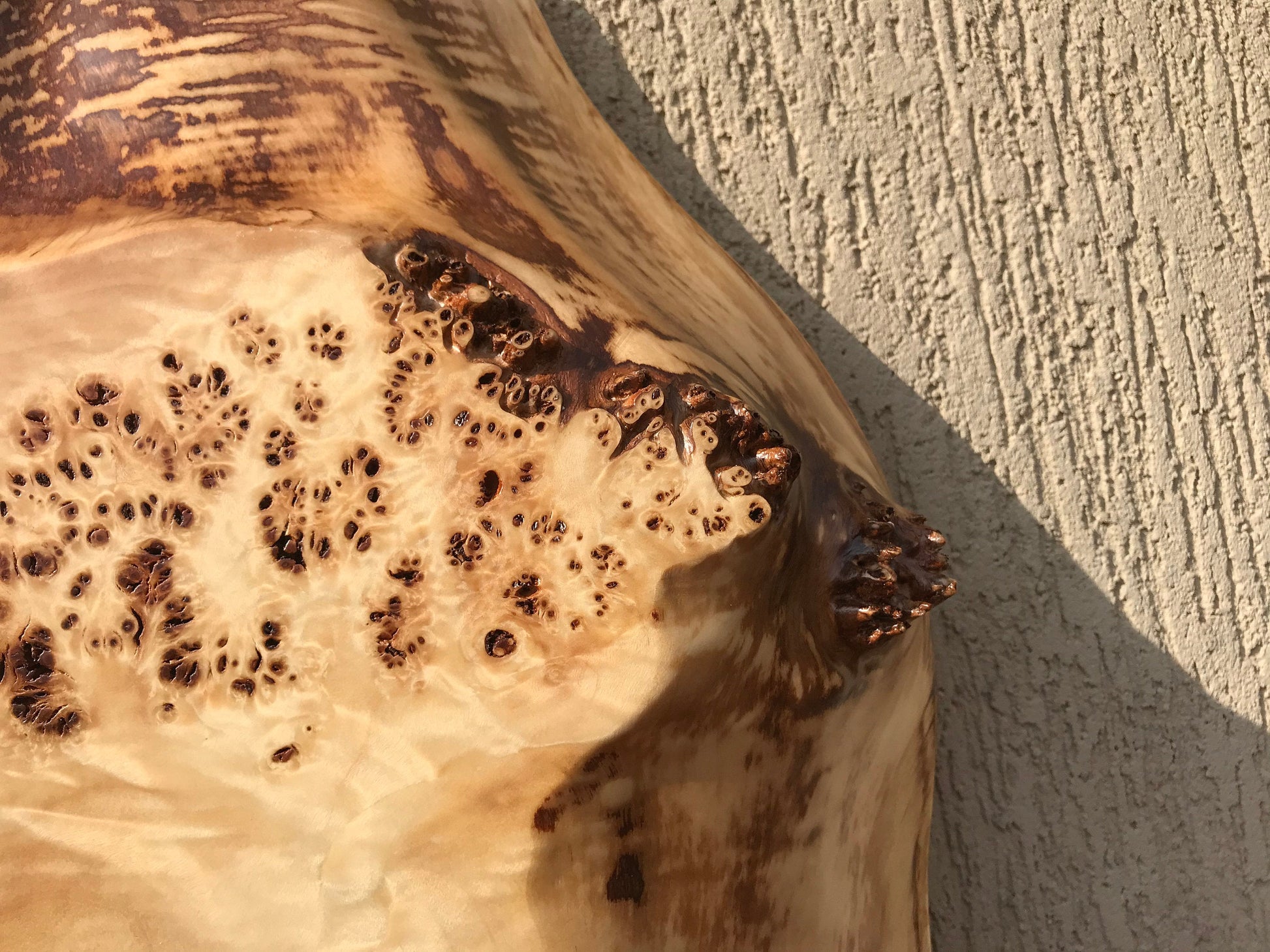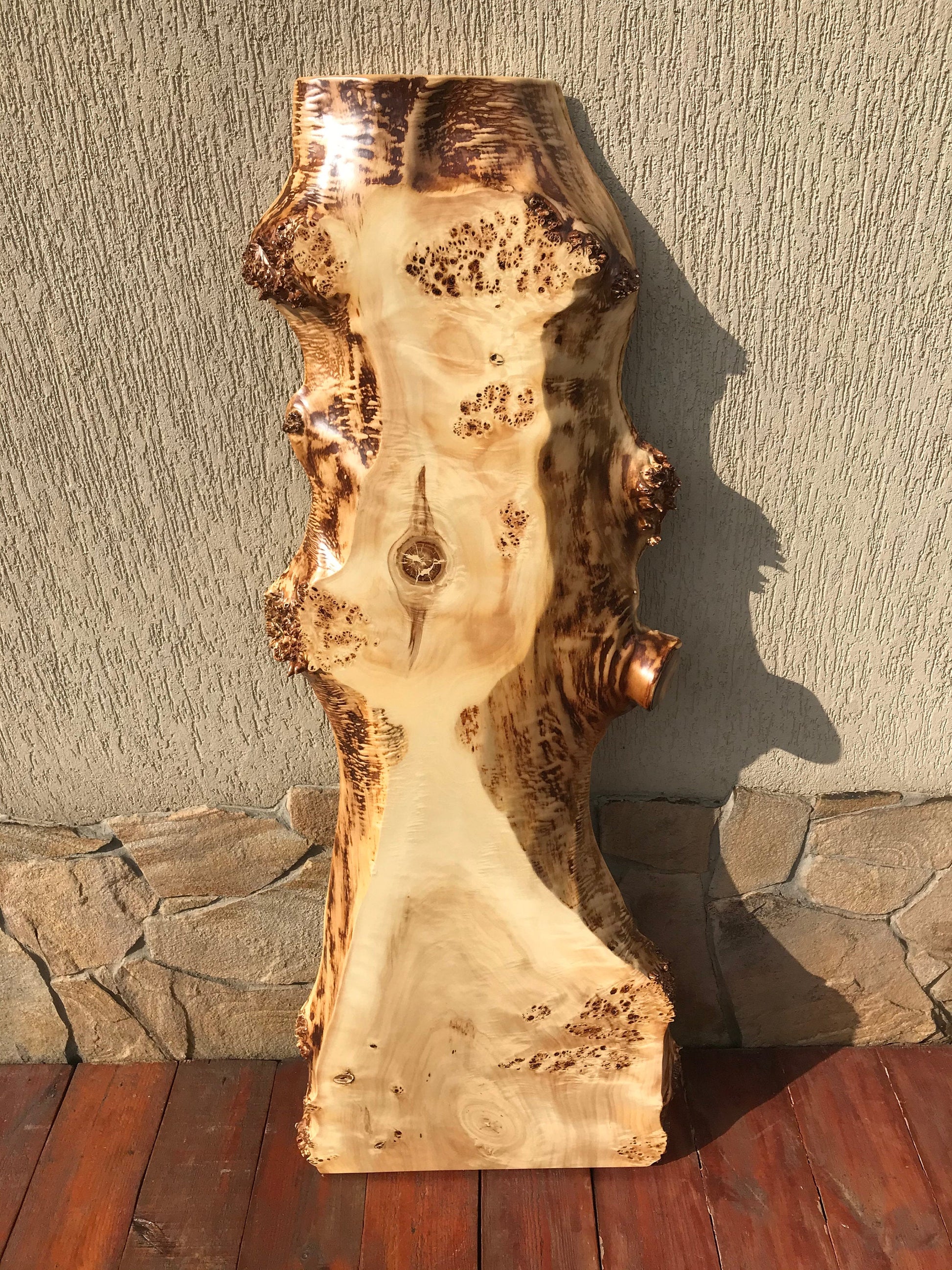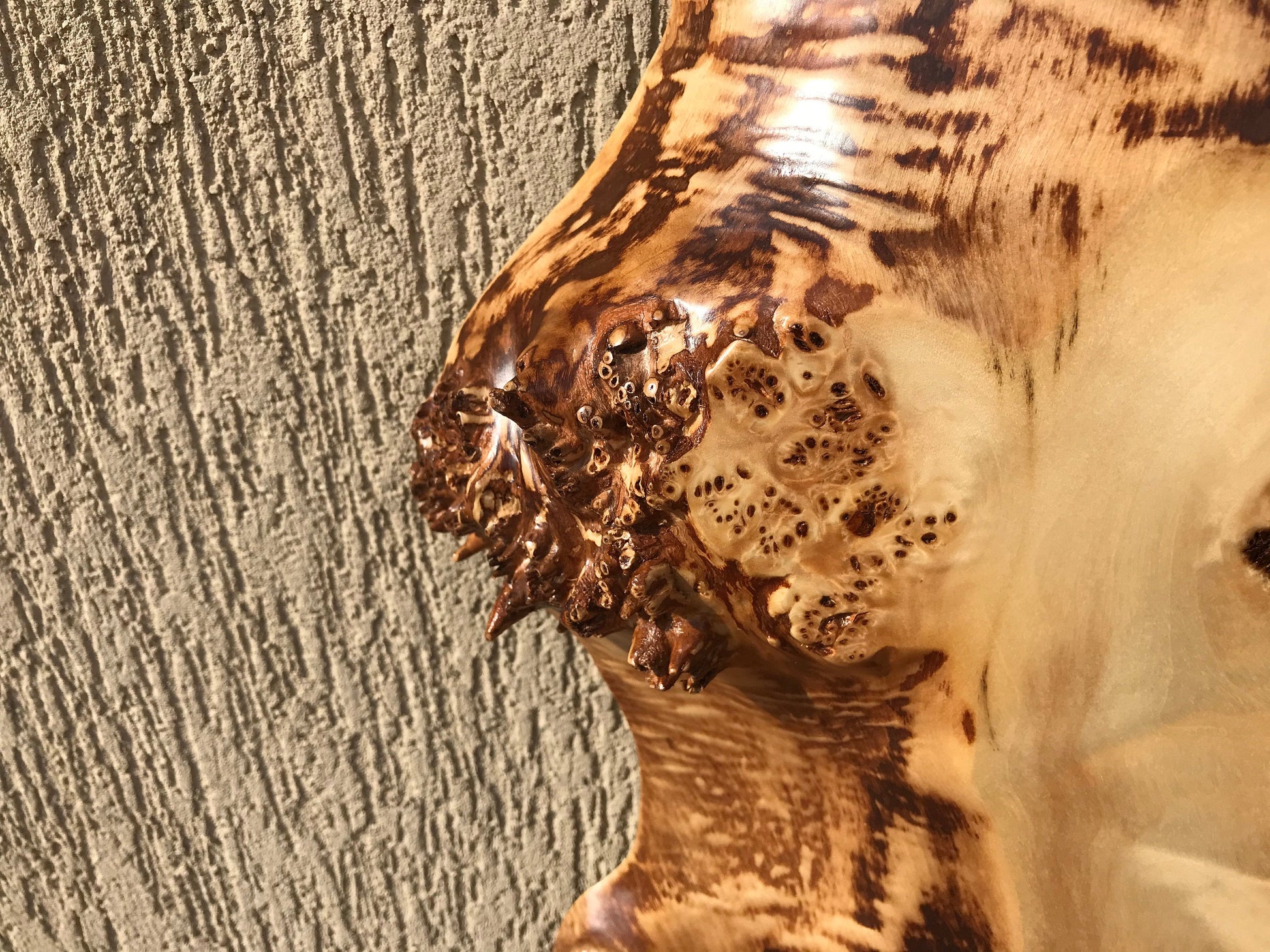 Beautiful, curly figured texture mixed with tight, burly, knotty clusters of pins and knots throughtout whole piece. Live edge shows crazy bubbles and peaks on live edge caused by burly type of growth.