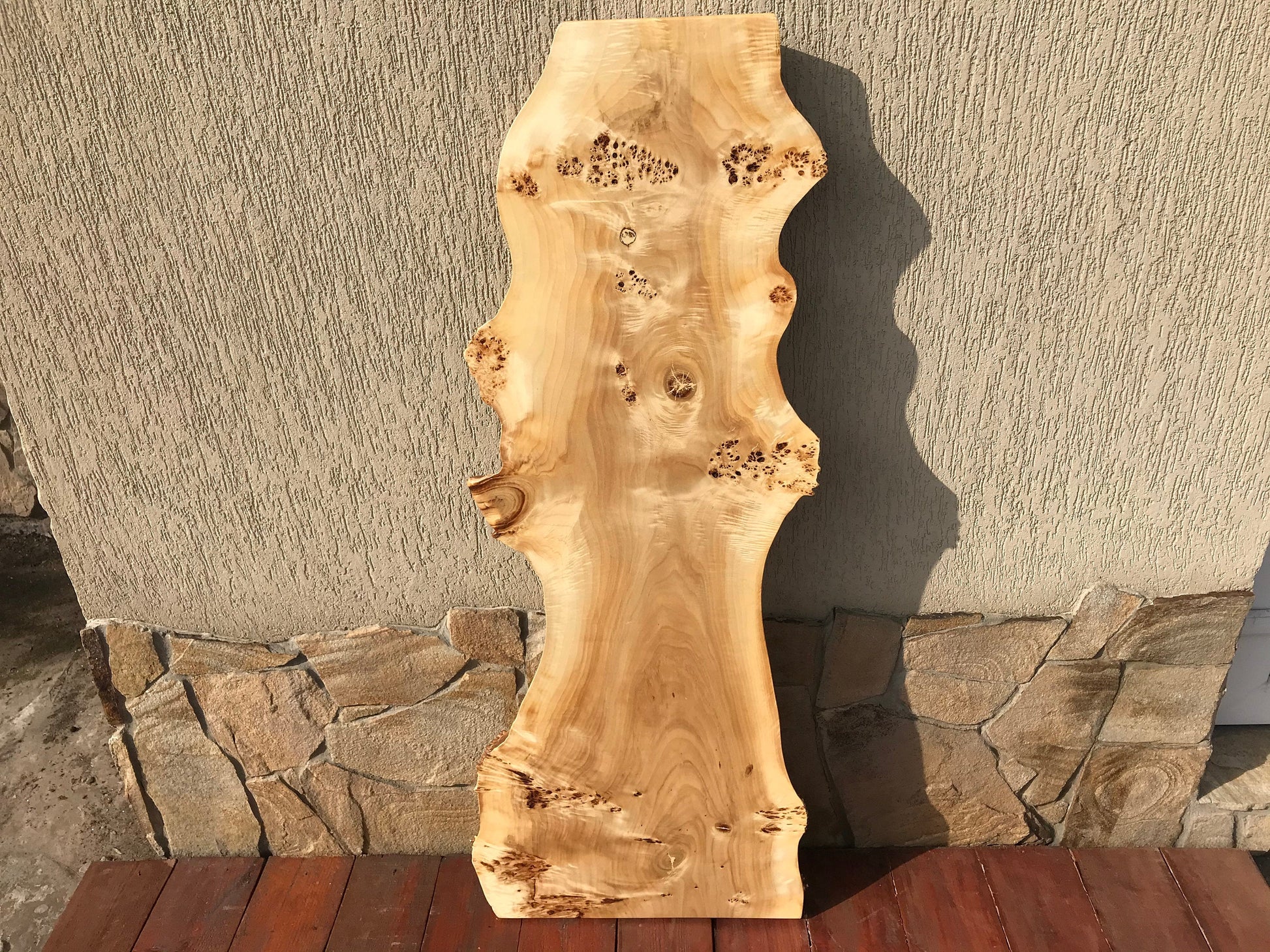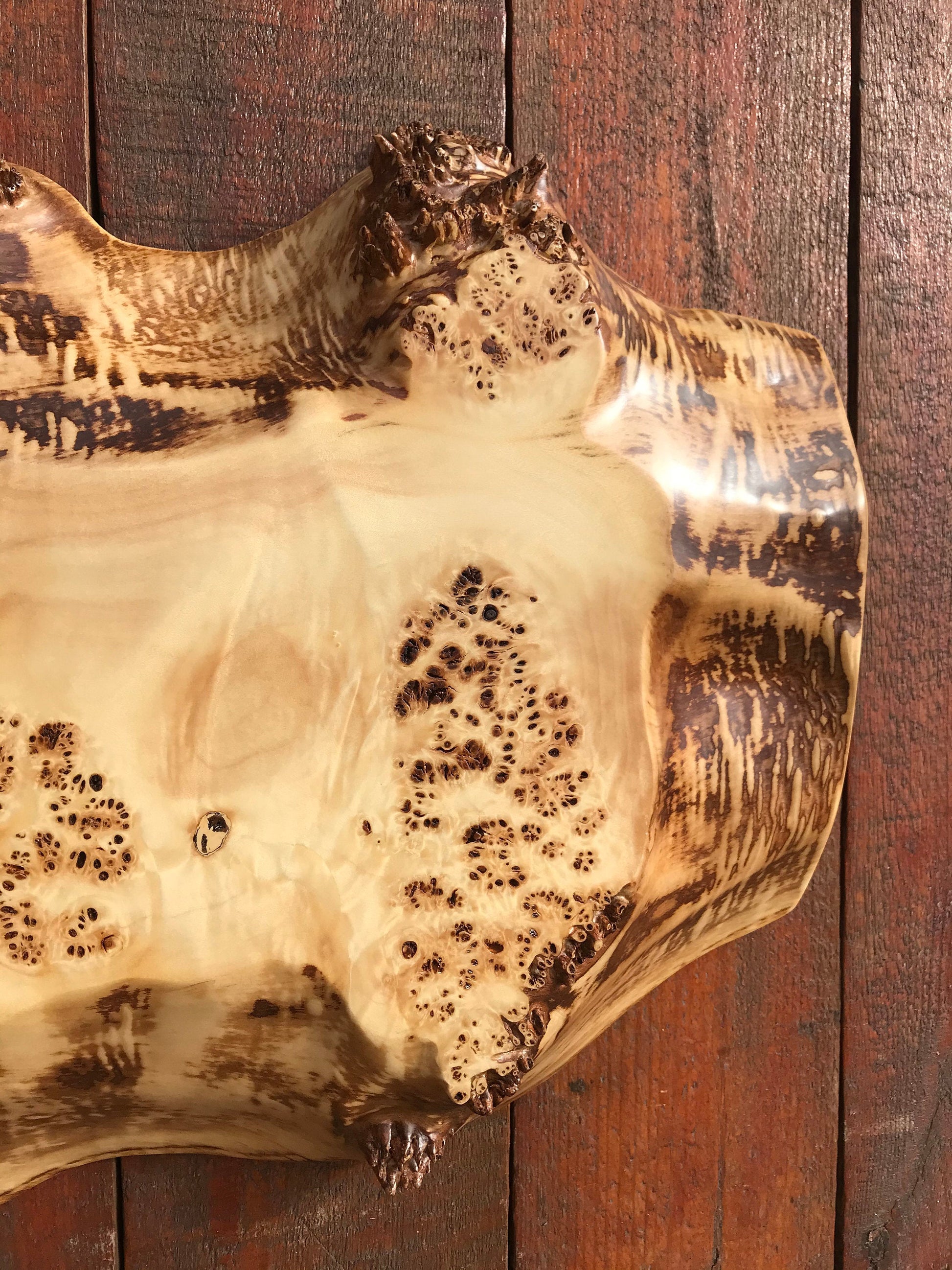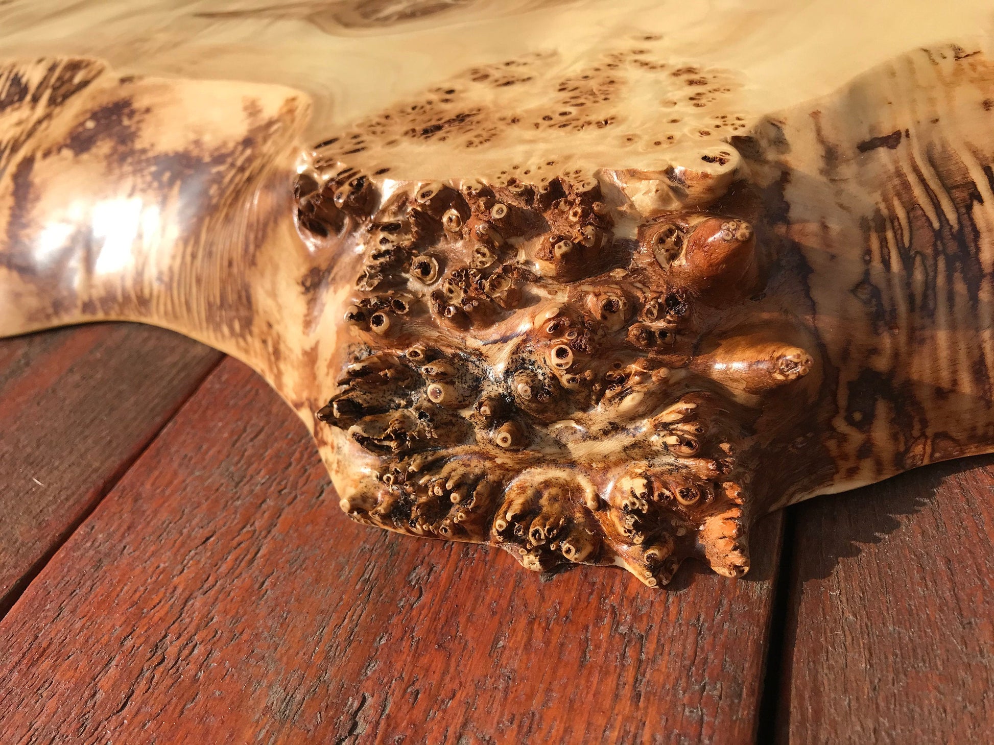 Beautiful, curly figured texture mixed with tight, burly, knotty clusters of pins and knots throughtout whole piece. Live edge shows crazy bubbles and peaks on live edge caused by burly type of growth.