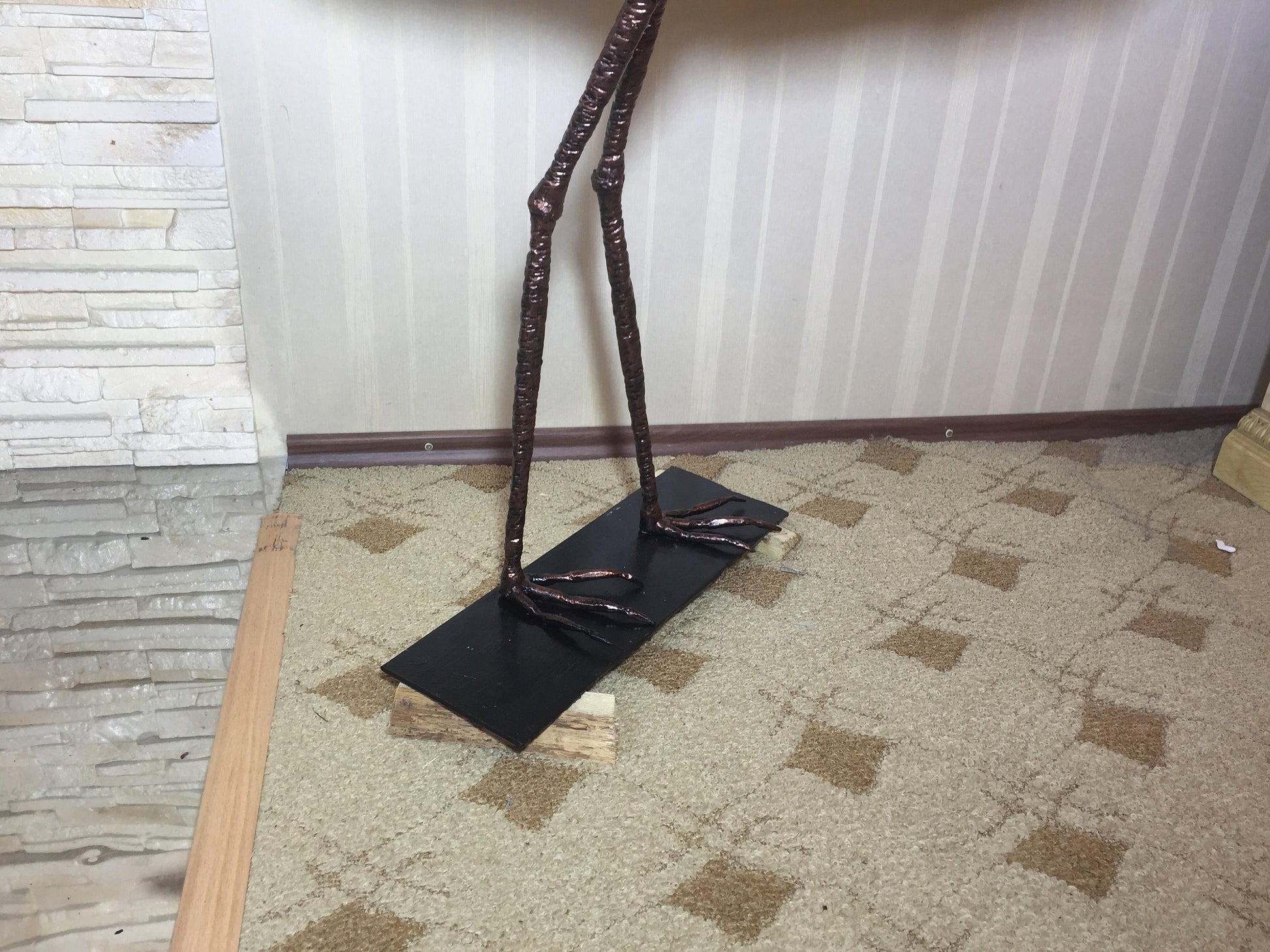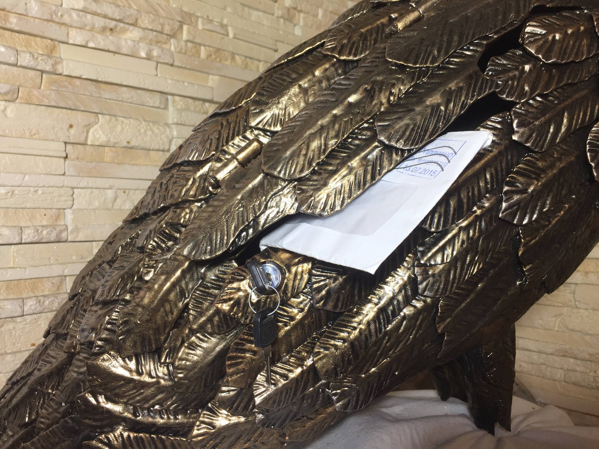 In the right wing of the bird there is a metal oval box which is serviced as the post box, it is completely hidden behind the wing in the bird's body. You drop letters into a special slot in the wing which has a movable cover in a view of feathers. In order to pick up the letters from it you need to pull the right wing and just simply pick up the letters/newspapers. The rims of the wings are painted with some silver colour. The legs and beak are painted in copper colour.