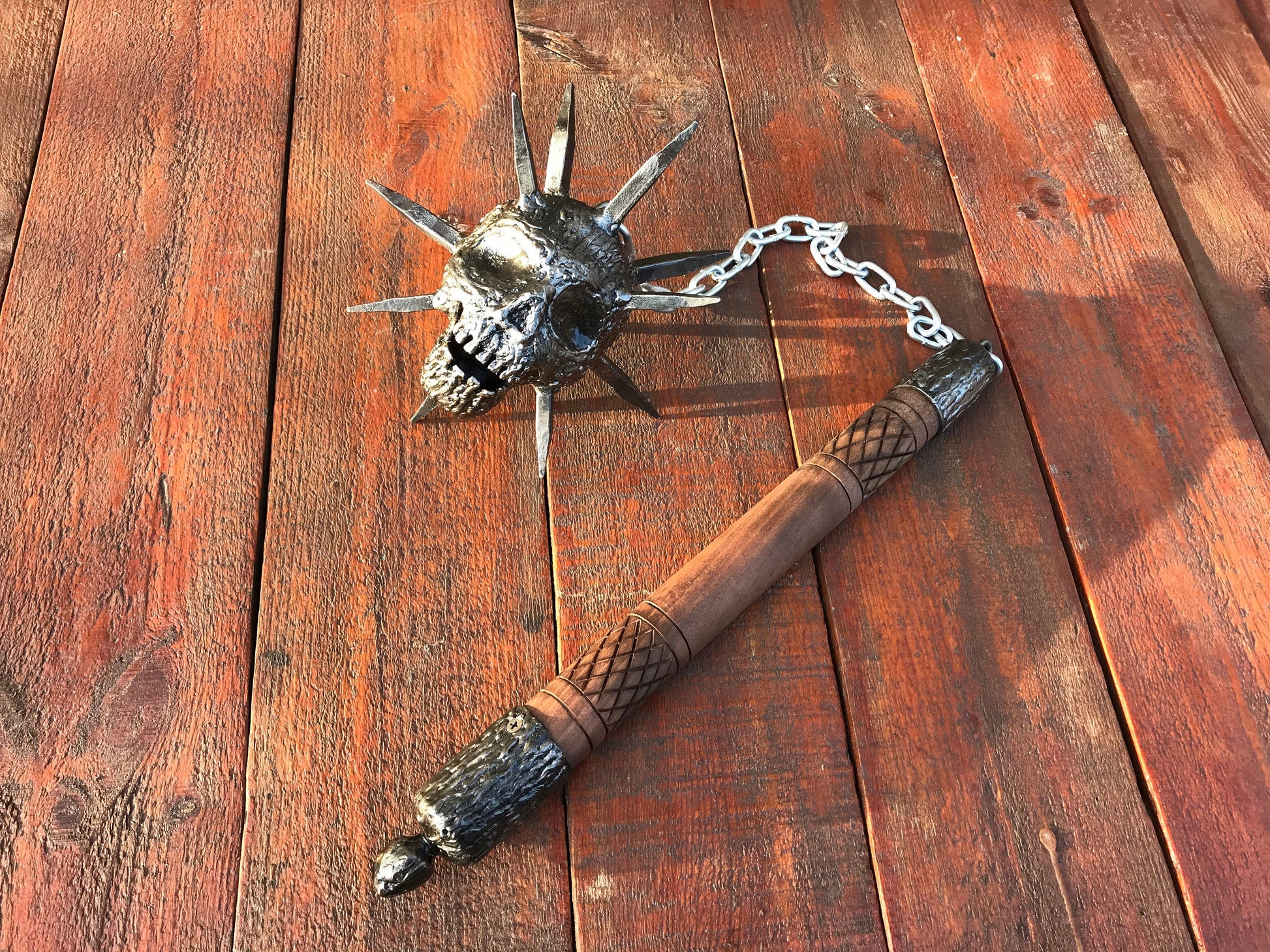 Here is a hand crafted mace on a chain with a wooden handle in a view of a skull. It is done in the technique of the artistic forging. It has a very decorative handle, nice looking. Metal caps on a handle have a nice texture.