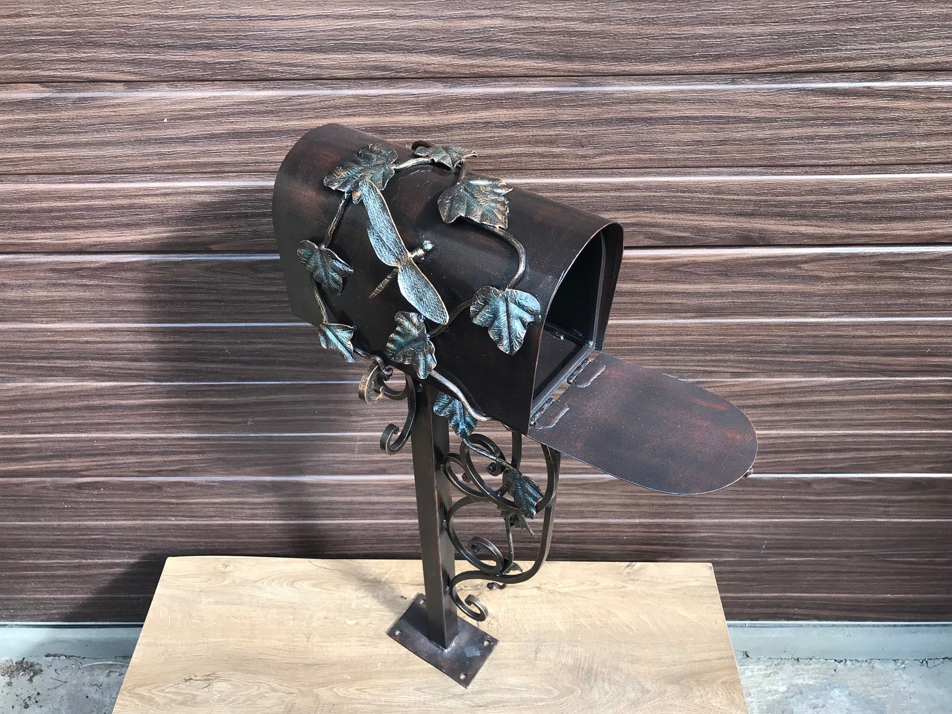 Here is a hand forged post box decoratively done with vines, leaves and a dragonfly. It has no lock, no keys.