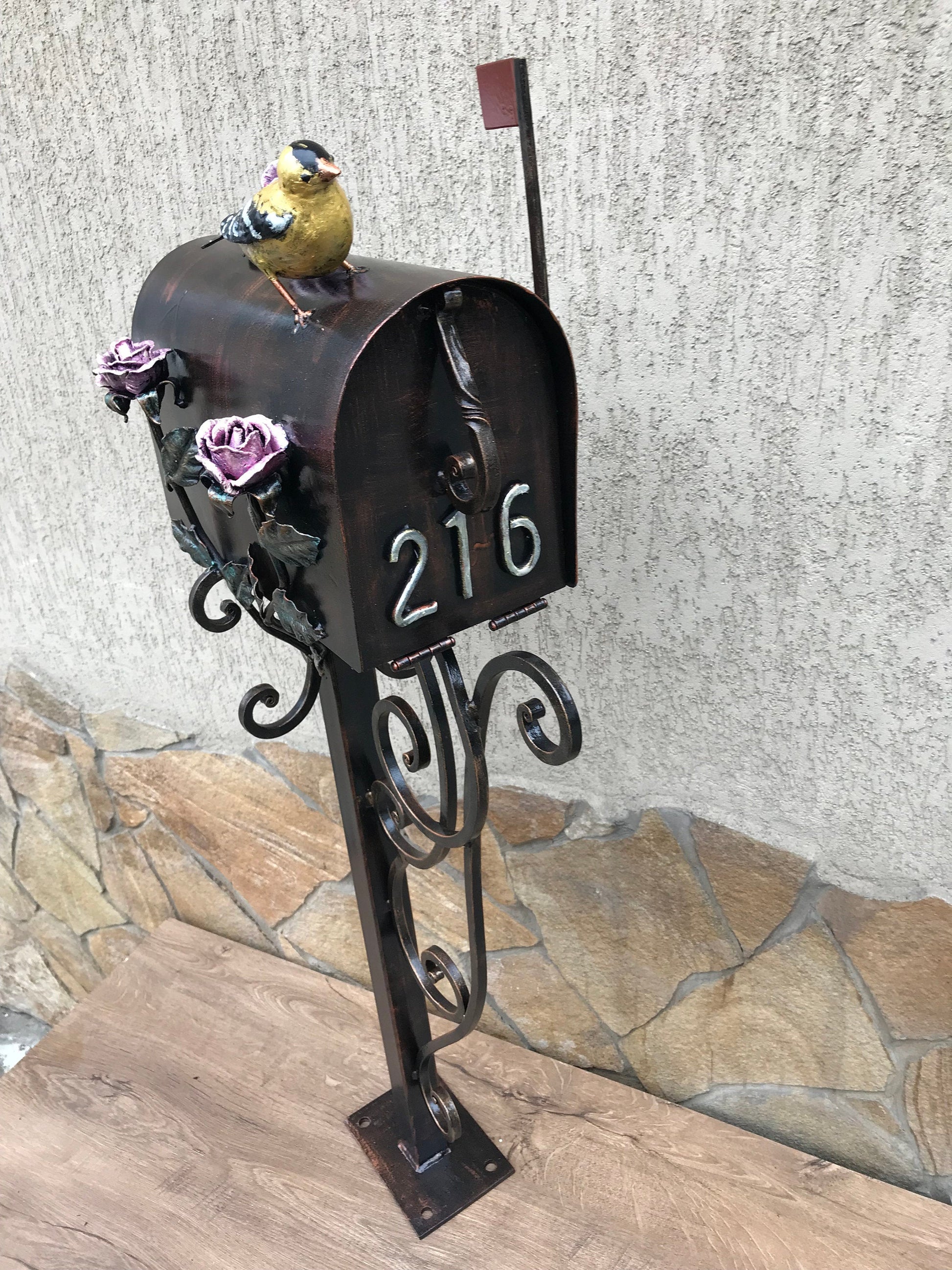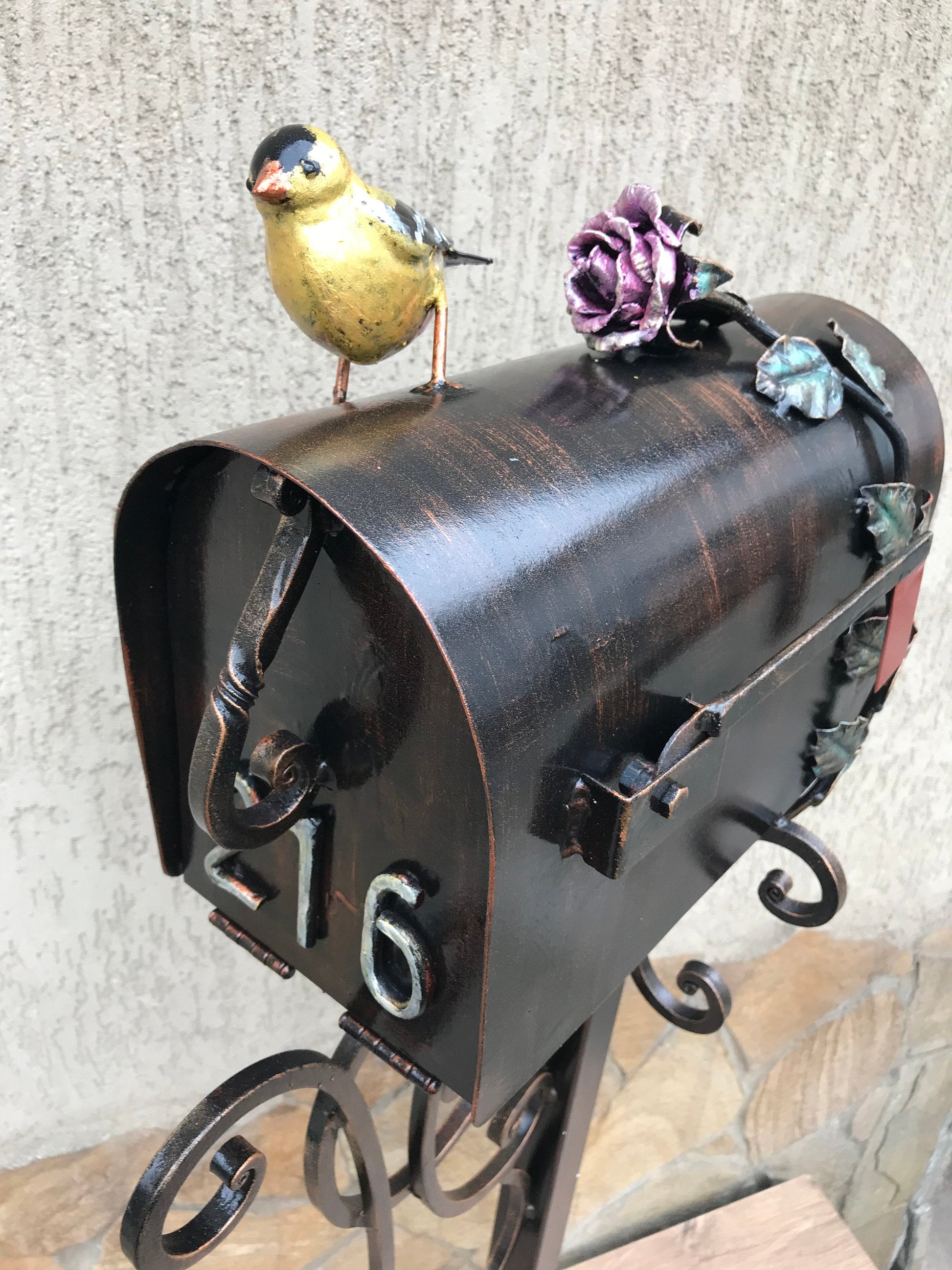 Here is a hand forged mailbox with a post decoratively done in the technique of the artistic forging with a goldfinch, three roses, house number and a bird. There is no lock in it. It has a house number of its door.