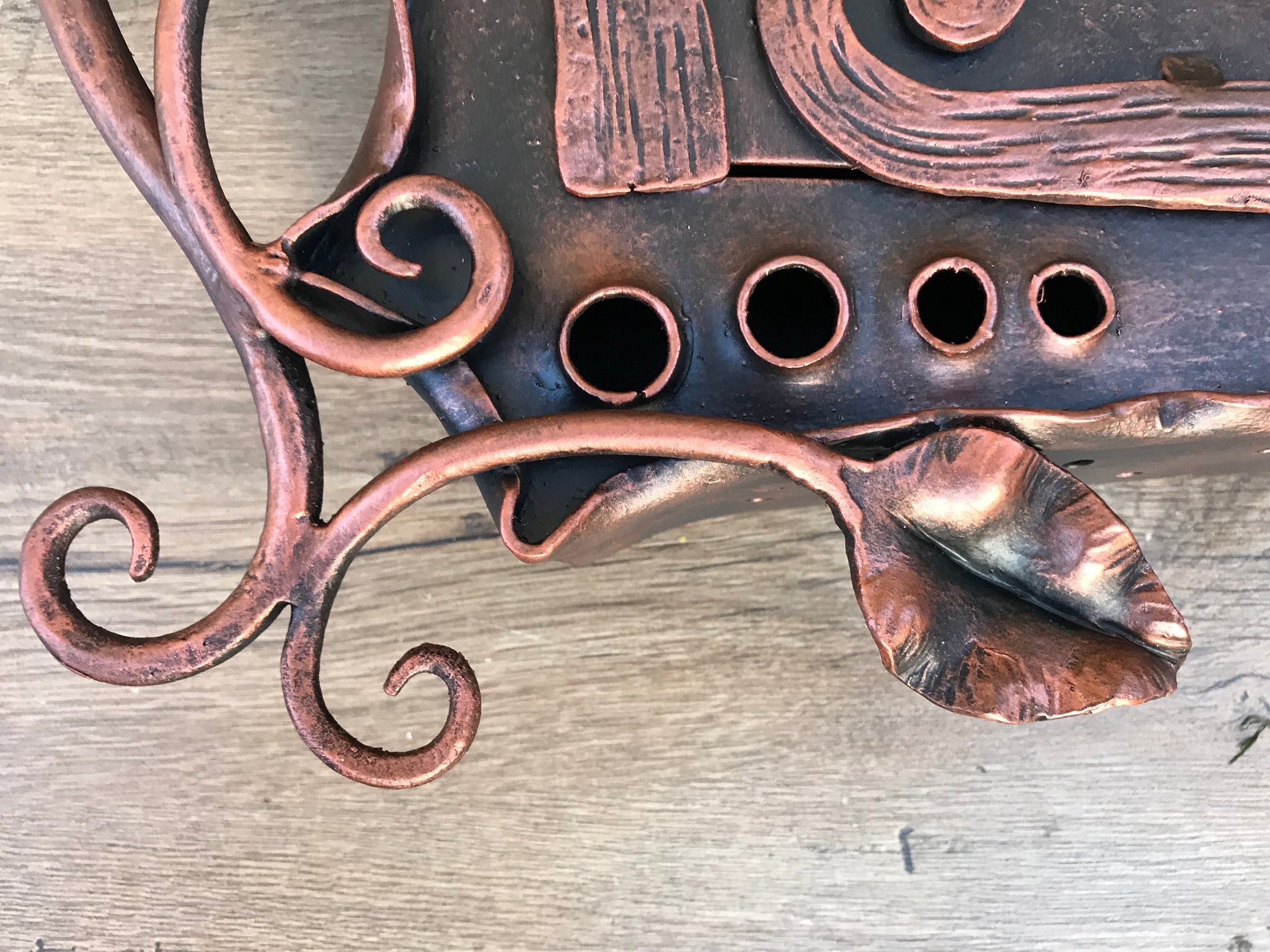 Colour: black covered by copper patina (artificial aging).