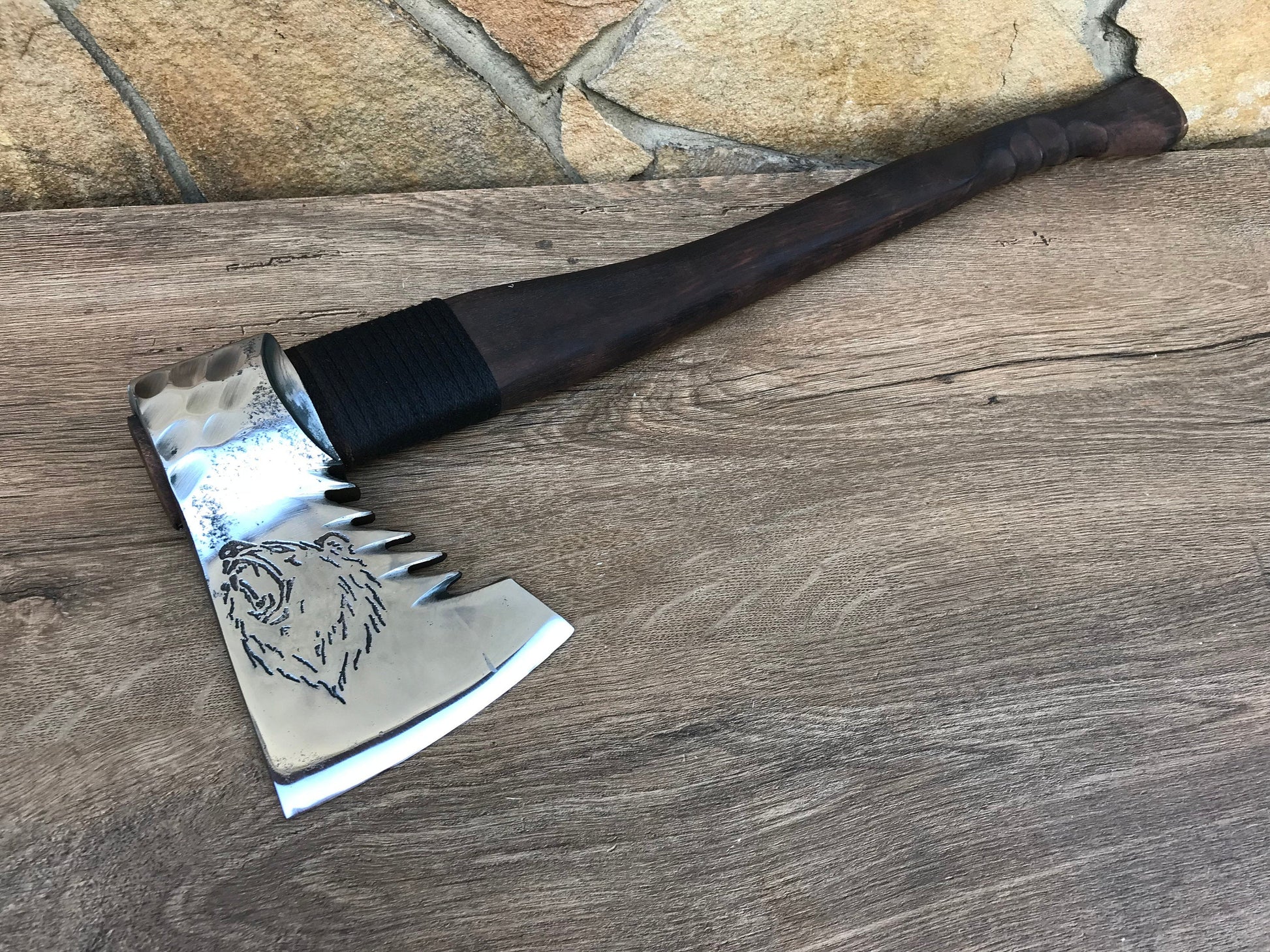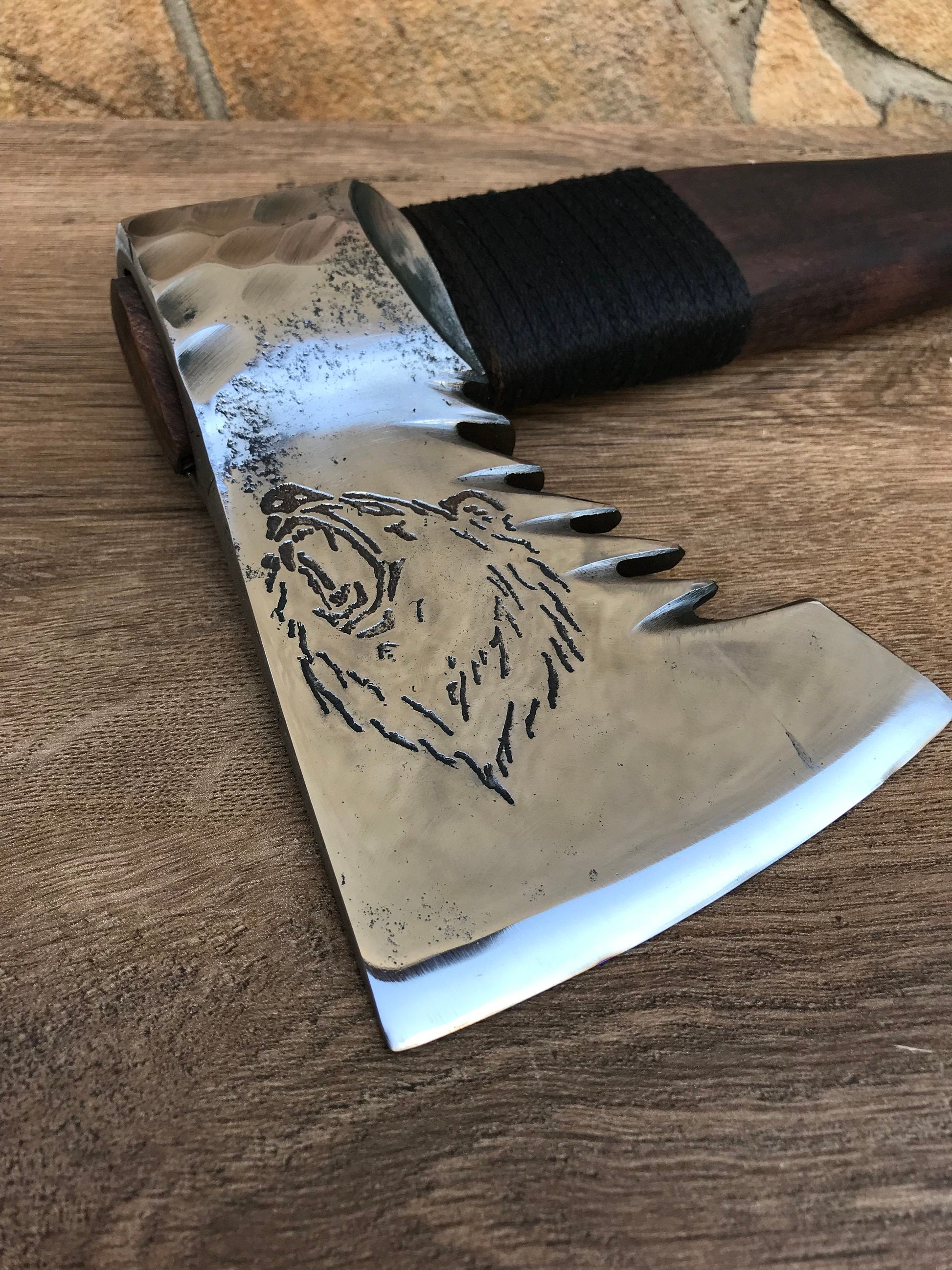 A compact outdoors axe, with engraved a bear head on the axe head, hand-forged and made from carbon steel using traditional blacksmith methods. The steel is stuck several times, increasing its density and thereby the durability of the axe. Perfect for packing in a rucksack, the axe can also be worn on a belt. It will be a perfect companion in your ventures through the wilds, through the woods of the pacific northwest, or at the cabin to make kindling to warm your hearthside. It has a wooden stump.
