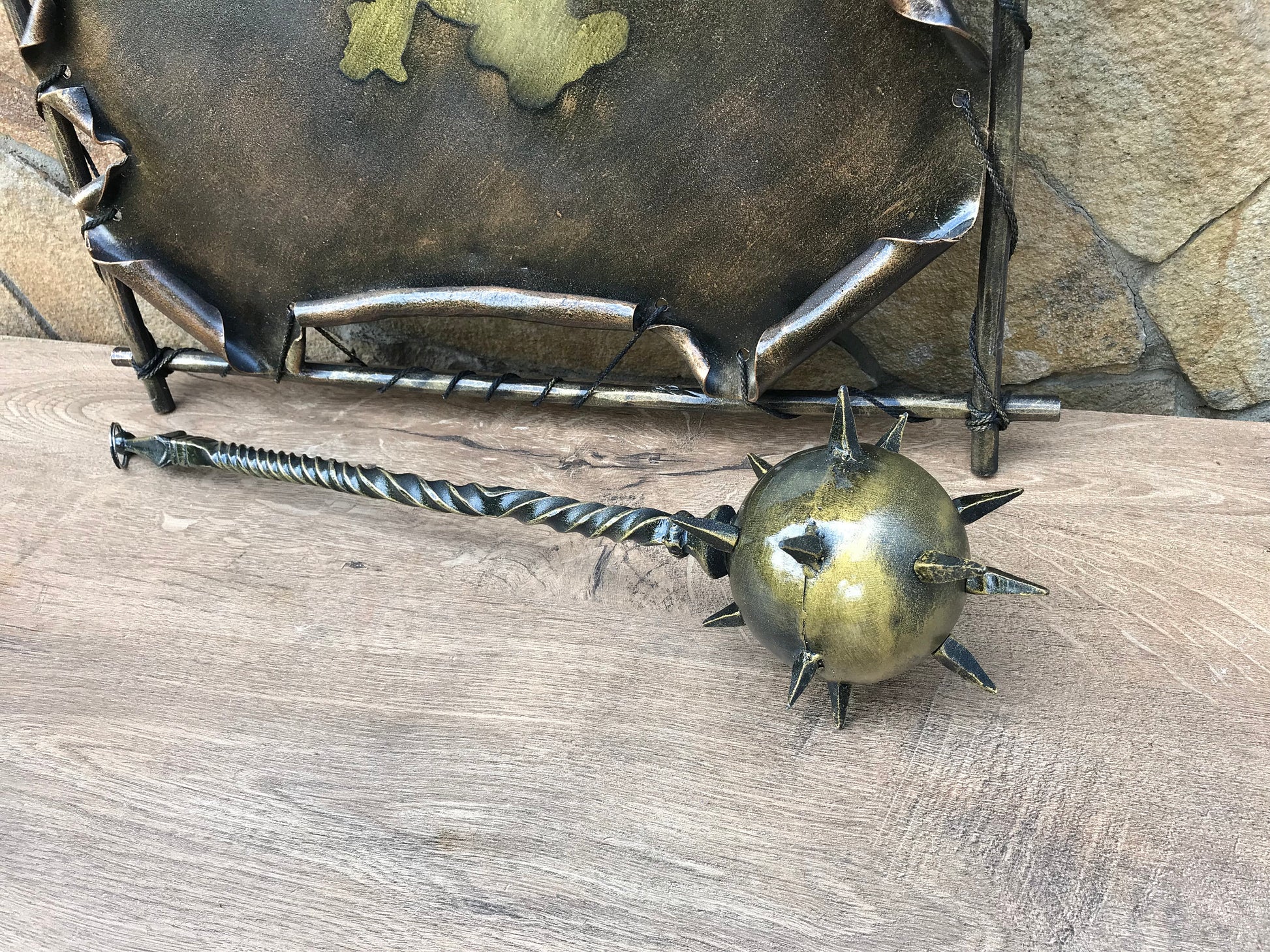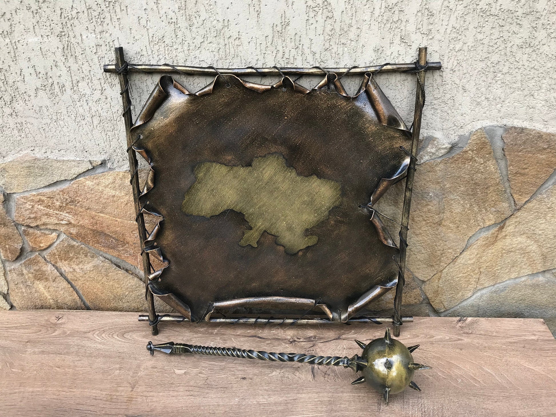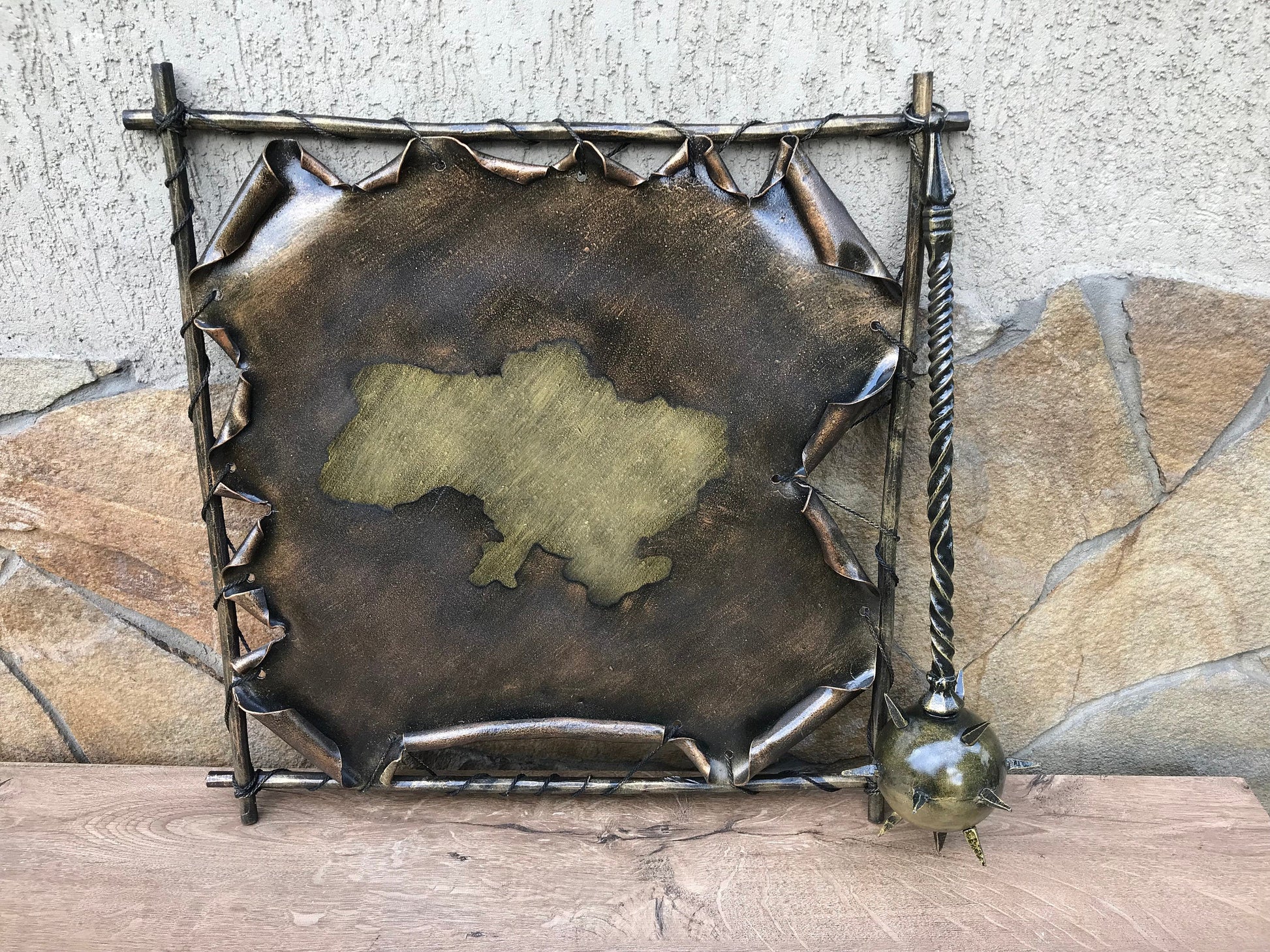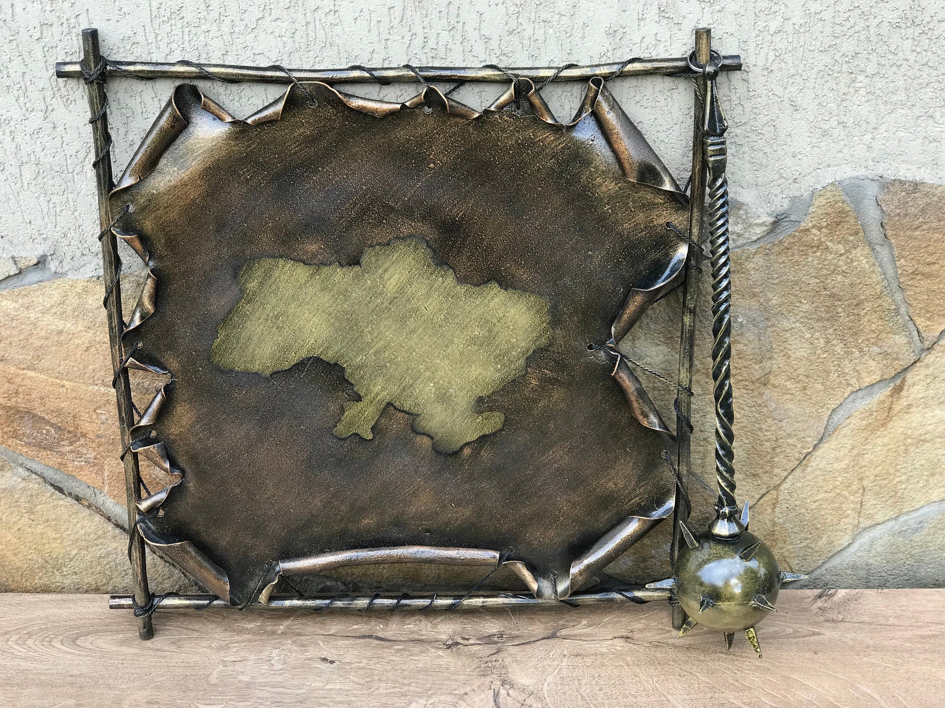 A map could be not a usual map but a masterpiece which could decorate your house and outline its interior. Here is a hand forged map of Ukraine with a hanging mace on it which is one of the symbols of Ukraine. In the style of this map I can make a map of your country/state with its national attributes.