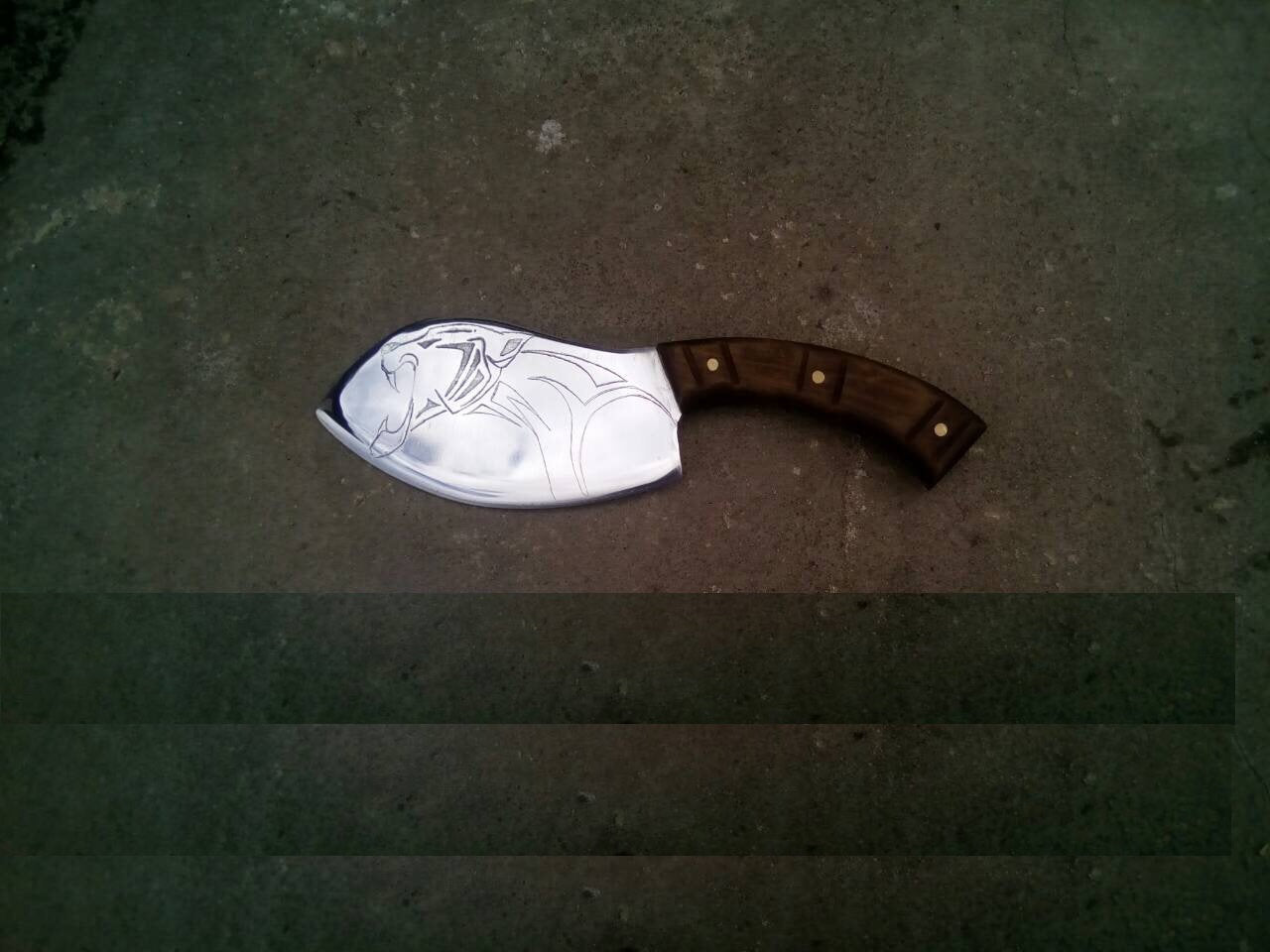 Here is a hand crafted knife with a nice structure of the blade (etched tiger head on the blade) and very convenient handle.