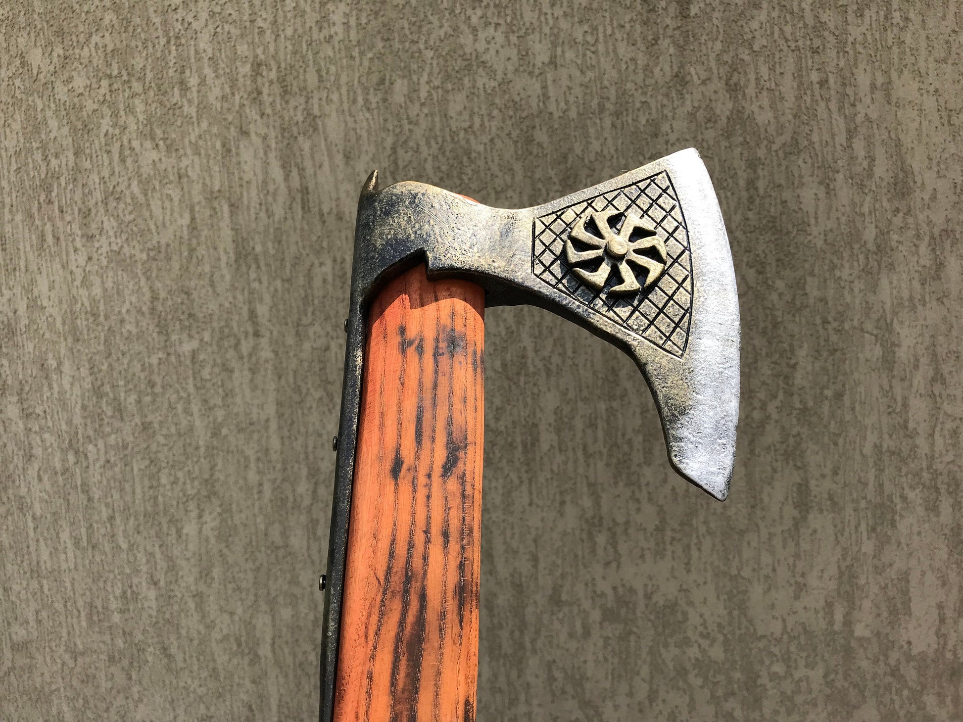 The main symbol of the axe head is Kolovrat (spinning wheel) placed on both side of the axe head.