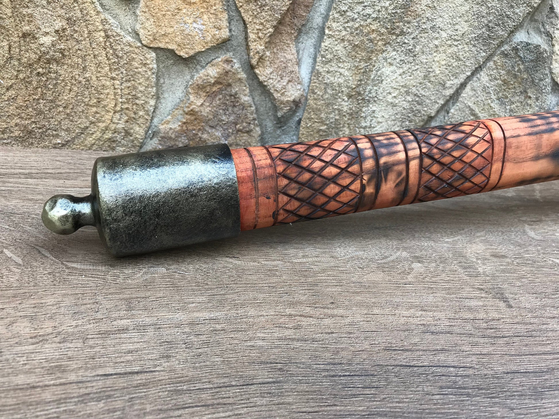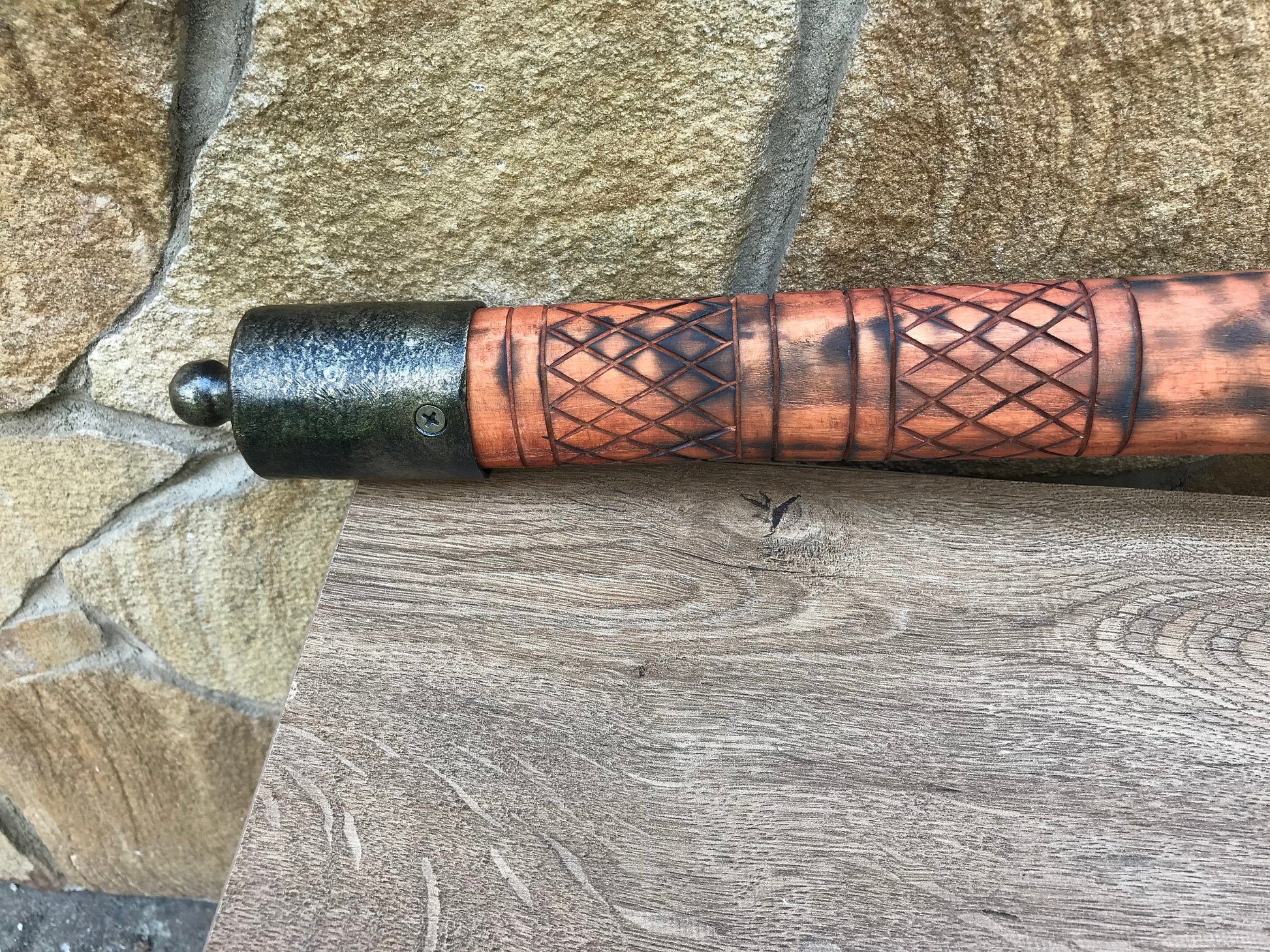 Color: axe head - painted in black and covered by bronze patina, handle - brown, partially burnt (aged), nicely carved handle.