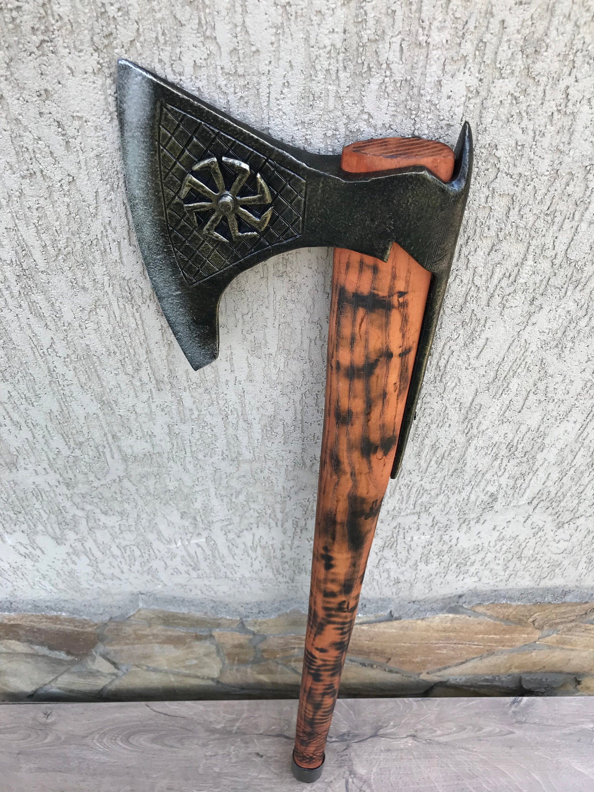 There might be some minor unevenness in the axe head since it is a hand work. It is not for real use, it is only a decor axe. I can make two hooks to hang the axe on the wall (no additional money for two nice hooks - just let me know if you need them).
