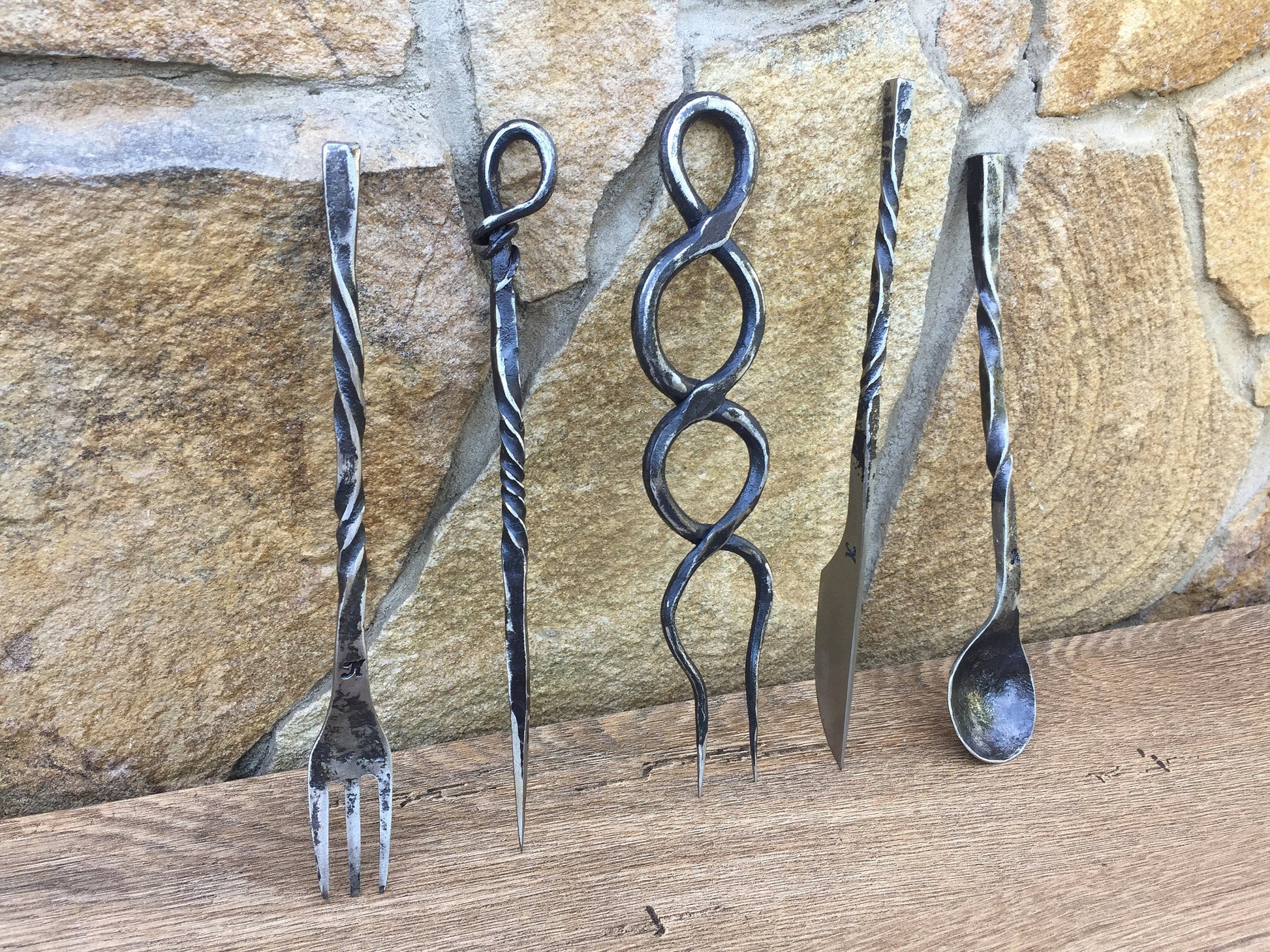 This rustic medieval cutlery is worked entirely by hand and made of hand forged iron. Hand forged in iron -- an elegant but rugged cutlery set, intended for use, while maintaining a pleasing aesthetic presence as well. These items are unique in form but universal in application, and will weather several generations of use. It might rust from time depending upon the way of storage, using and cleaning.
