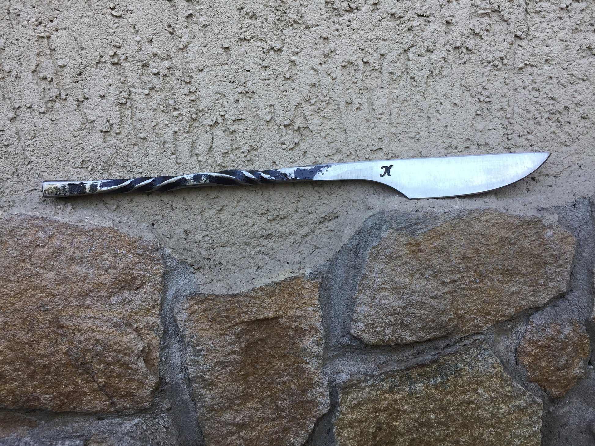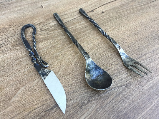 This rustic medieval cutlery is worked entirely by hand and made of hand forged iron. Hand forged in iron -- an elegant but rugged cutlery set, intended for use, while maintaining a pleasing aesthetic presence as well. These items are unique in form but universal in application, and will weather several generations of use. It might rust from time depending upon the way of storage, using and cleaning.