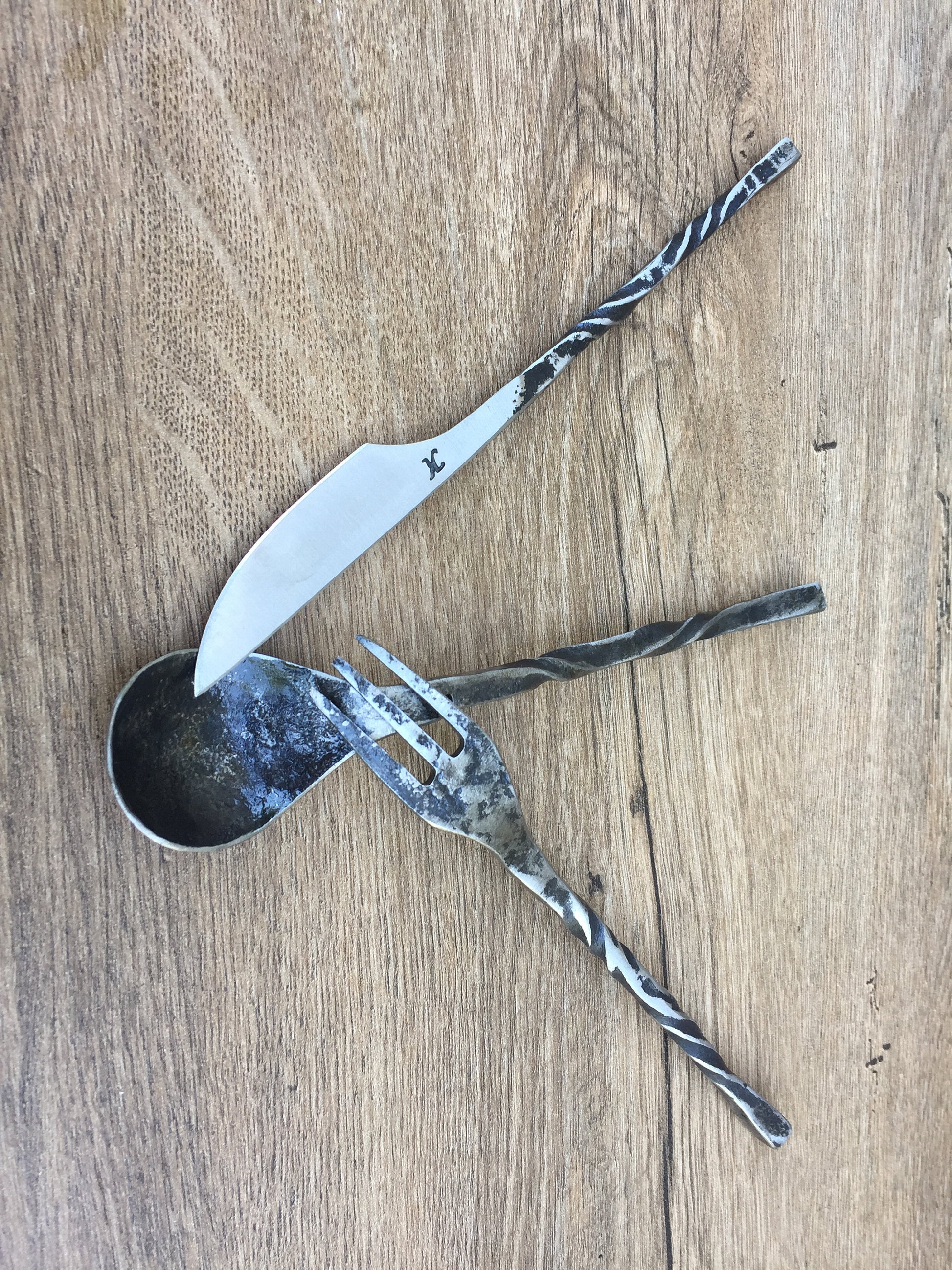 Forged cutlery set in the style of the Middle Ages - with spoon, fork, and knife.