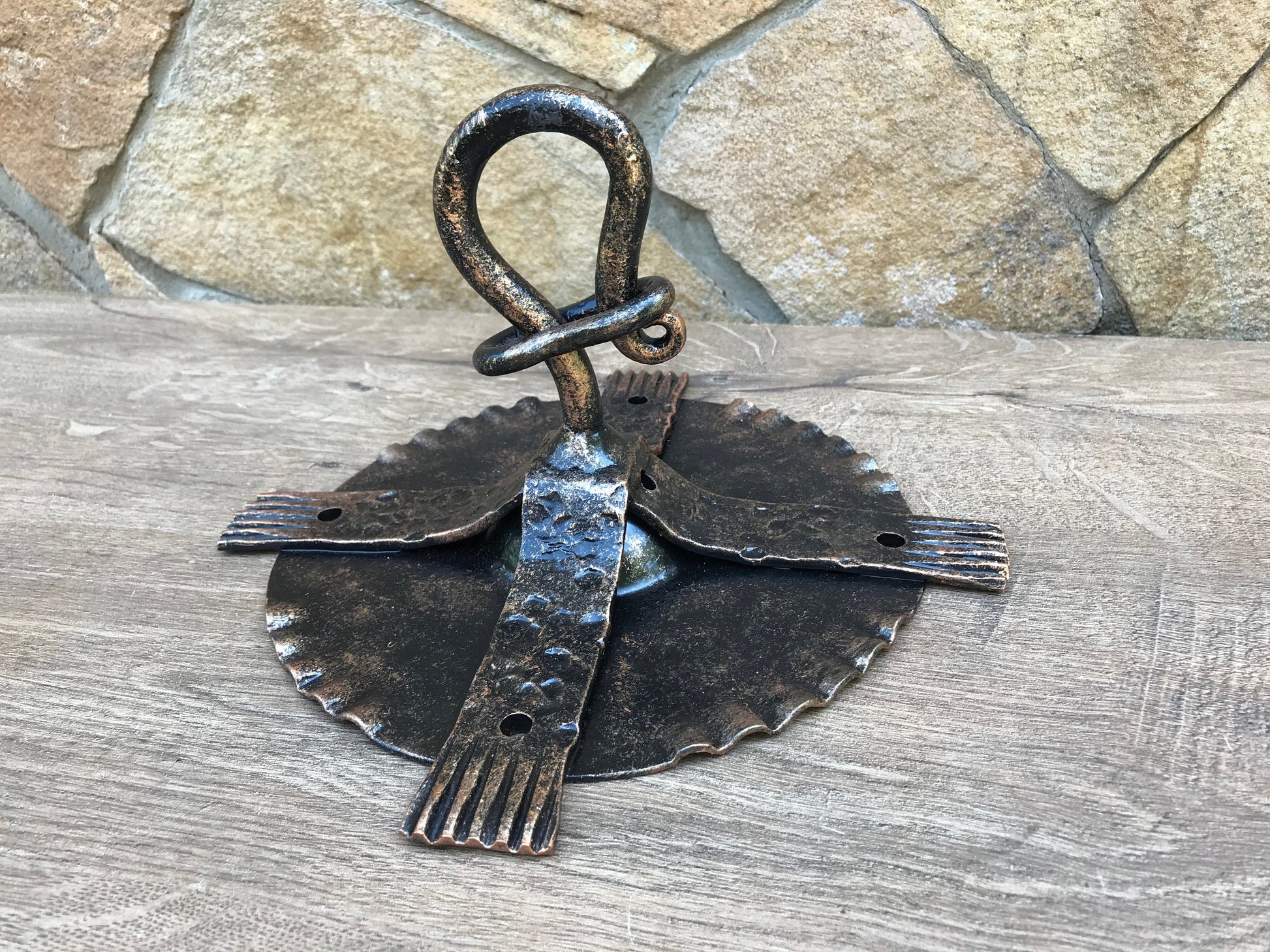 Here is a hand forged ceiling hook in a medieval style which can decorate your house. You can place it in an entryway, in a barn, in a garage, in a kitchen, in a bathroom, on a backside of a door - wherever you need to hang whatever.