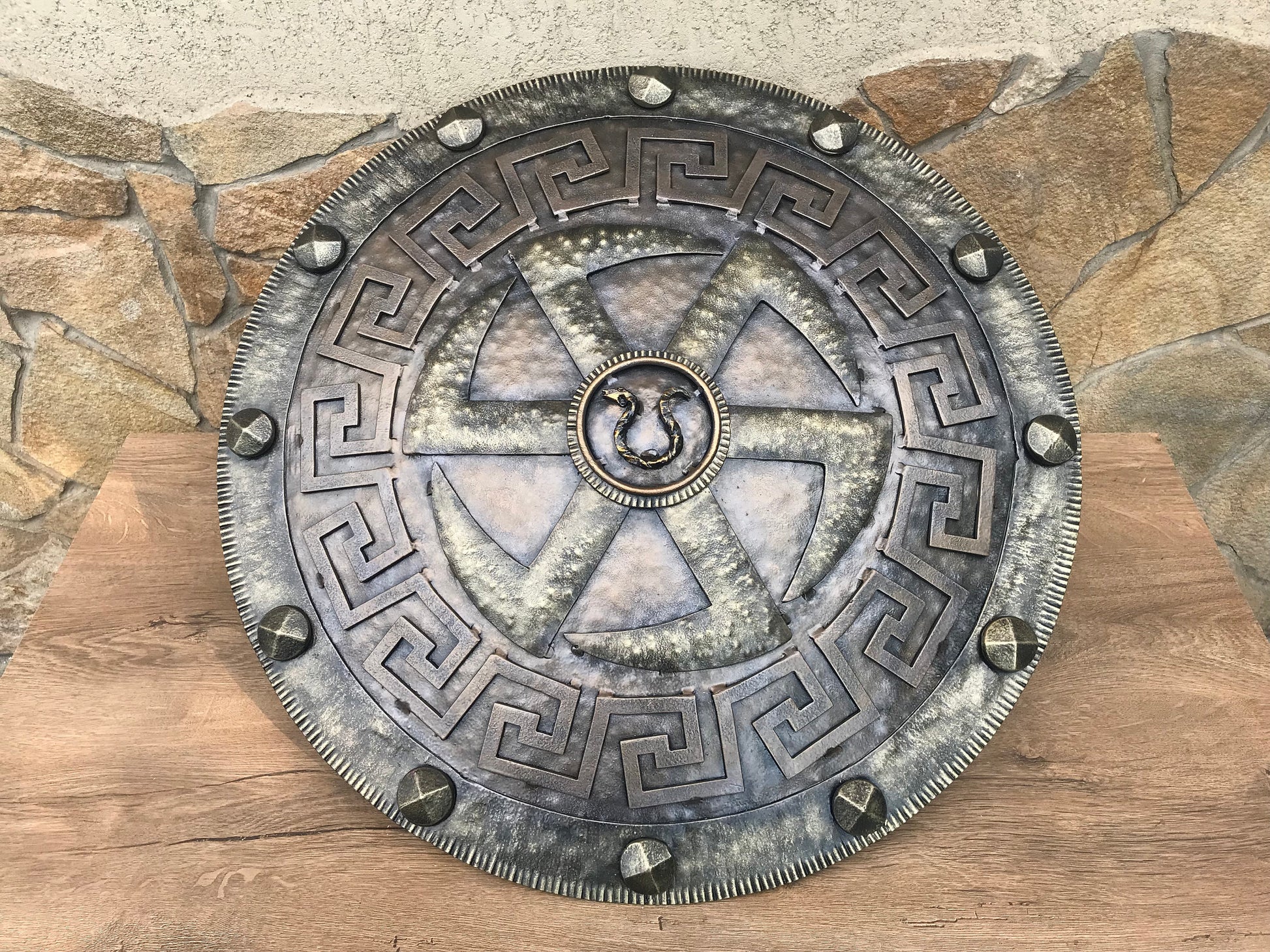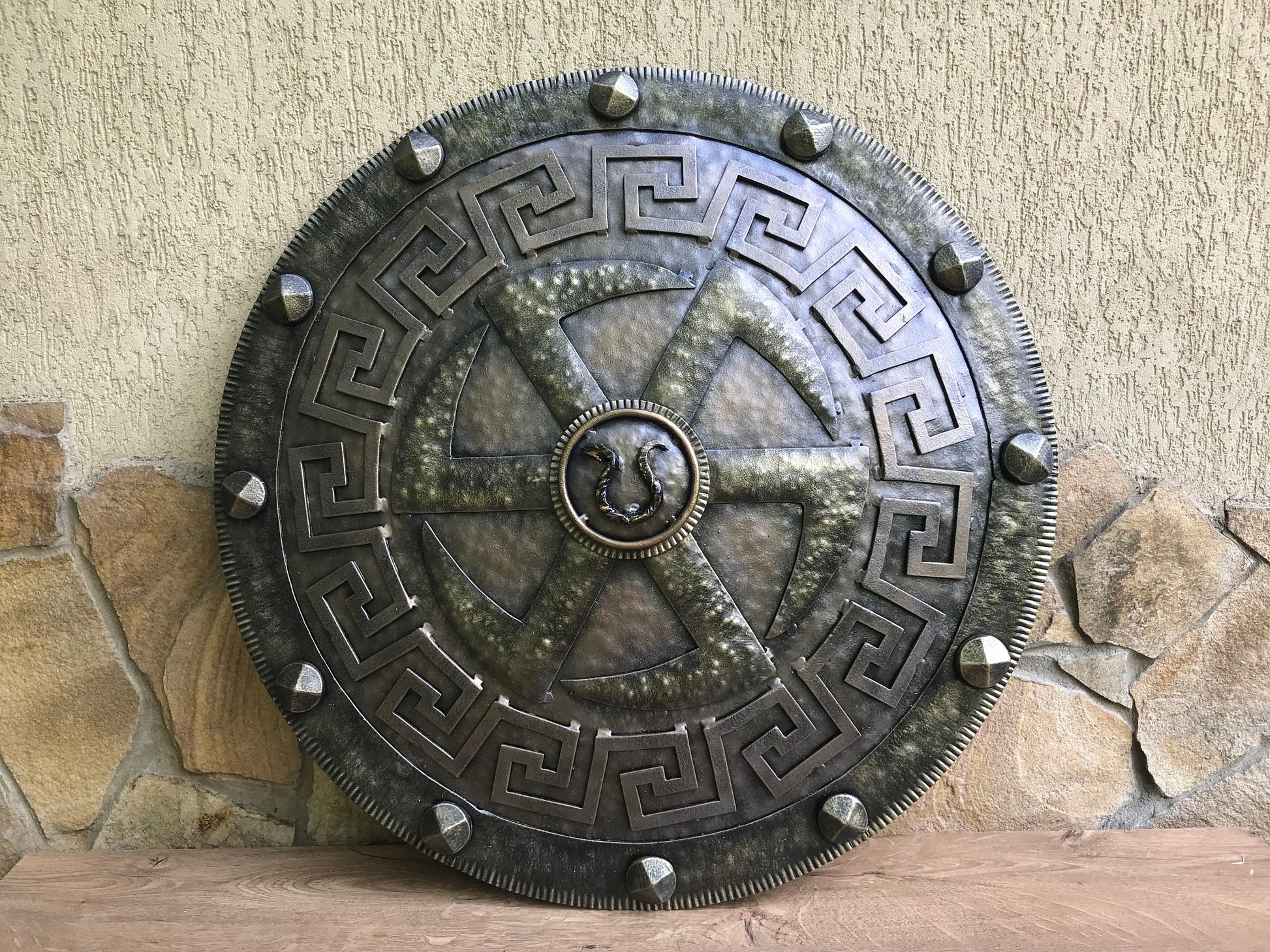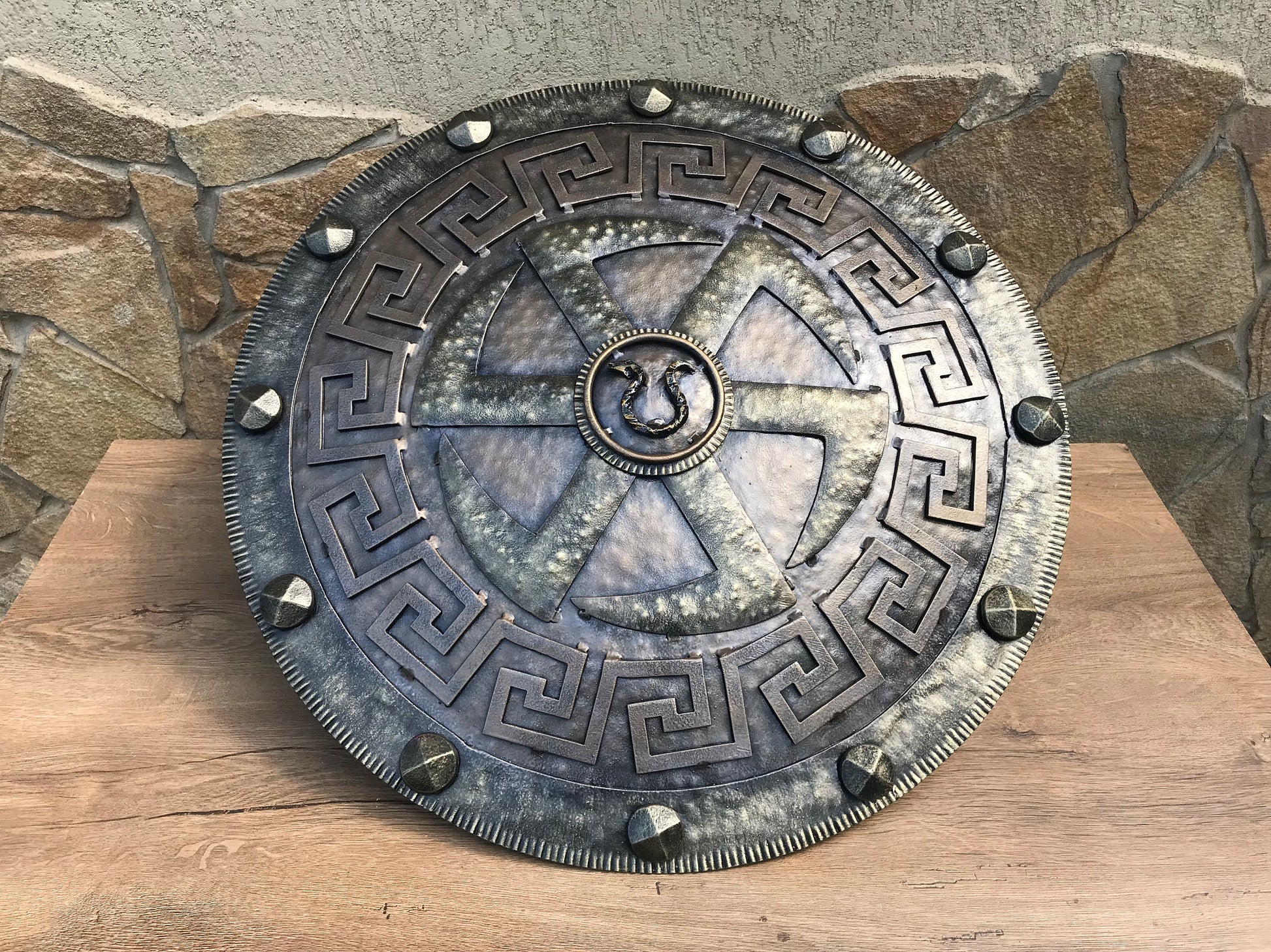 A shield for wall hanging. It has a symbol of spinning wheel inside of it. There is a snake in the shield center (from Kratos' snake ring axe holder). It will decorate/outline any room (man cave, viking style room, viking themed wedding, viking themed birthday, viking themed party ...). Your guests will be surprised by the beauty of the shield for sure.