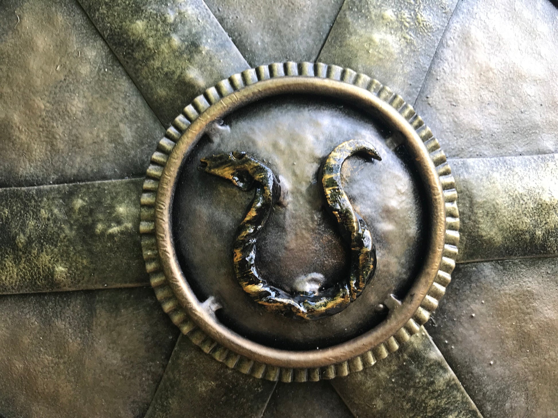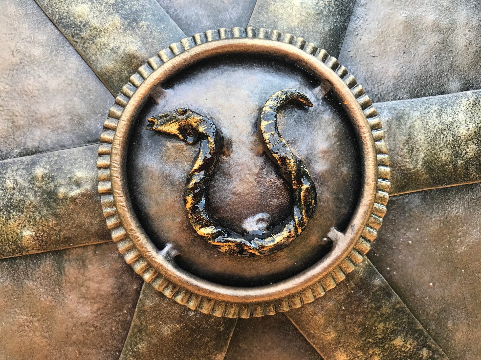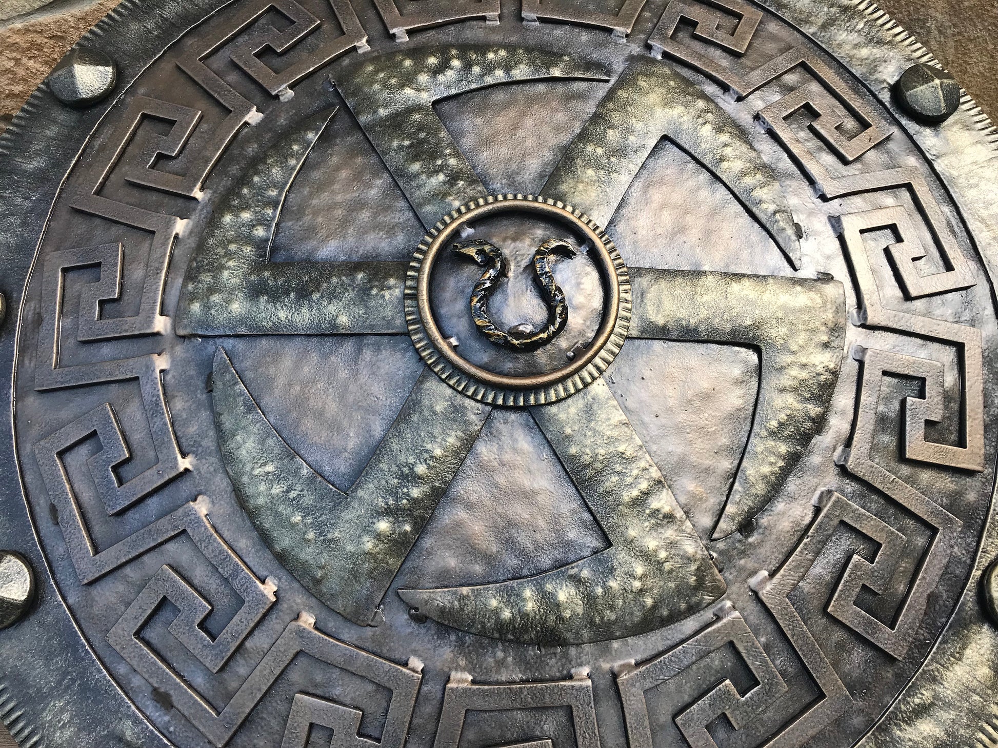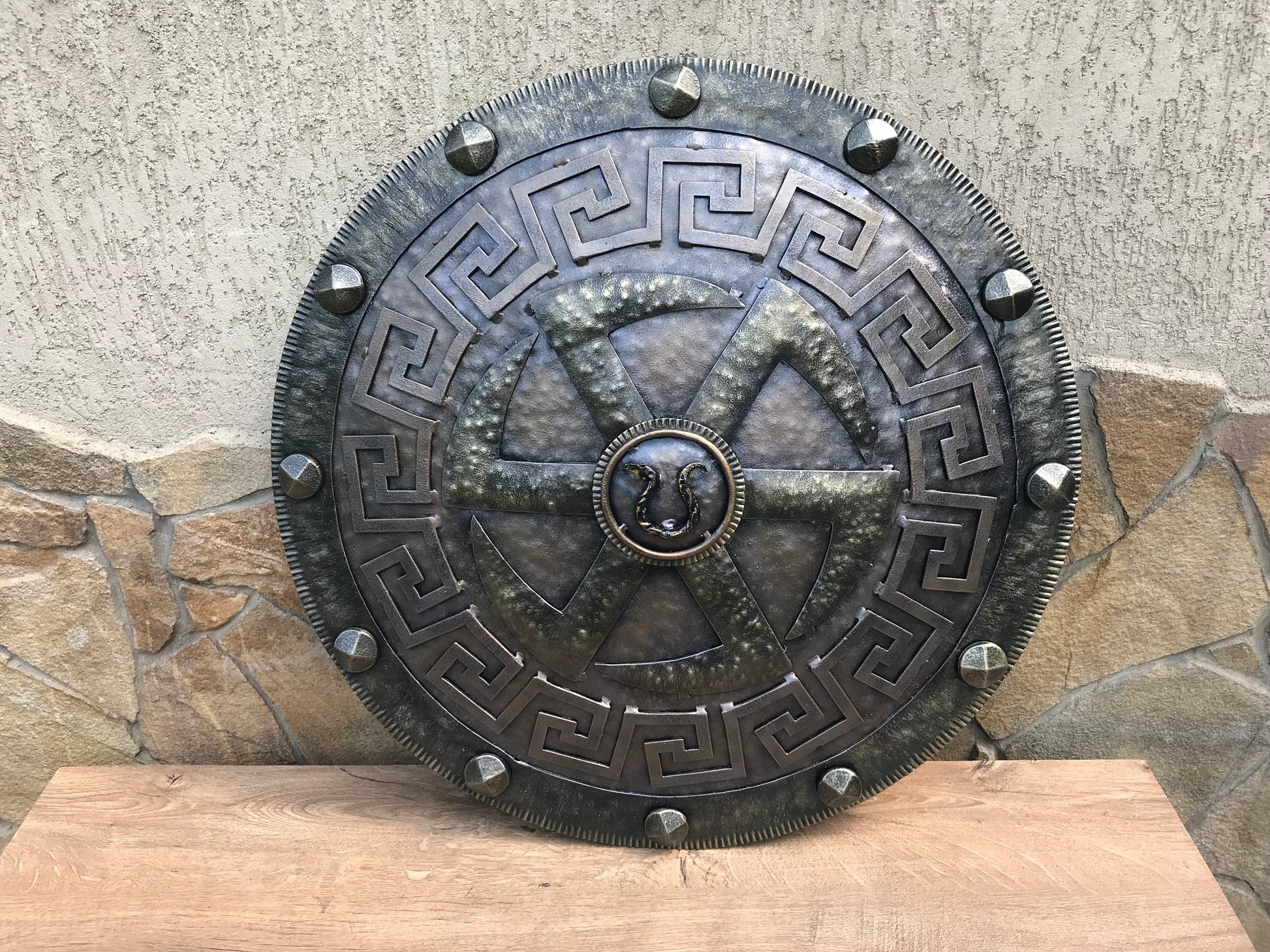 A shield for wall hanging. It has a symbol of spinning wheel inside of it. There is a snake in the shield center (from Kratos' snake ring axe holder). It will decorate/outline any room (man cave, viking style room, viking themed wedding, viking themed birthday, viking themed party ...). Your guests will be surprised by the beauty of the shield for sure.