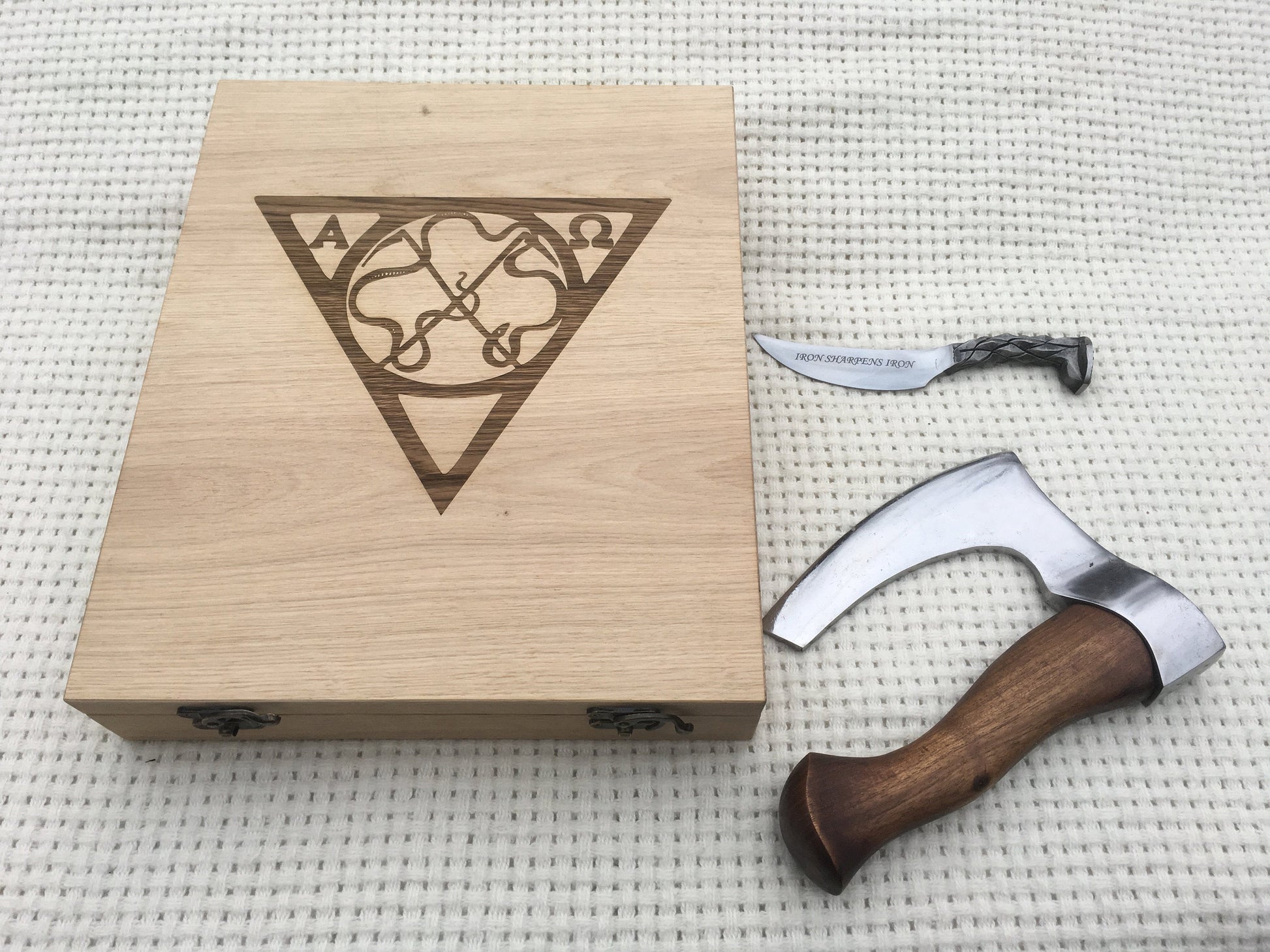 A GIFT SET - A KNIFE, AN AXE, A WOODEN BOX.