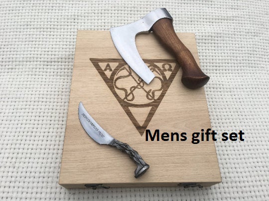 Price of the listing includes a wooden gift box, any engraving on a top of the wooden gift box (logo, image, name/date, message - please send me this info while ordering), a knife with an engraved blade (please send me the info on name/date, initials, short message - for blade engraving), the axe.