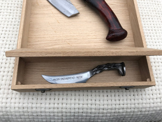 A GIFT SET - A KNIFE, AN AXE, A WOODEN BOX.