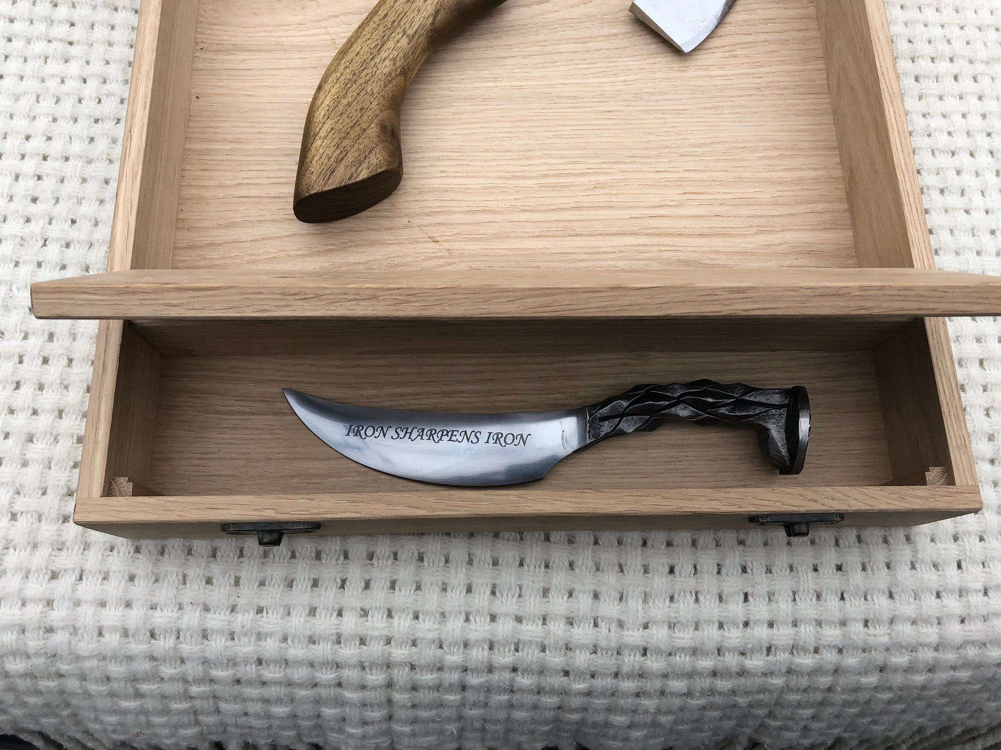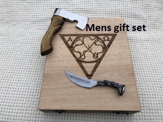 Here is a mens gift set: a knife with a curved handle/blade (a handle surface texture - in a view of pine-apples) and with engraving on a blade, an axe and a wooden box (with a compartment for a knife and a compartment for an axe, with the compartment for the knife having its own lid). This is a great groomsmen gift, corporate gift, usher gift, groom gift, father of the bride gift, 6th anniversary gift (iron year), 11th anniversary gift (steel year), Father's Day, Christmas gift for a grandfather or any other gifting occasion.