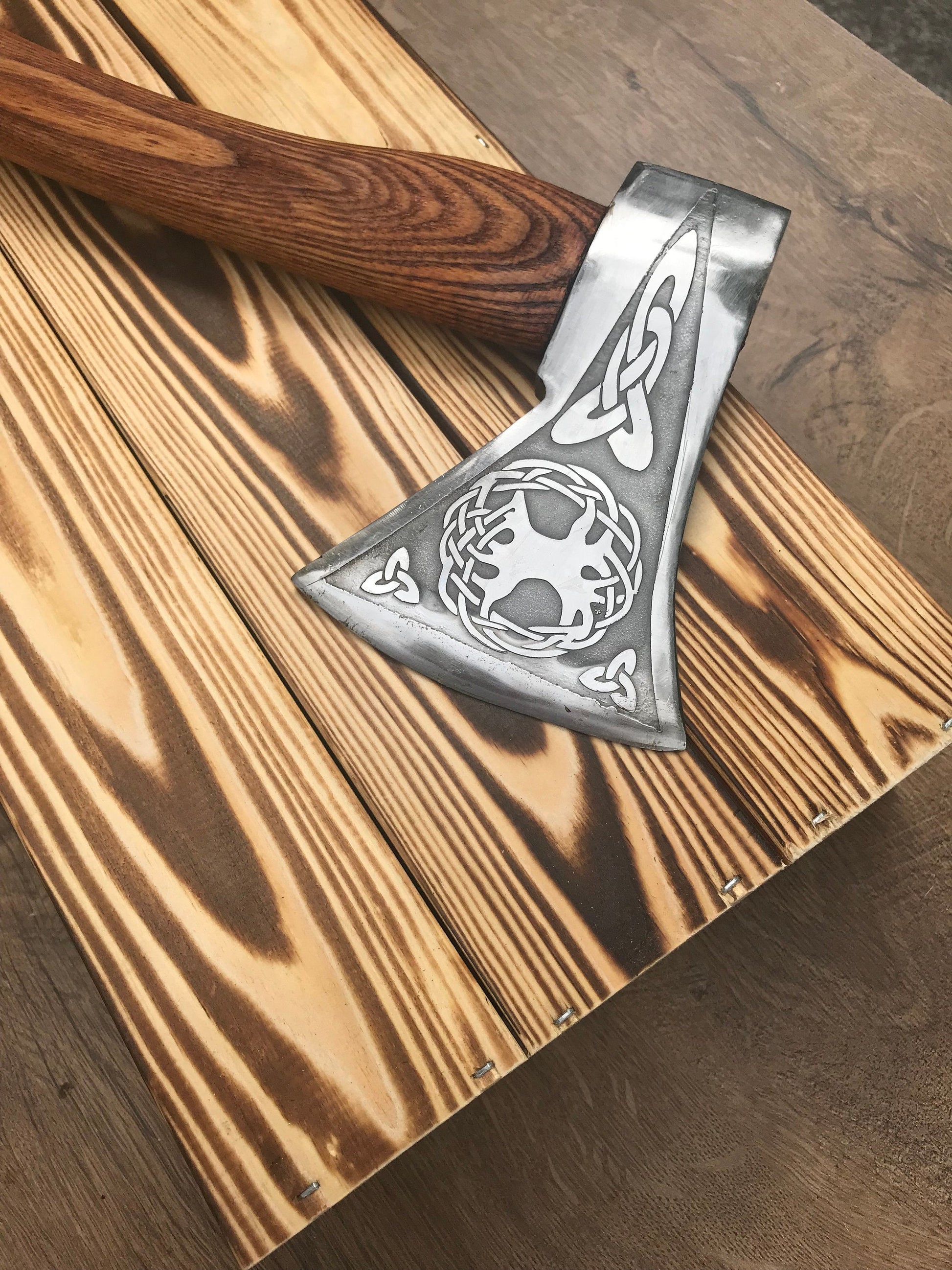 A compact outdoors axe, engraved with Tree of Life and Celtic signs (Celtic knots), hand-forged and made from carbon steel using traditional blacksmith methods. The steel is stuck several times, increasing its density and thereby the durability of the axe. Perfect for packing in a rucksack, the axe can also be worn on a belt. It will be a perfect companion in your ventures through the wilds, through the woods of the pacific northwest, or at the cabin to make kindling to warm your hearthside. It has a wooden stump.