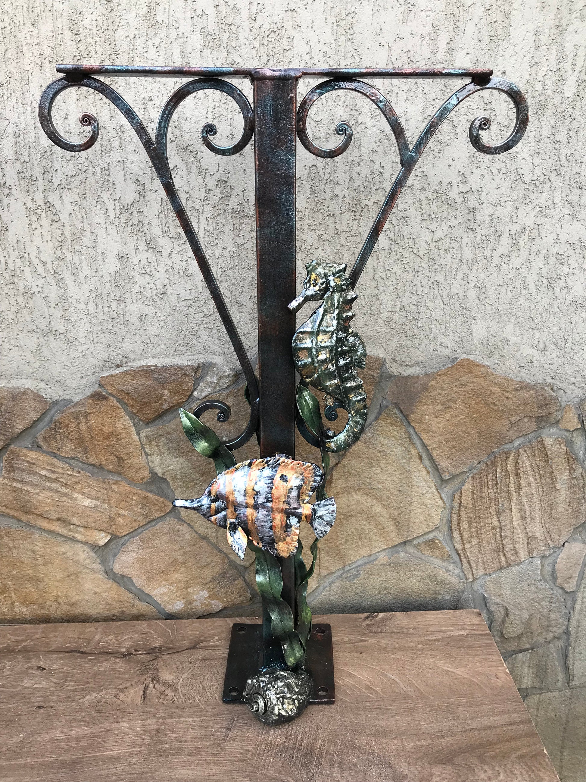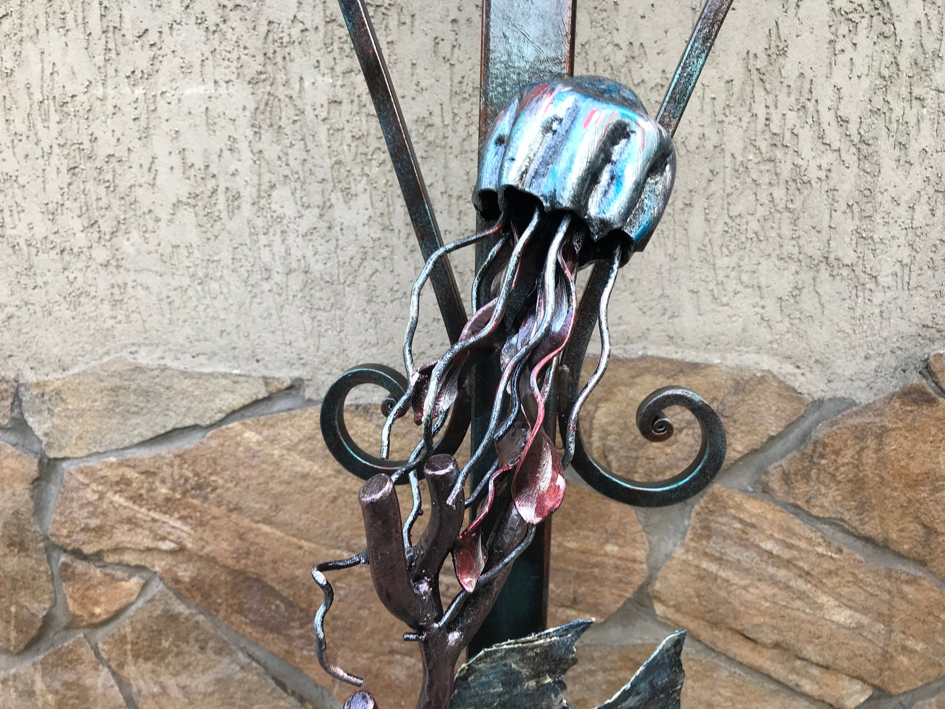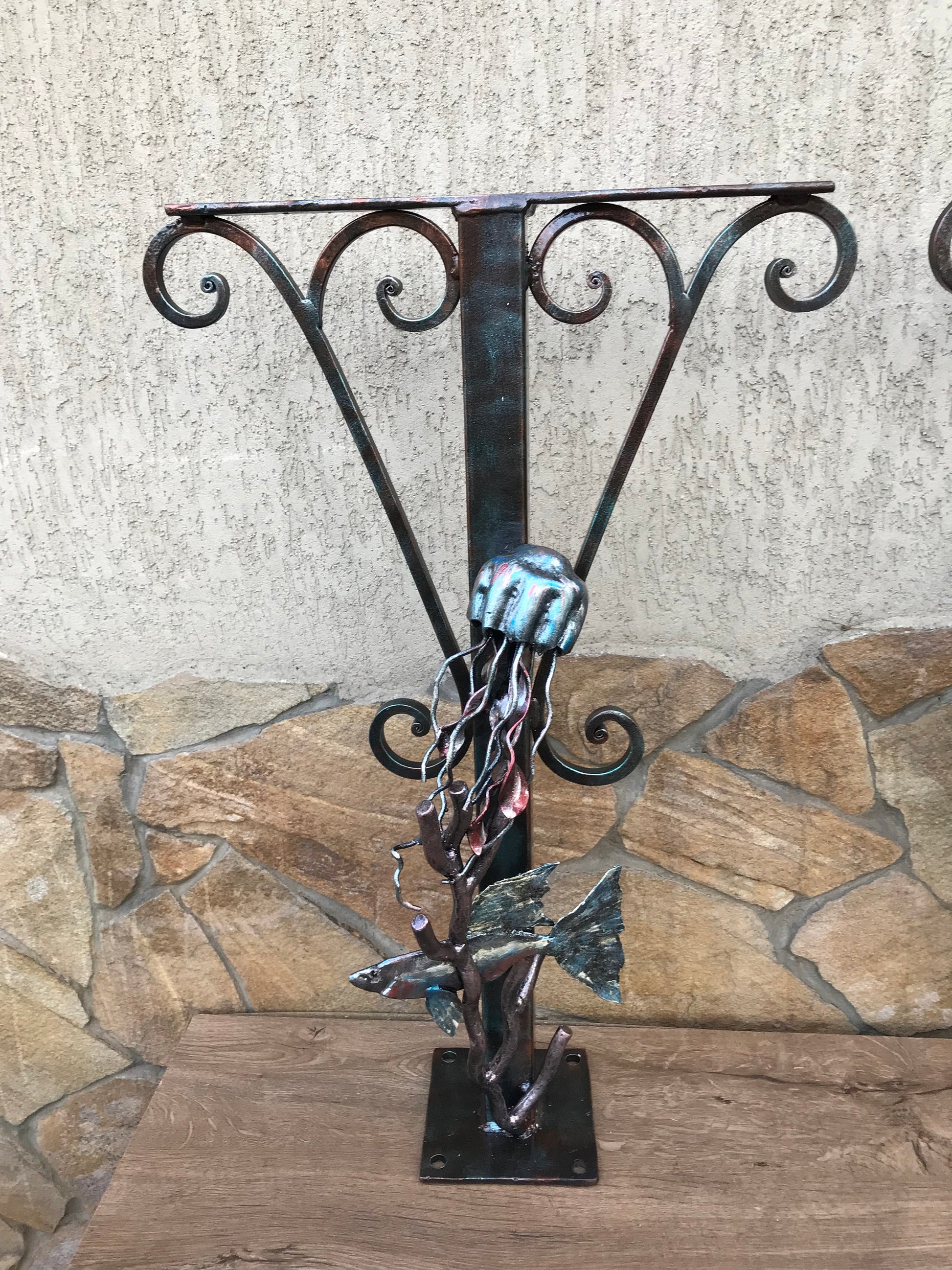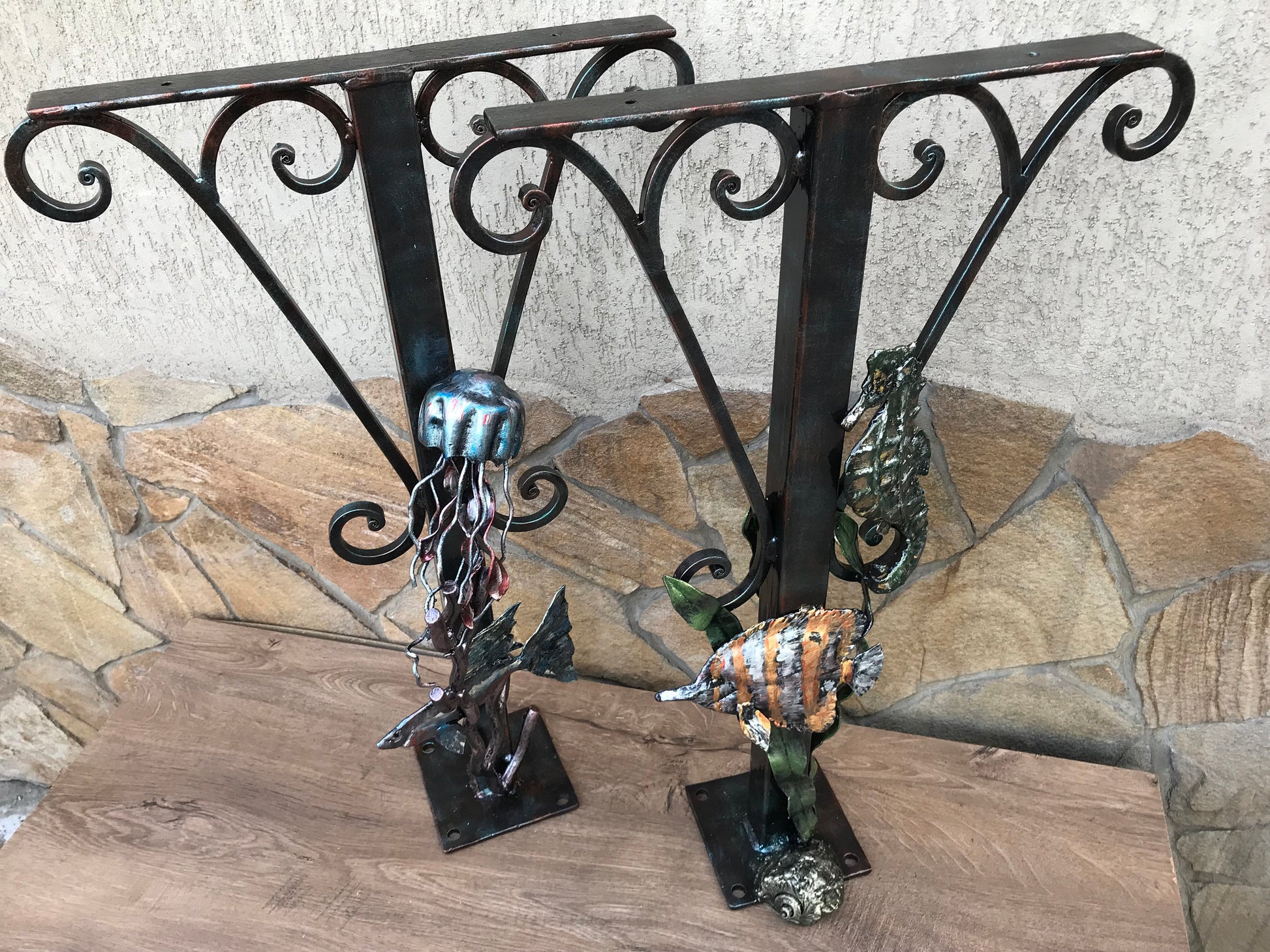 Here is a a set of two hand forged table legs in the ocean theme. You can put on it a table top to use it as a kitchen table, dinner table. You will not find anything similar to it. It is made in the technique of the artistic forging (with jellyfish, seahorse, seaweeds, 2 different fishes, shell, a branch of coral). It will decorate any place where it stands. It is a high quality forging work!