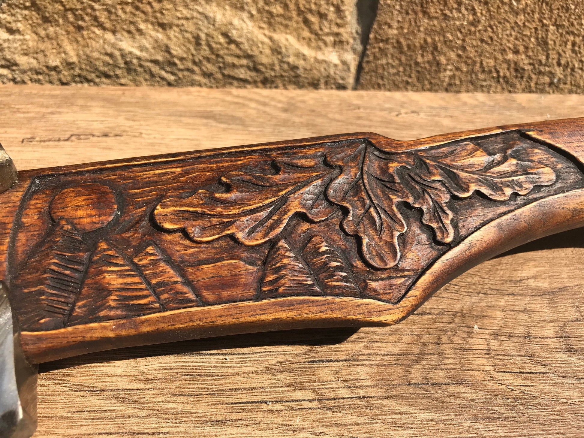 AN AXE WITH A DECORATIVE HANDLE IN A VIEW OF A BEAR HEAD AND A NICE HANDLE SURFACE STRUCTURE (OAK LEAVES WITH ACORNS)