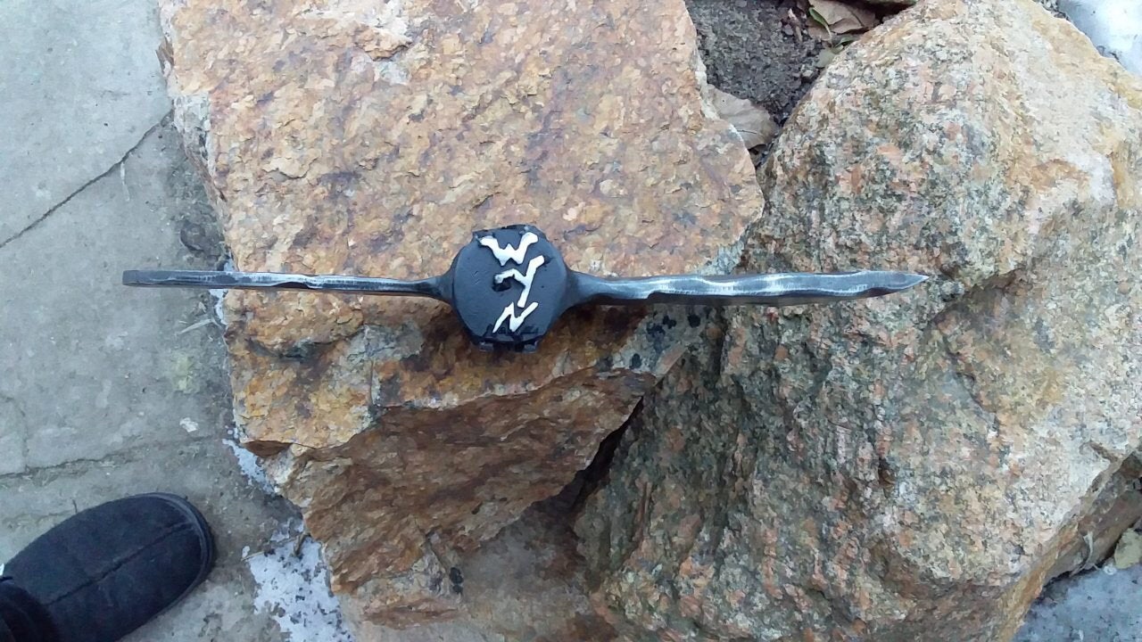 A compact outdoors axe, with engraved three initials on an axe head, hand-forged and made from carbon steel using traditional blacksmith methods. The steel is stuck several times, increasing its density and thereby the durability of the axe. It will be a perfect companion in your ventures through the wilds, through the woods of the pacific northwest, or at the cabin to make kindling to warm your hearthside. It has a wooden stump.