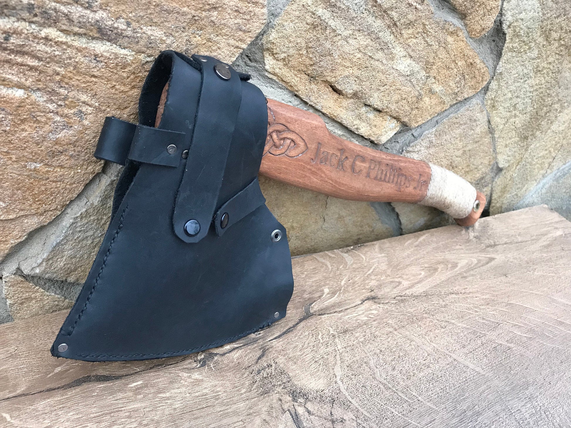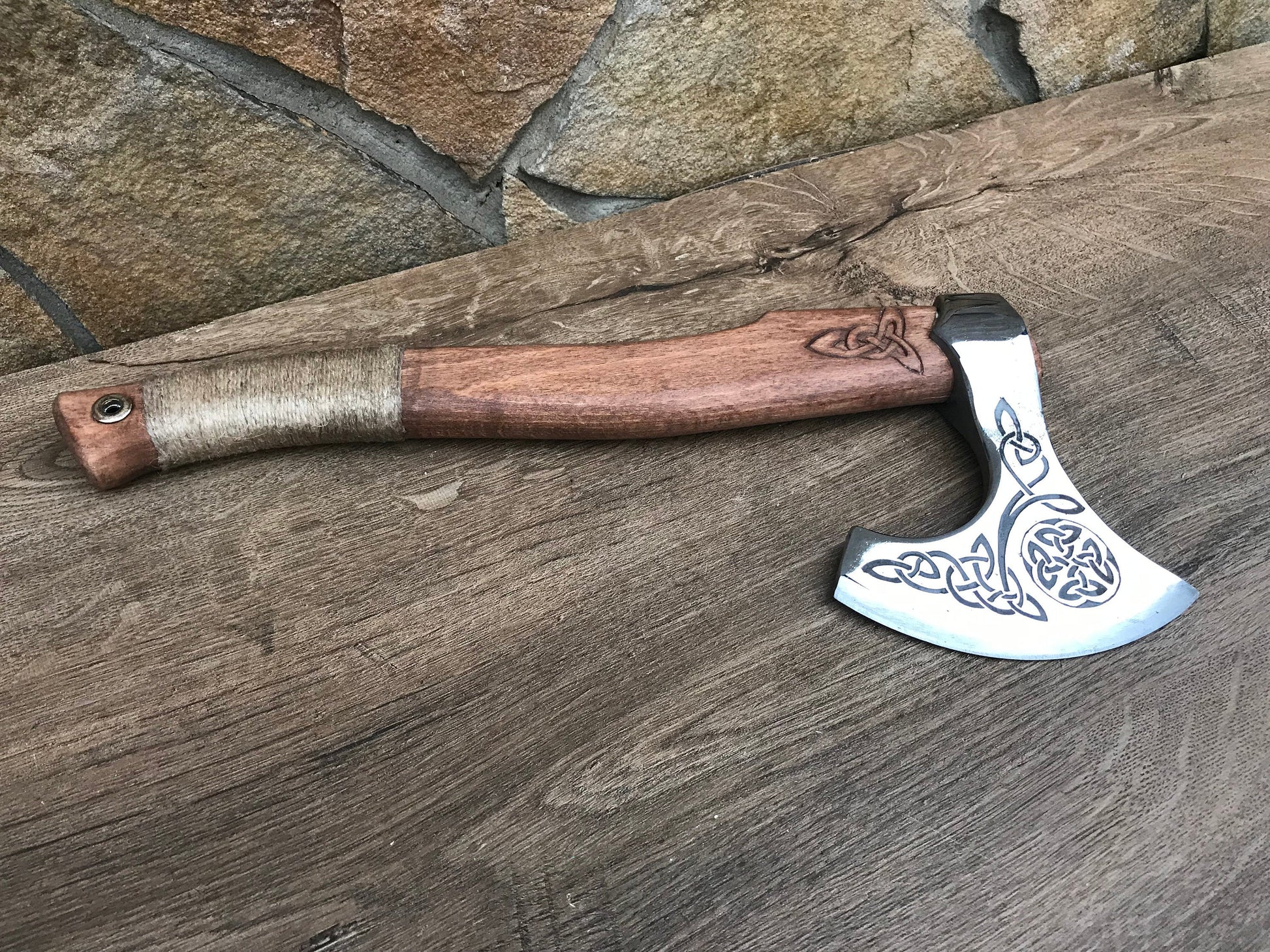 Color of the handle: dark brown. It has a nicely forged axe head, nice carved drawing on a handle. Personalization is carved on the handle.