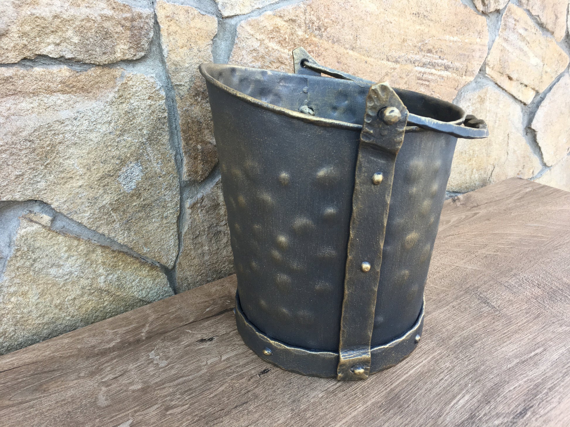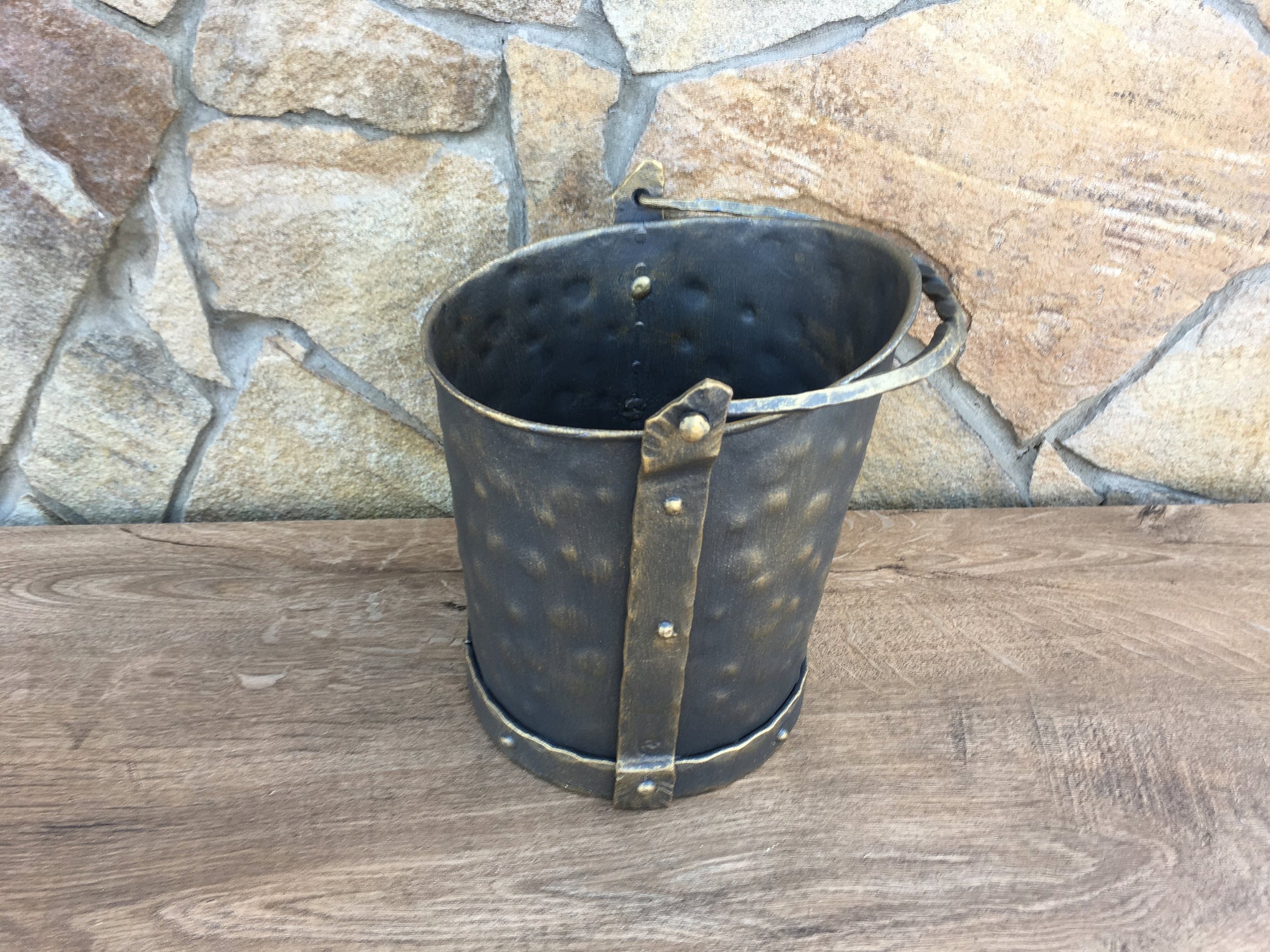 This is a great forged bucket with a hammered twisted handle that could be used for firewood storage, fireplace (keeping ash) or kitchen display, or even as a planter. It has numerous artificial dents to get it aged. A very lovely coal pail.