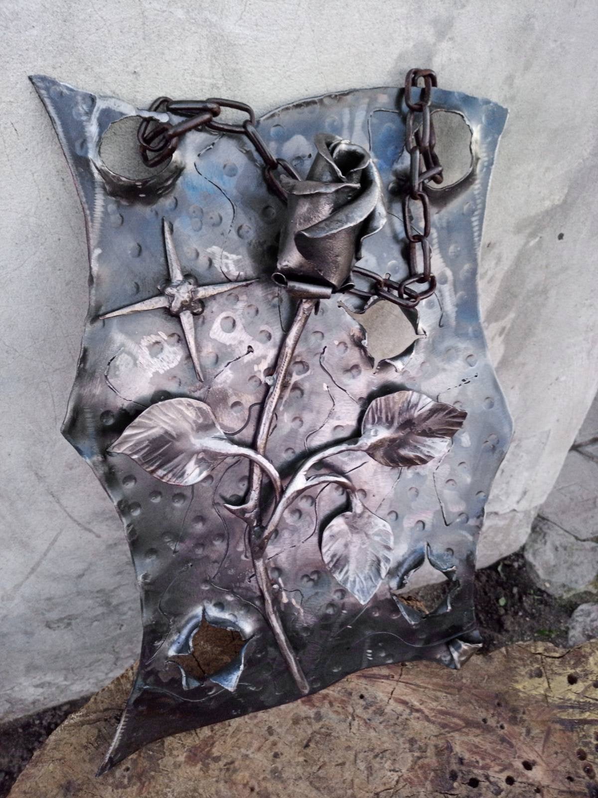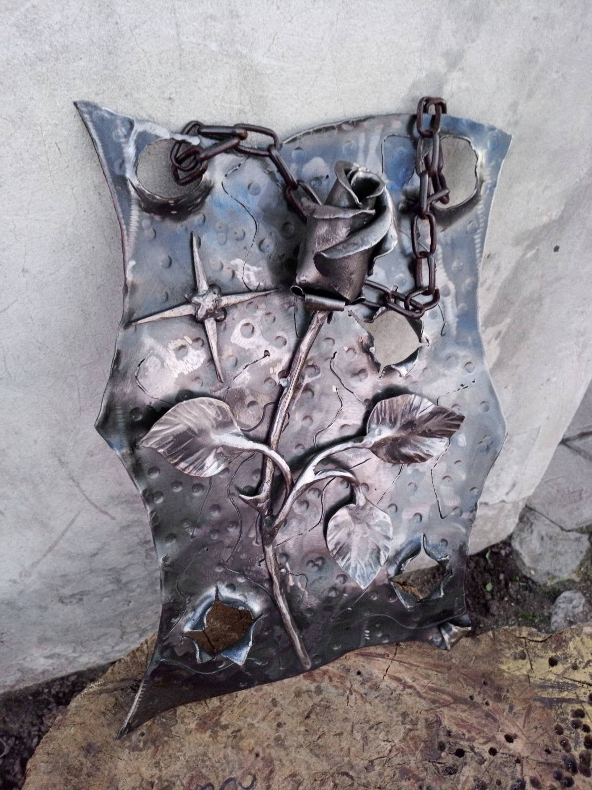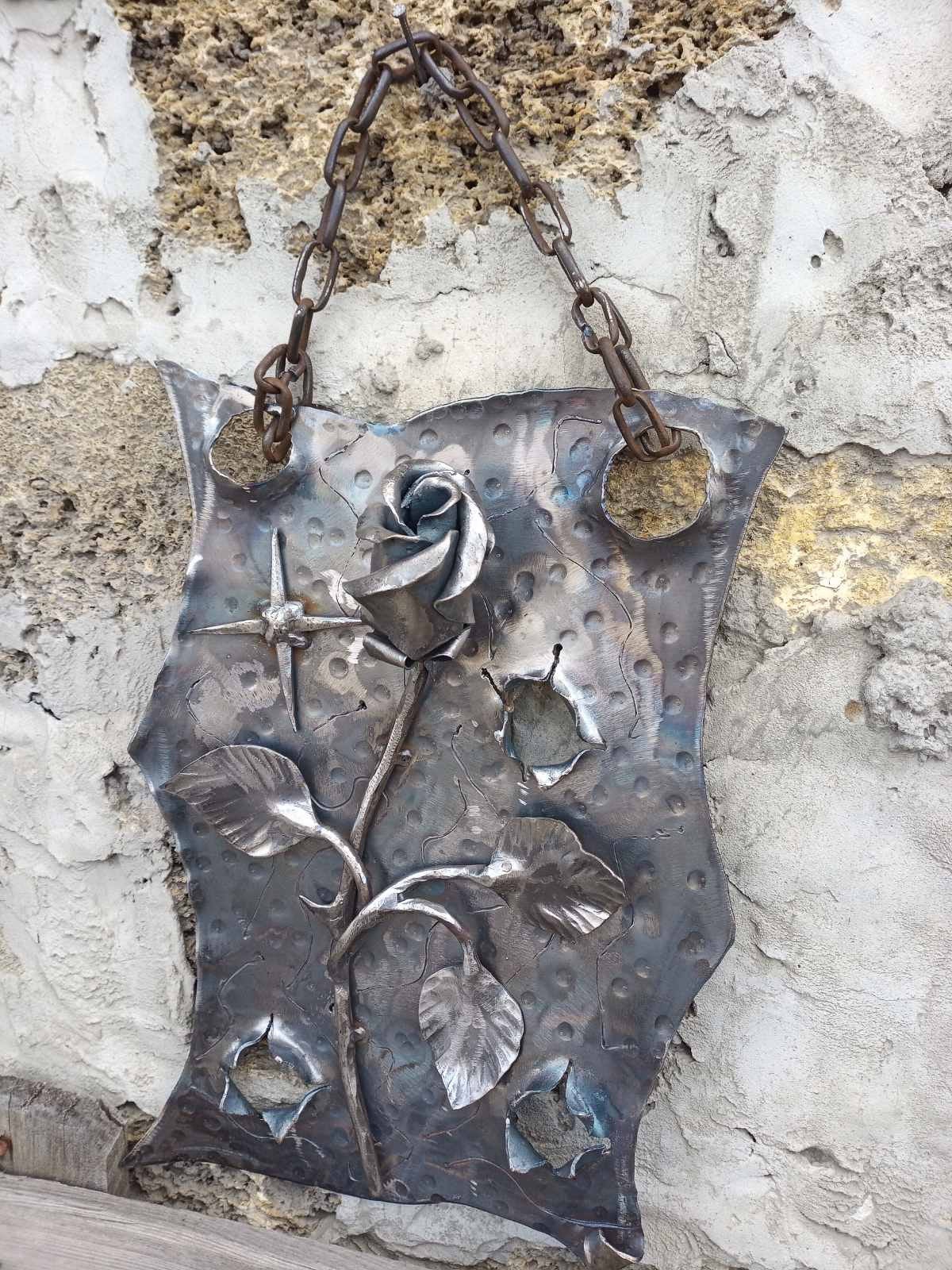 Are you looking for a nice wedding anniversary gift (6th anniversary/iron anniversary)? Valentine's day gift? Wedding gift? Birthday gift? Or just a home decor? Here is a hand forged rose on a metal plaque hanging on a chain which could be a nice gift for your girl/woman. It looks very festive and decorative! It is done in the technique of the artistic forging. It deserves to be a cool gift!