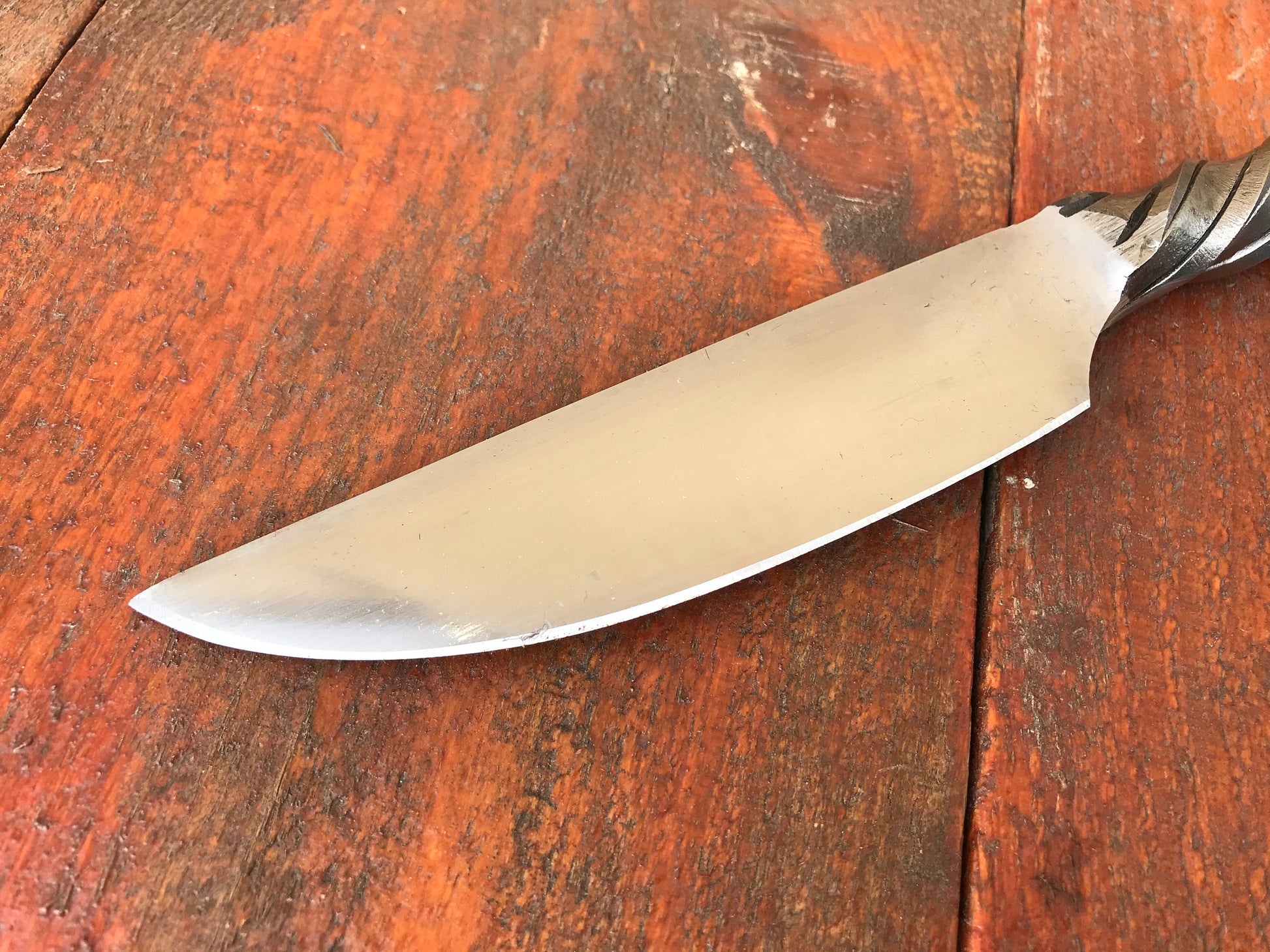 Railway nail is 100% forged by hand and hammer. The knife blade is of hardened steel and it is very hard, the knife is sharpened. Knife is partly polished to highlight steel deep metallic luster. Each knife is unique and unrepeatable.