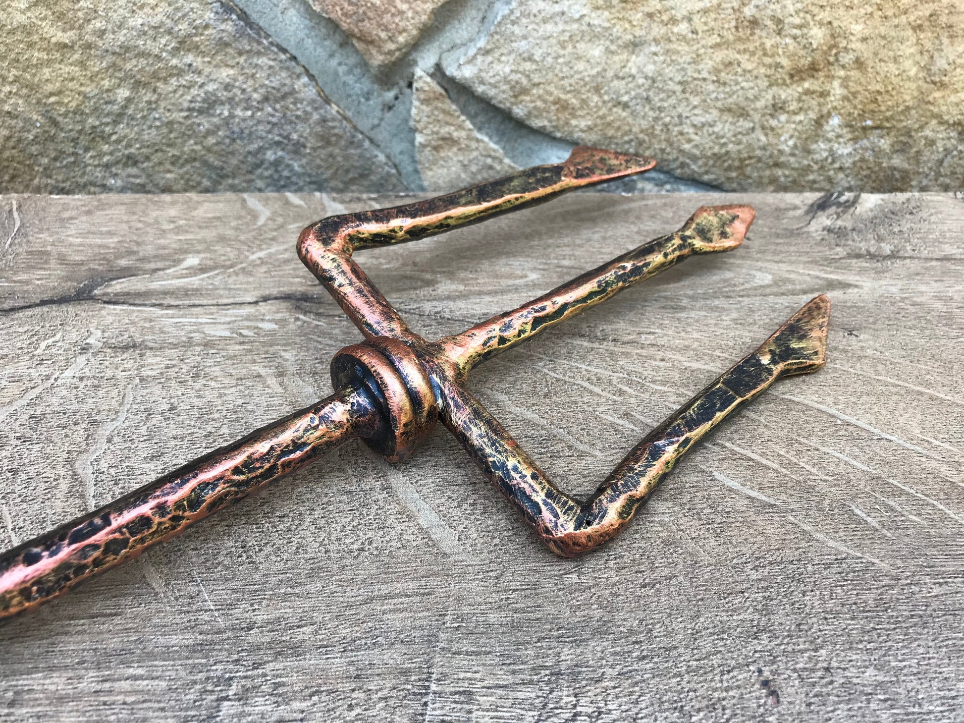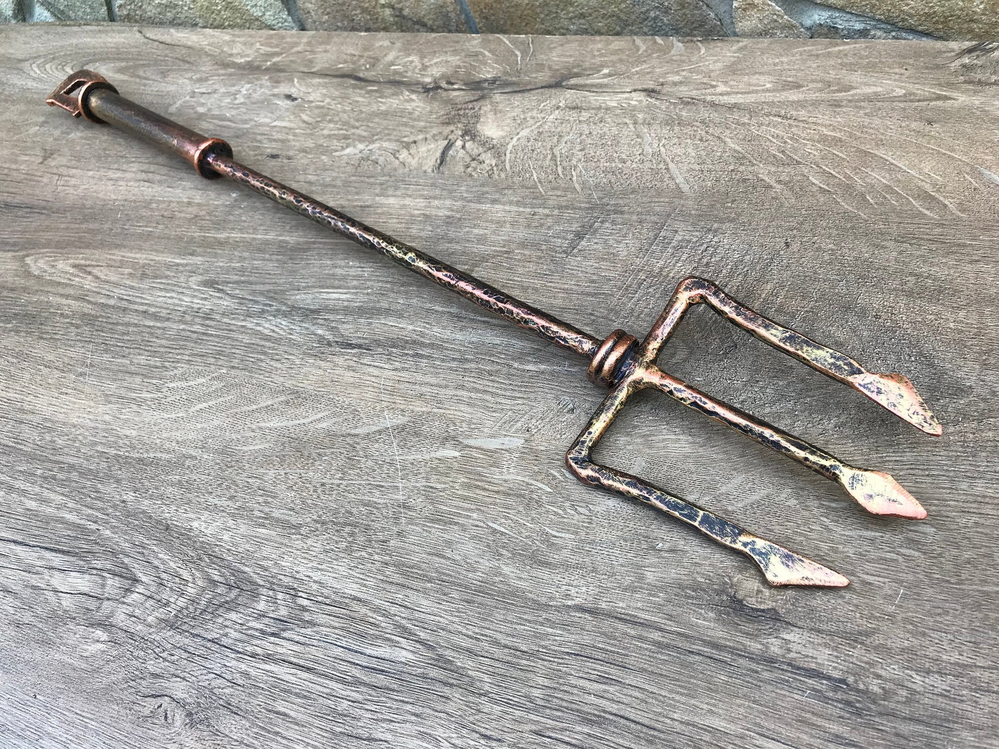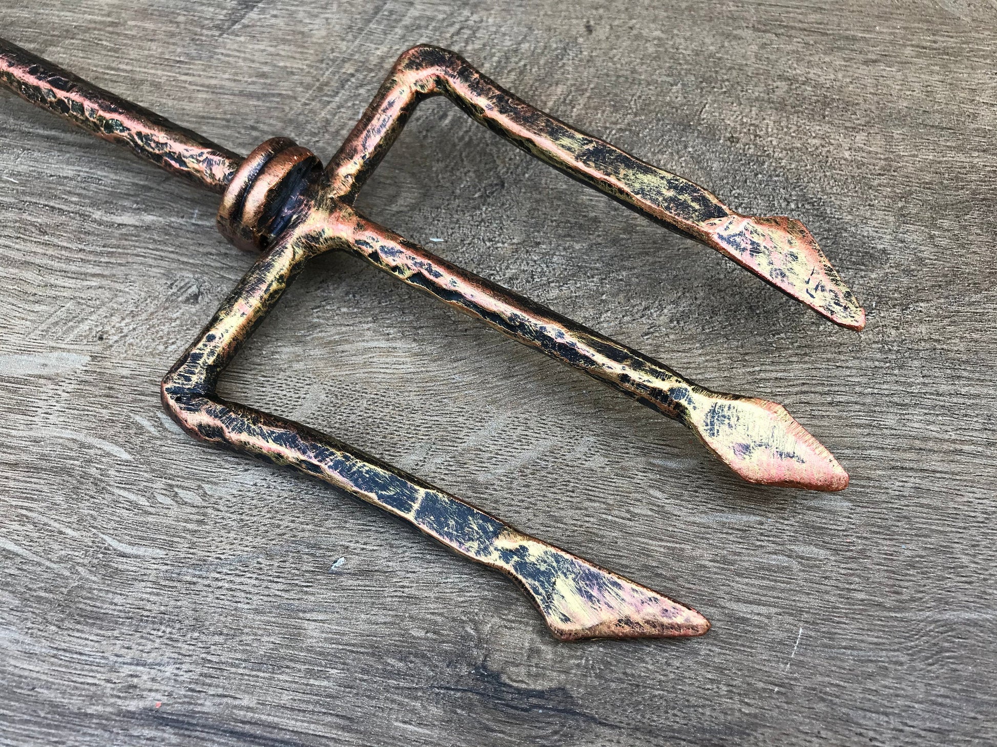 Here is a hand forged trident with one initial on a handle top (any initial can be done). You can use it in a cosplay or as a home decor.