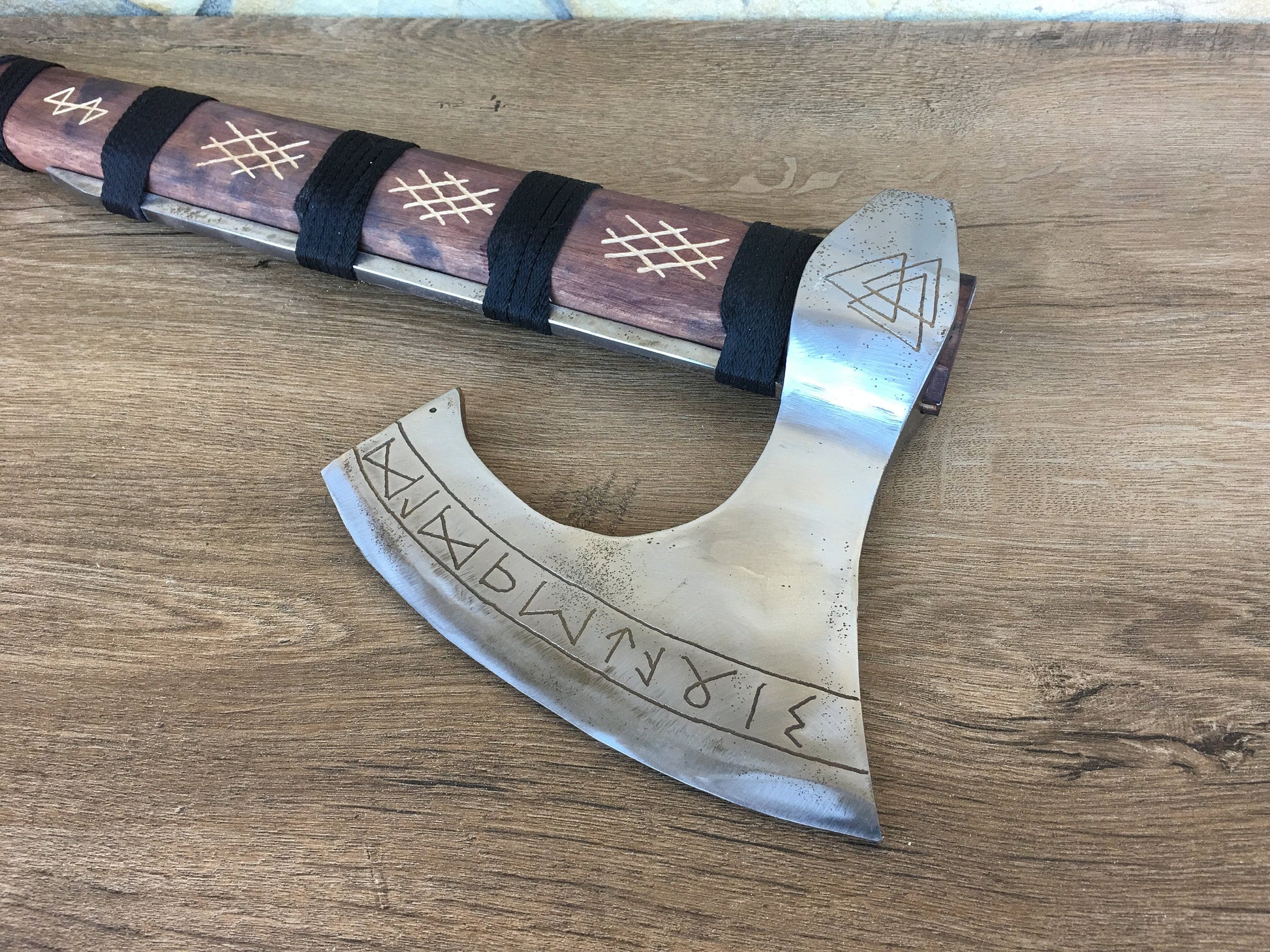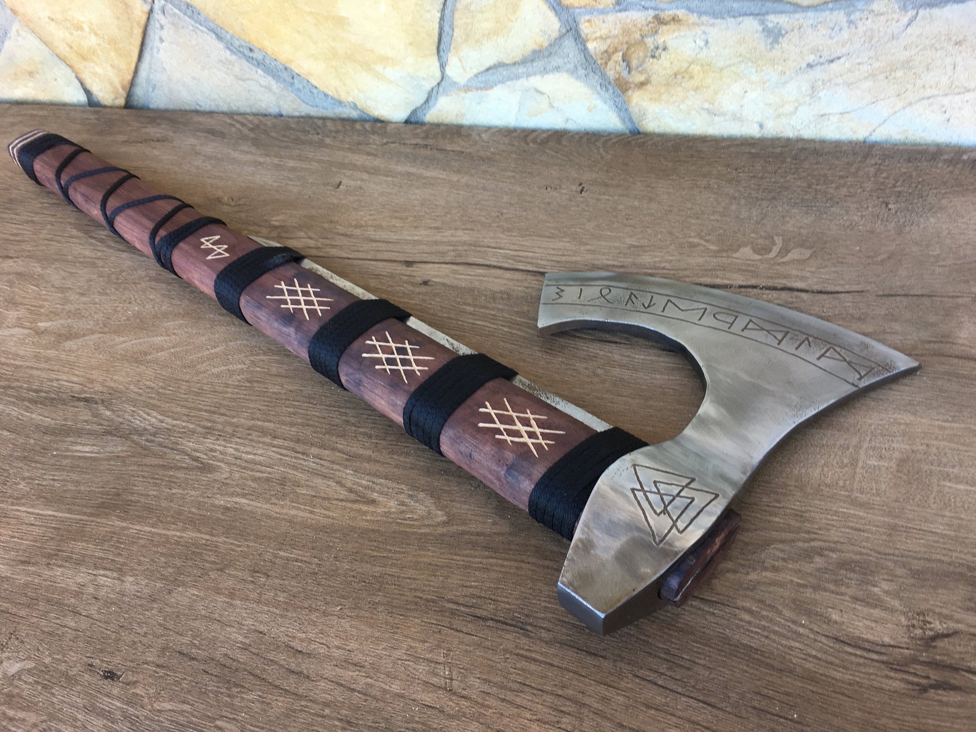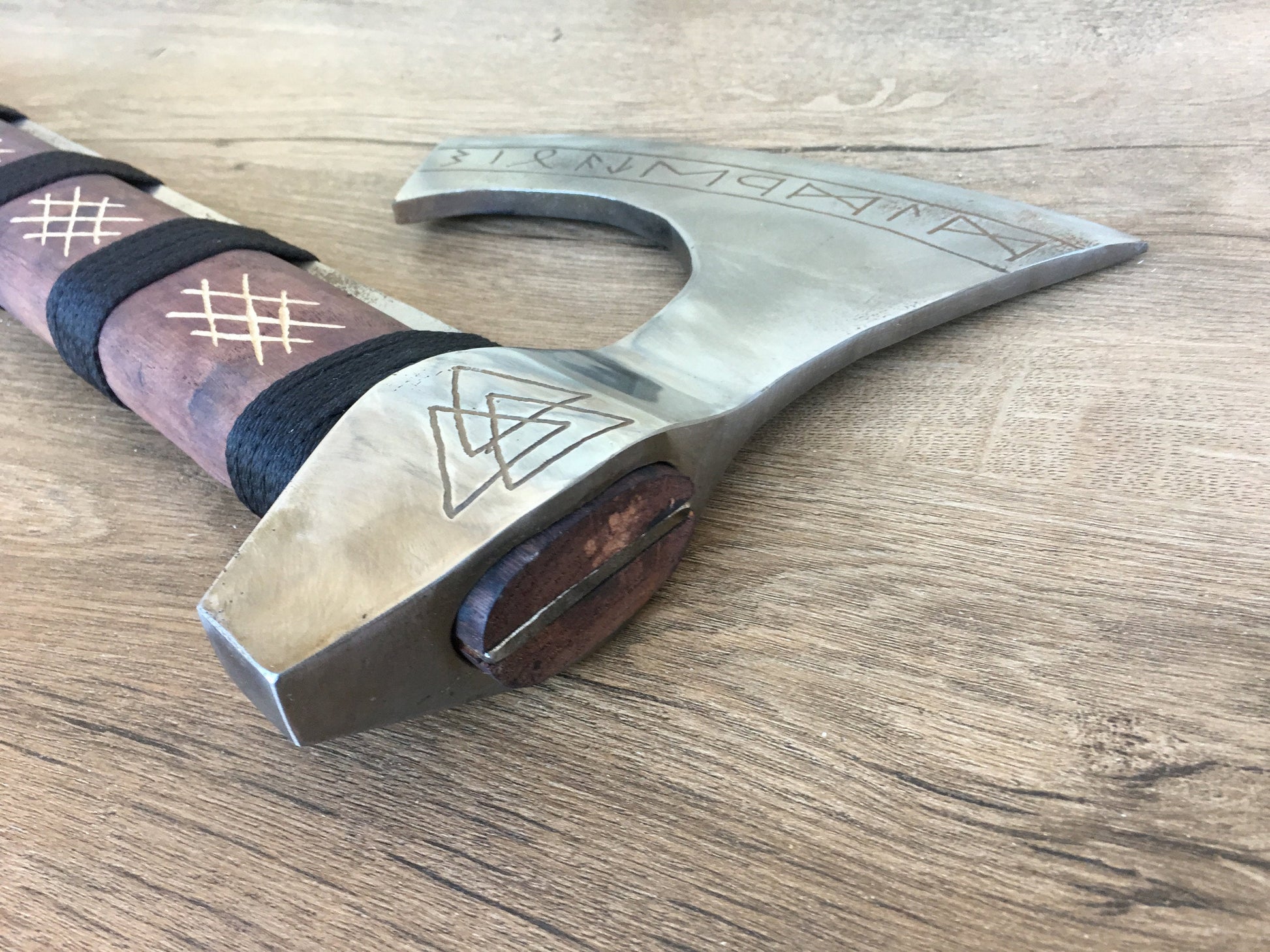 The axe head is done very decoratively, engraved with both sides of the handle and the axe head.