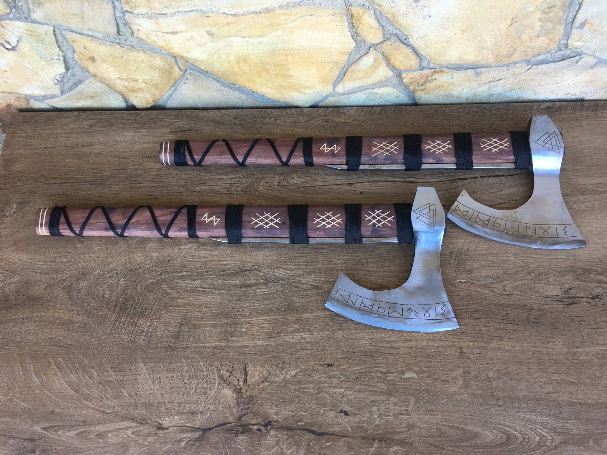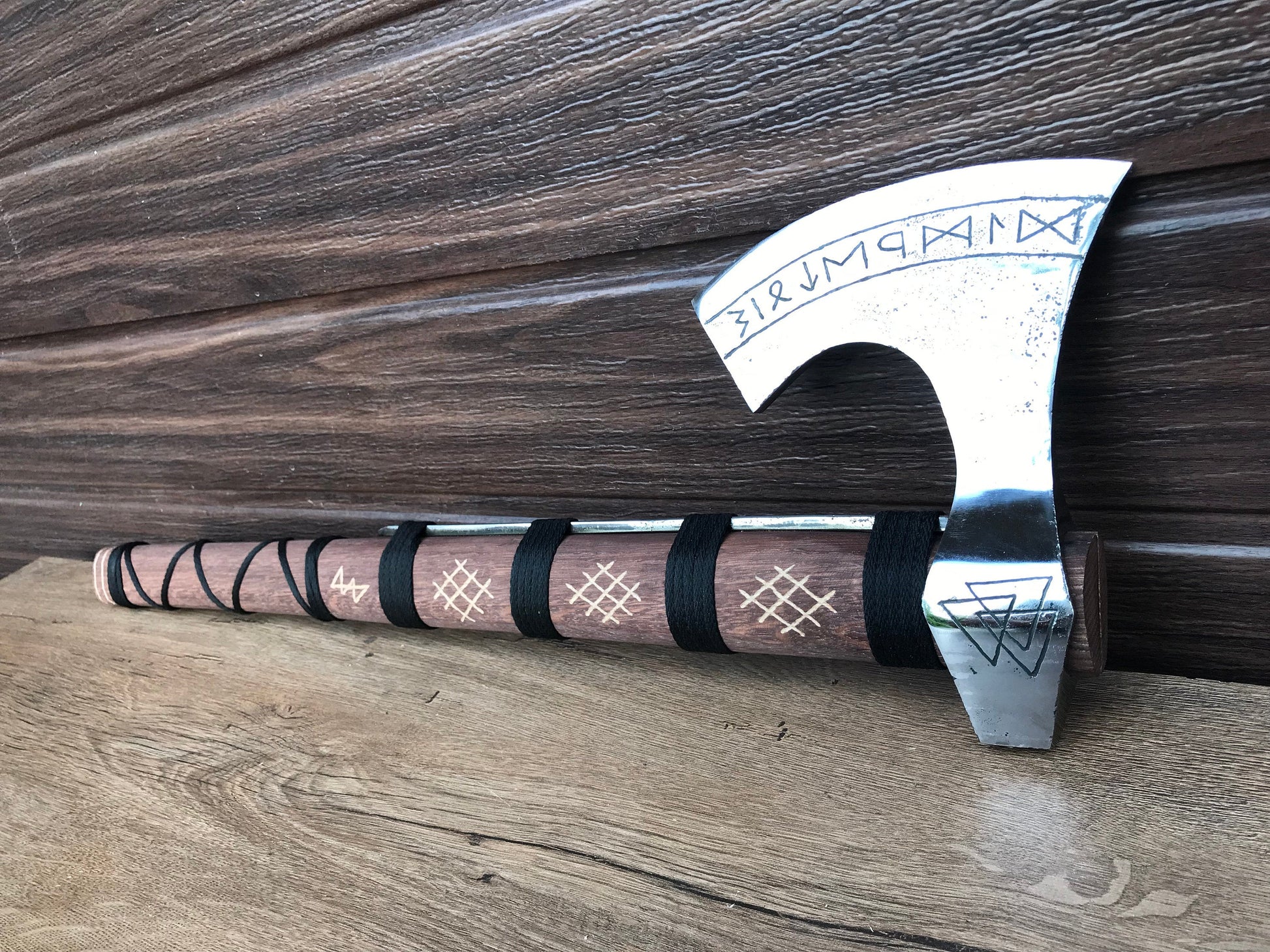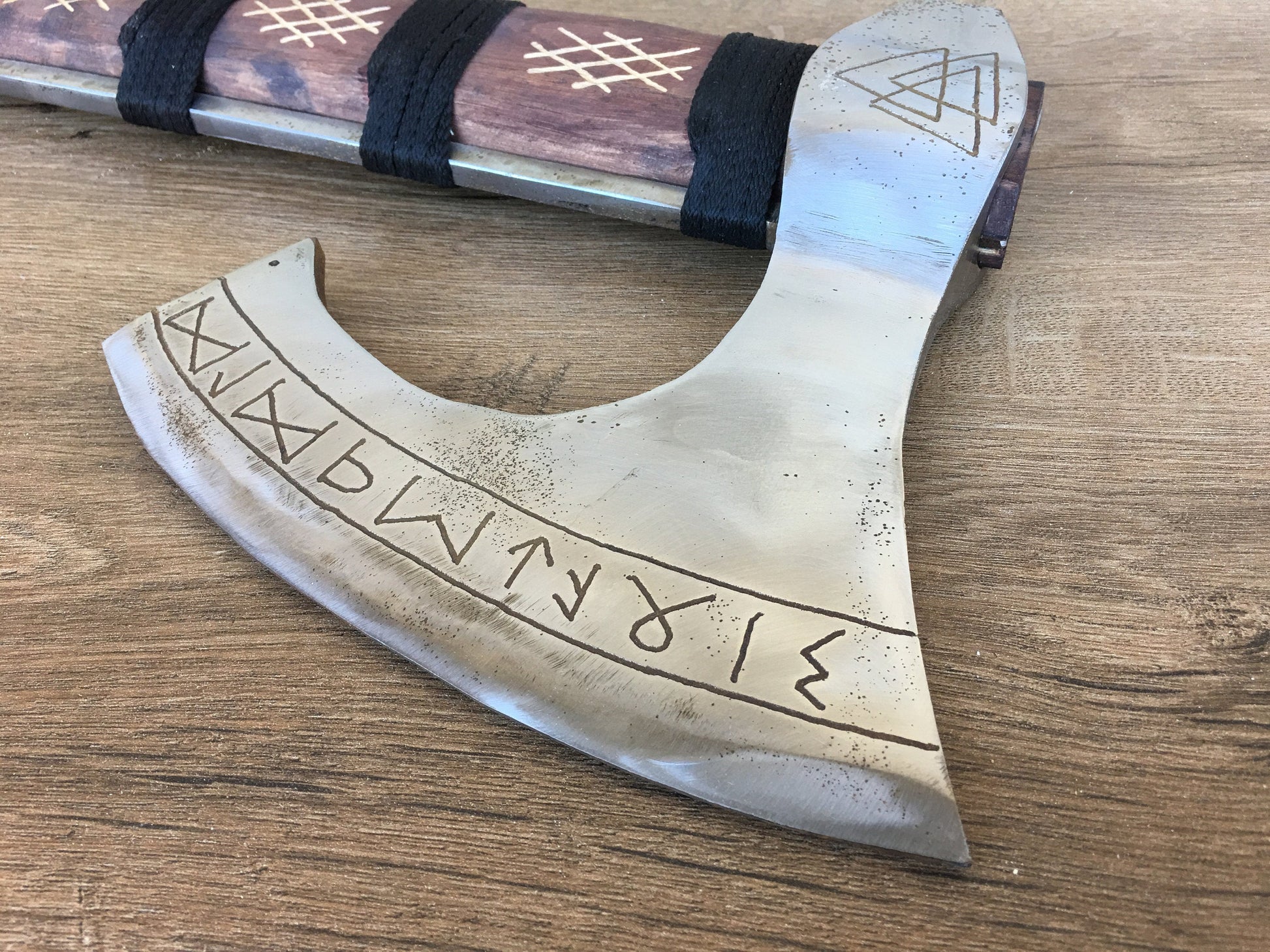 The axe head is done very decoratively, engraved with both sides of the handle and the axe head.
